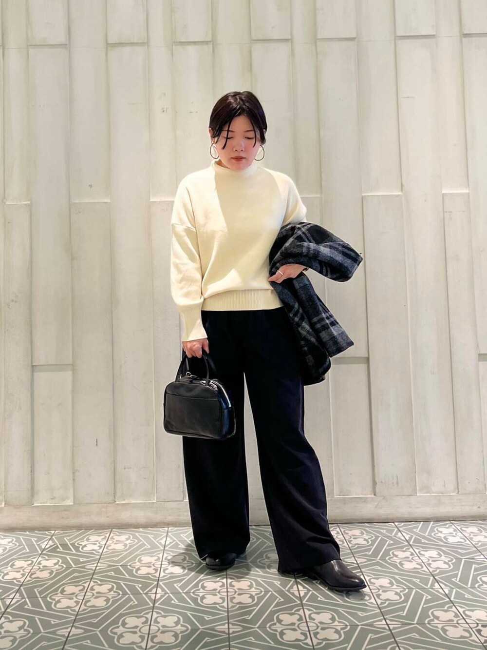 ニットは、ボトルネックのデザインが可愛く太めのリブも女性らしいデザインになっています!着丈は短めなのでワイドパンツやスカートと合わせるのがオススメです!
