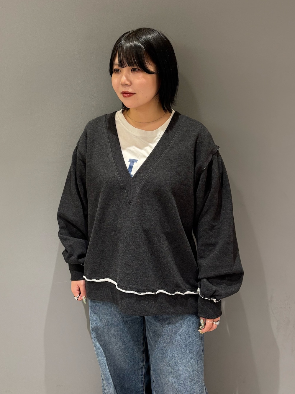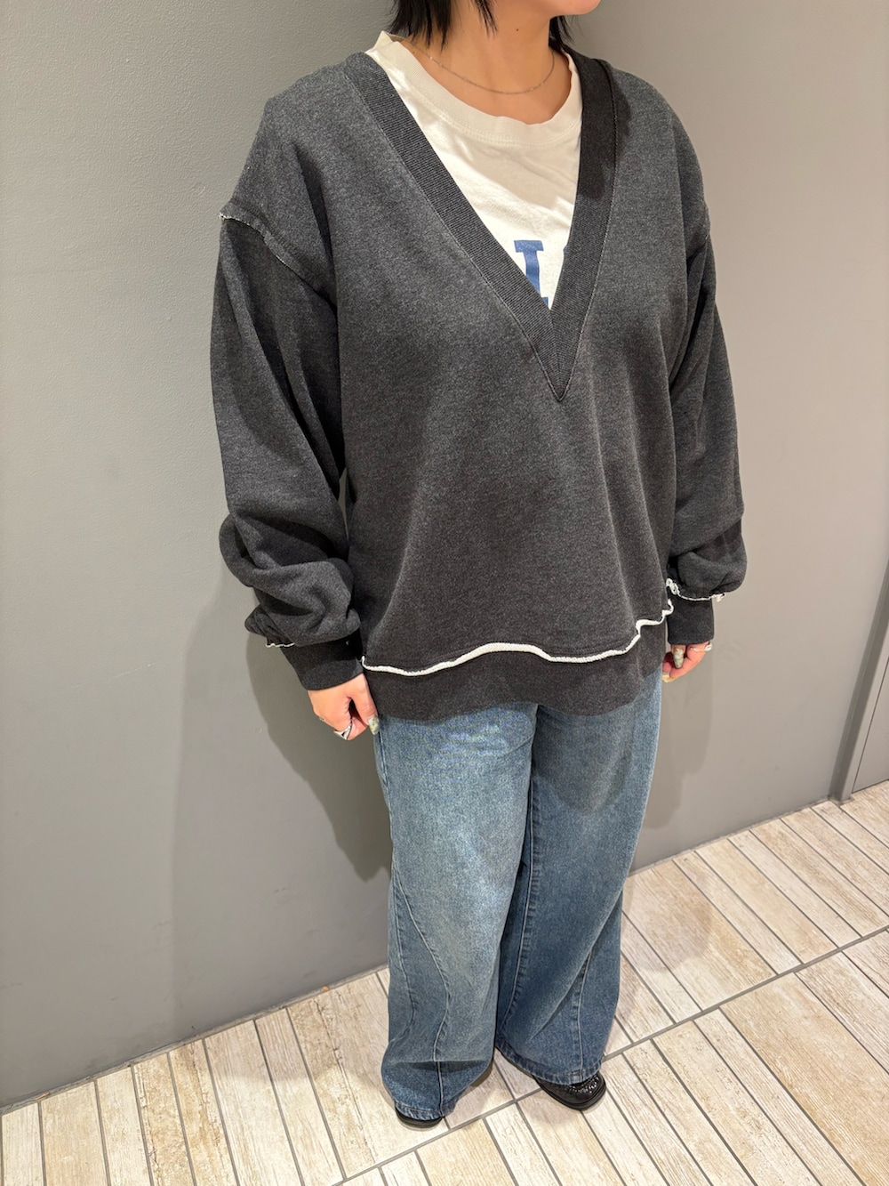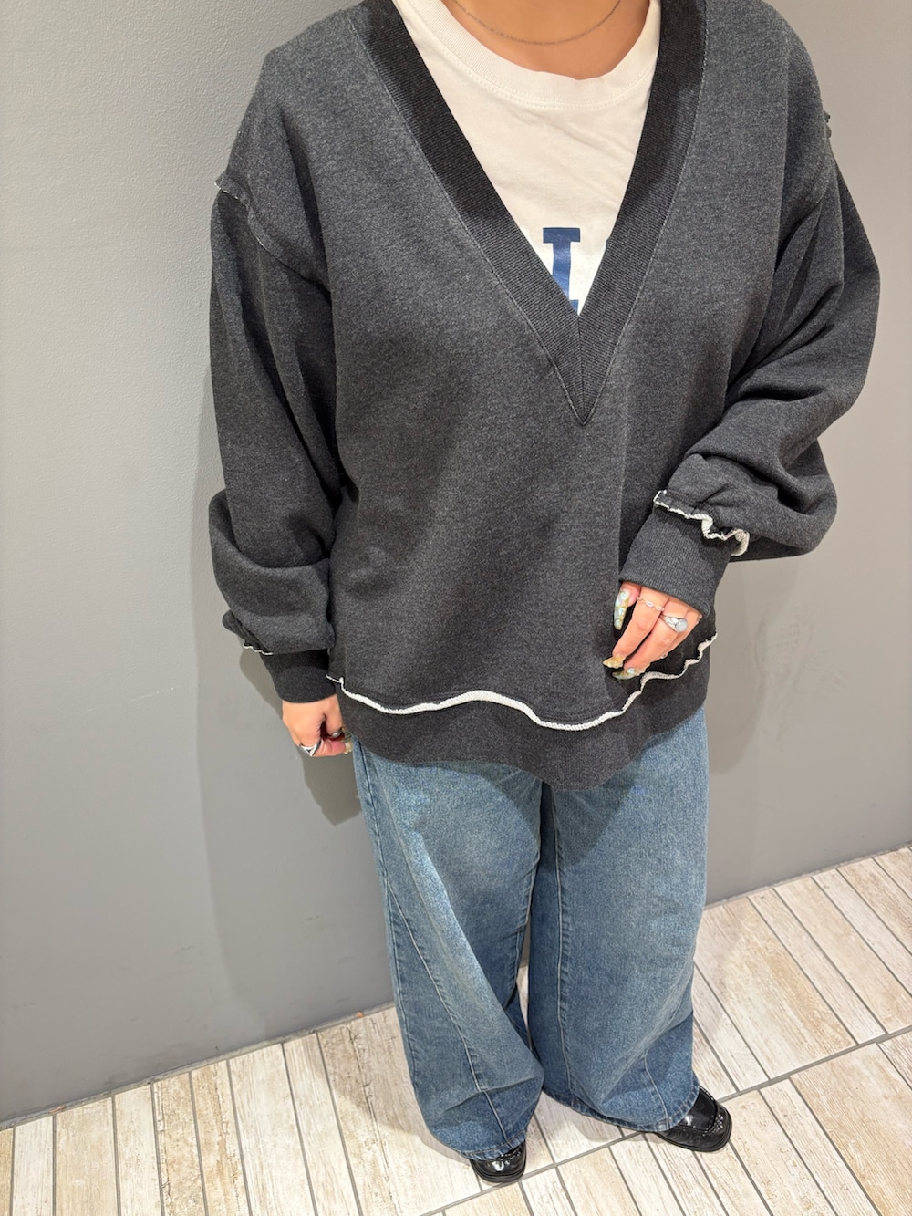 Vネックとクルーネックどちらでも使える前後2WAY仕様とゆるっとしたオーバーサイズが可愛いスウェットです!袖や裾が切りっぱなしのデザインなのも可愛くて🙆🏻♀️