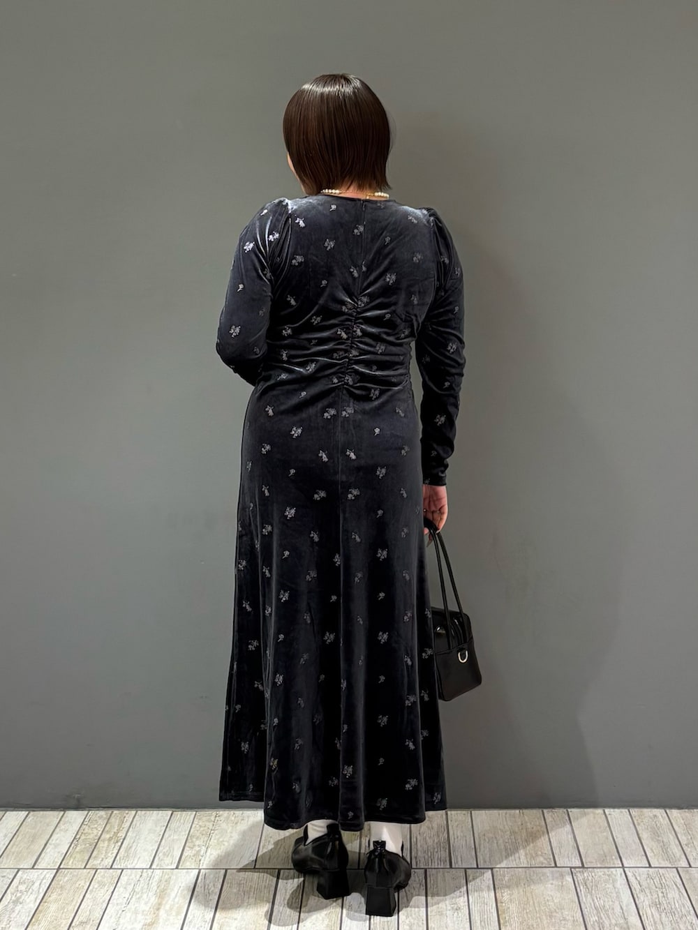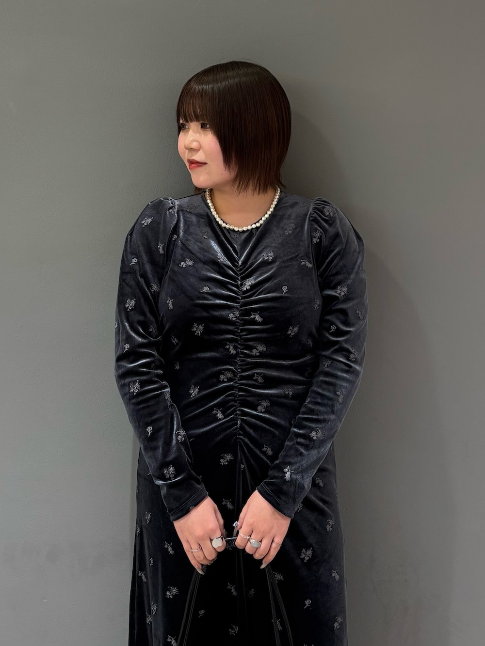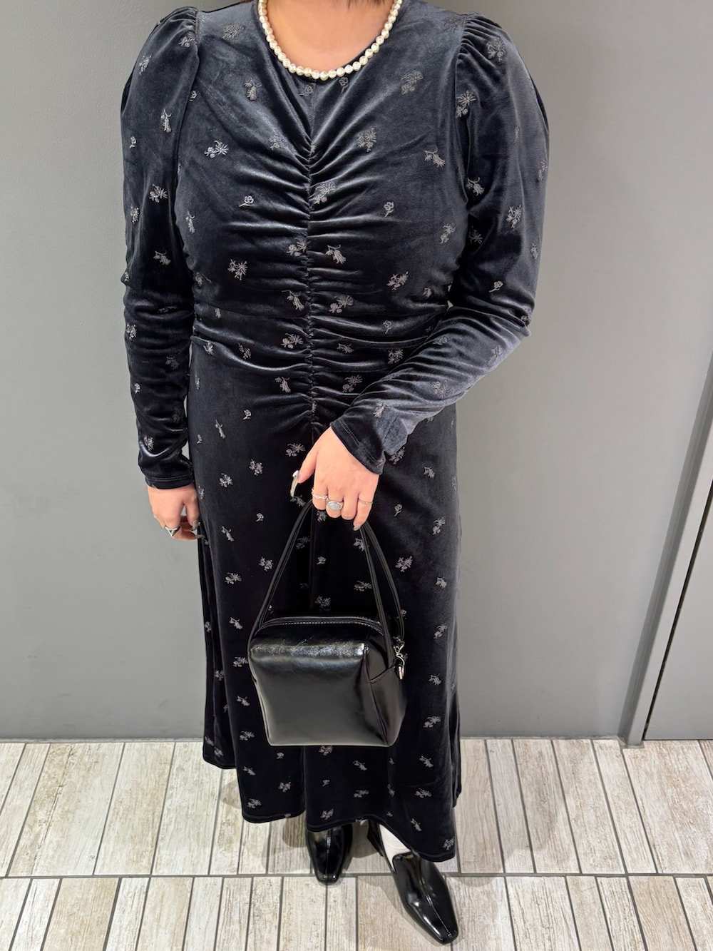 両サイドと胸元に大胆に施されたシャーリングが女性らしさを演出してくれ、ベロア素材でトレンドも取り入れた1着に︎︎𓂃⟡.·