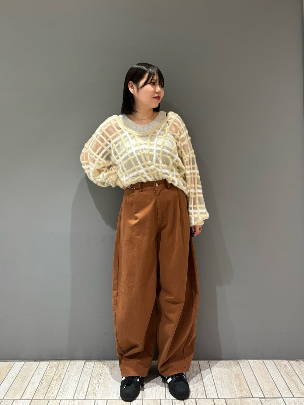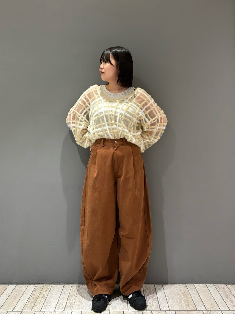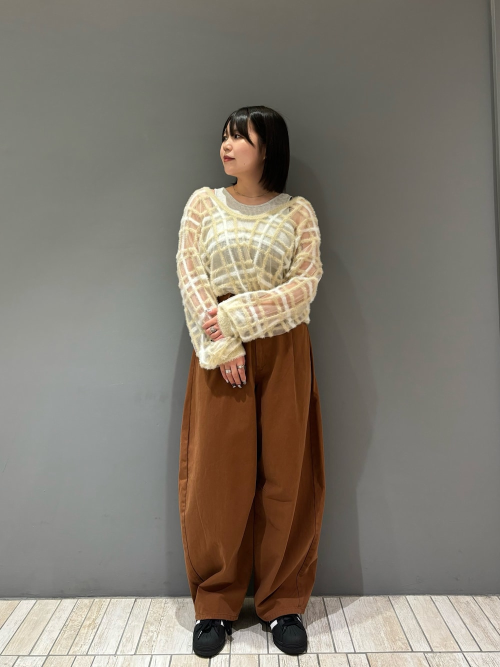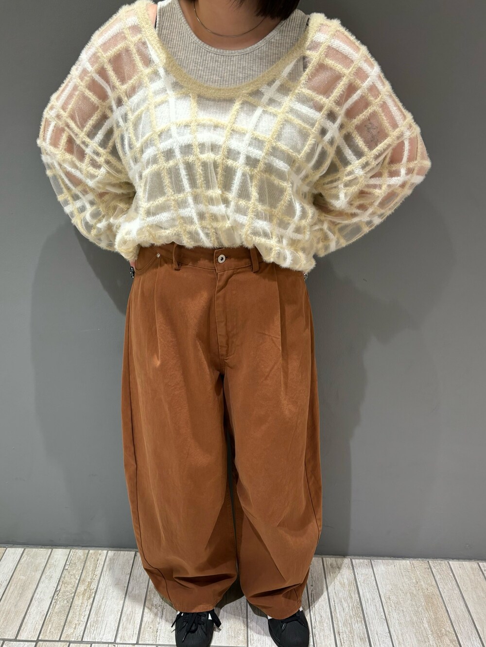 今回は、シアーチェックフェザーニット、RIBタンクトップ、ワンタックコクーンパンツを着てみました!
