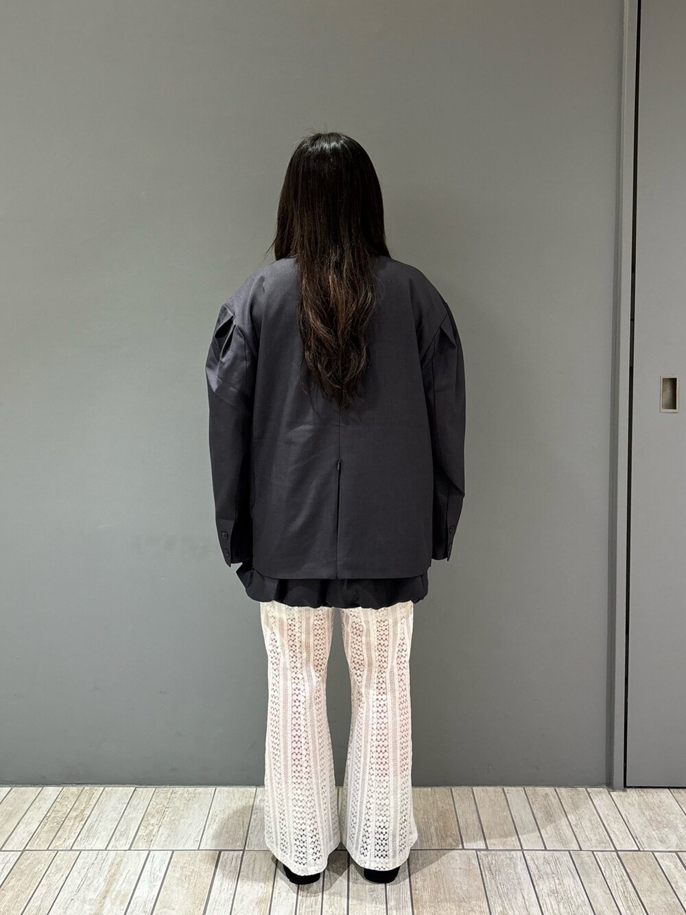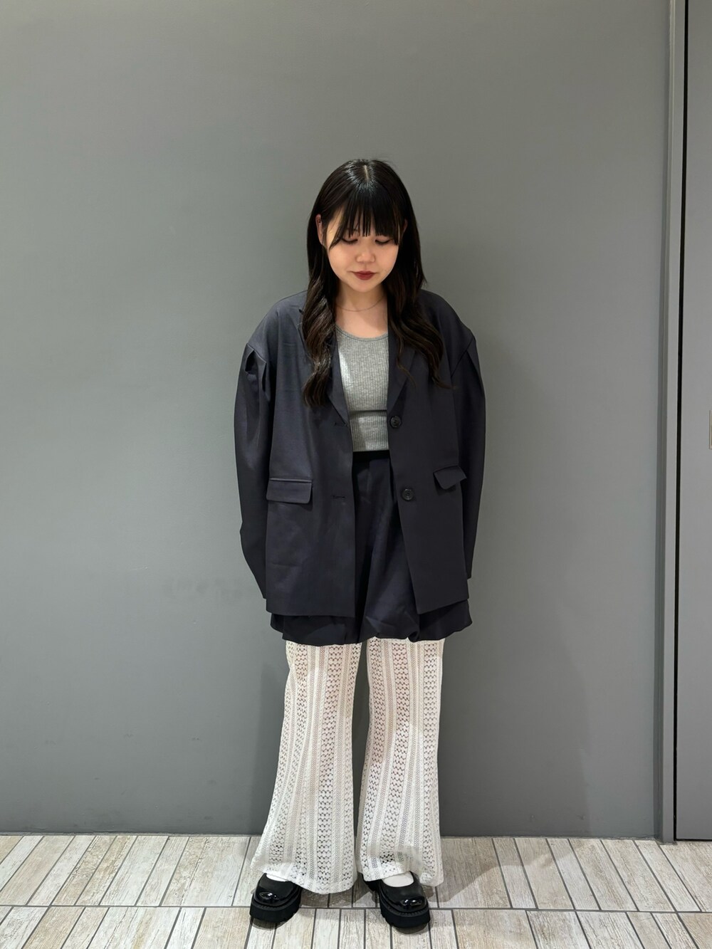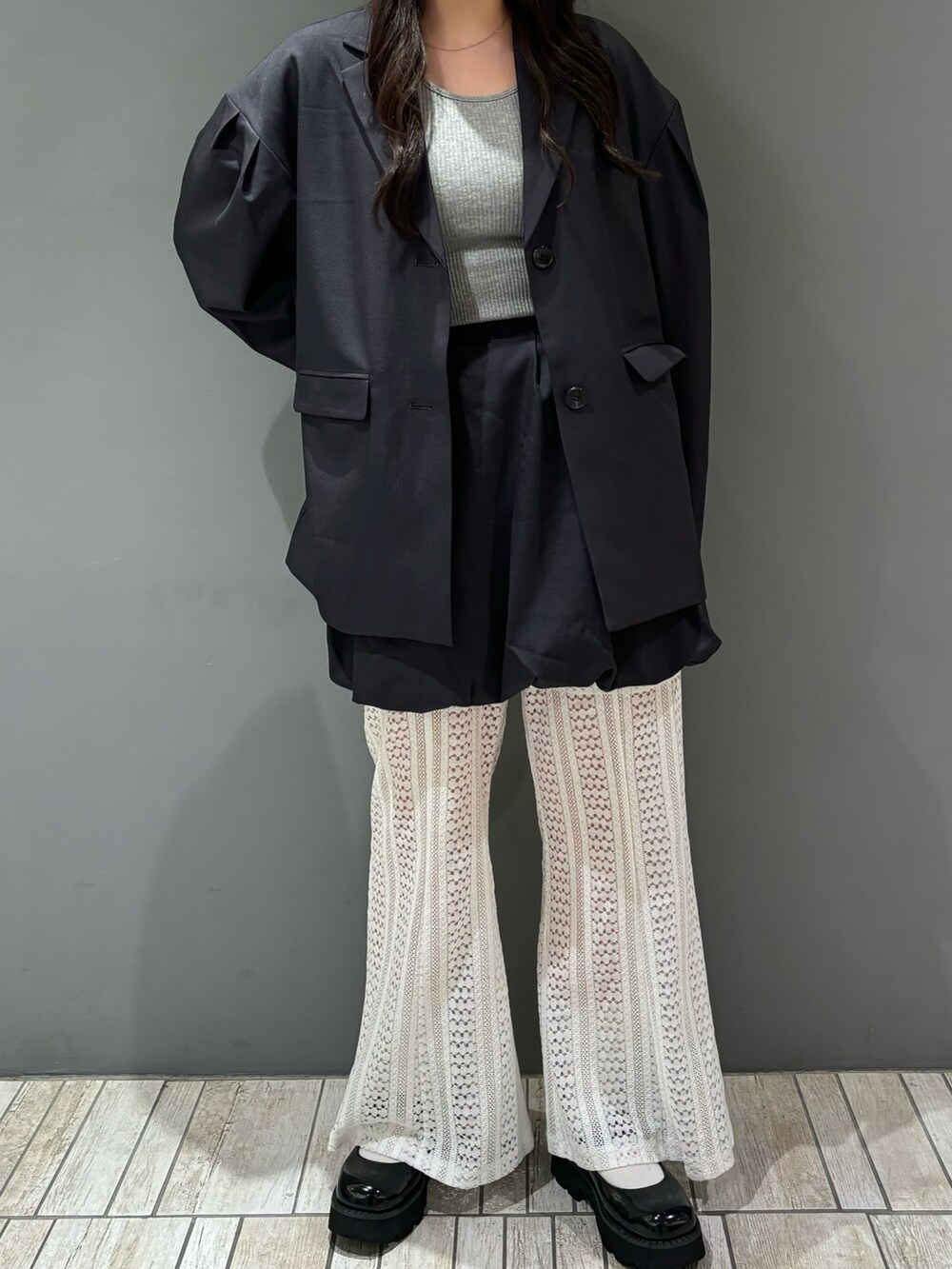 今回は、RIBタンクトップ、ショルダータックBIGジャケット、バルーンミニスカート、レースフレアパンツを着てみました!
