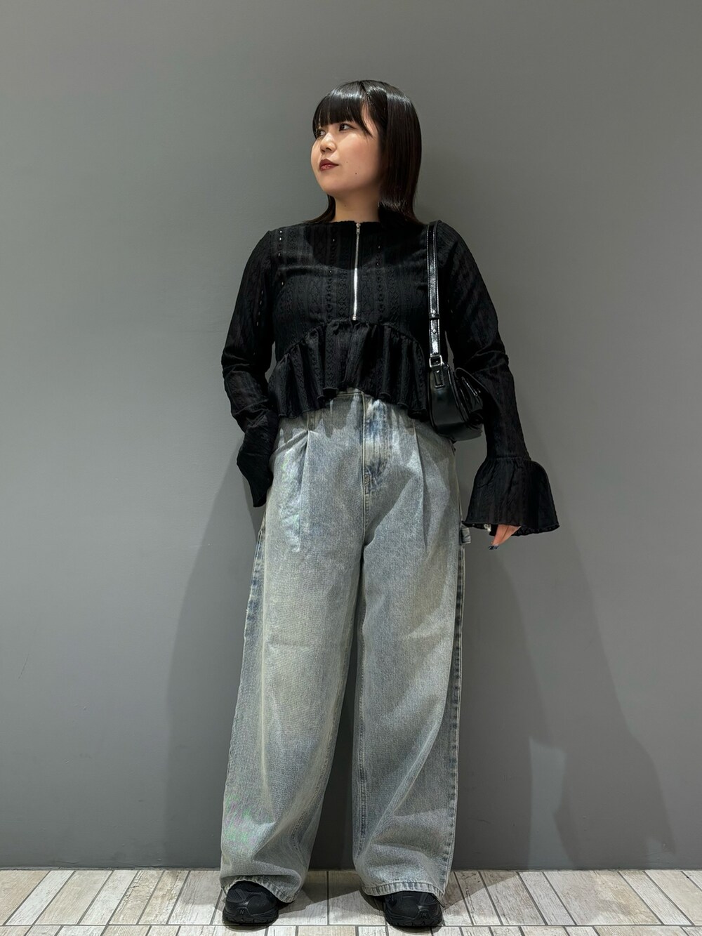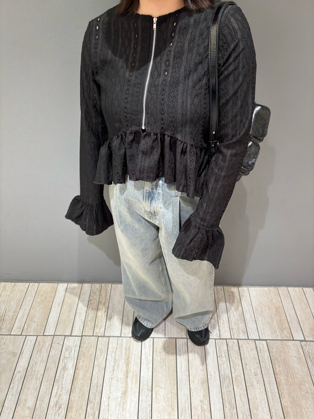 ペプラムデザインが可愛い新作のアイテムです🖤ペプラムデザインになっているので、ウエストから下のレースの広がり具合や袖のフリルの感じが可愛いです!フロントがジップになっているのも韓国っぽくて推しポイントです👍🏻