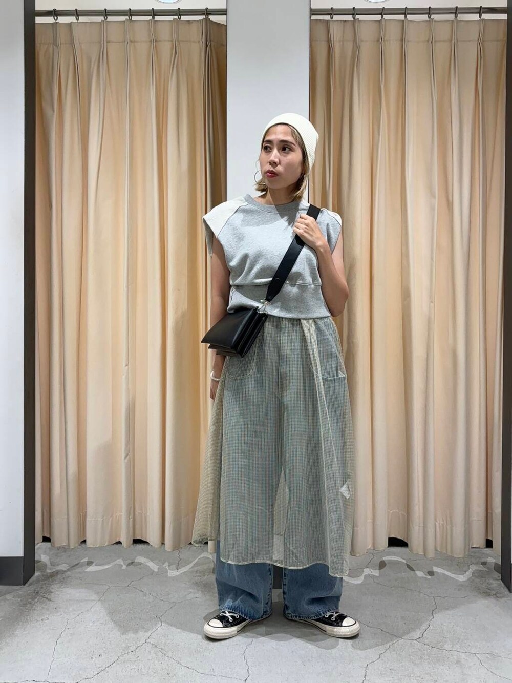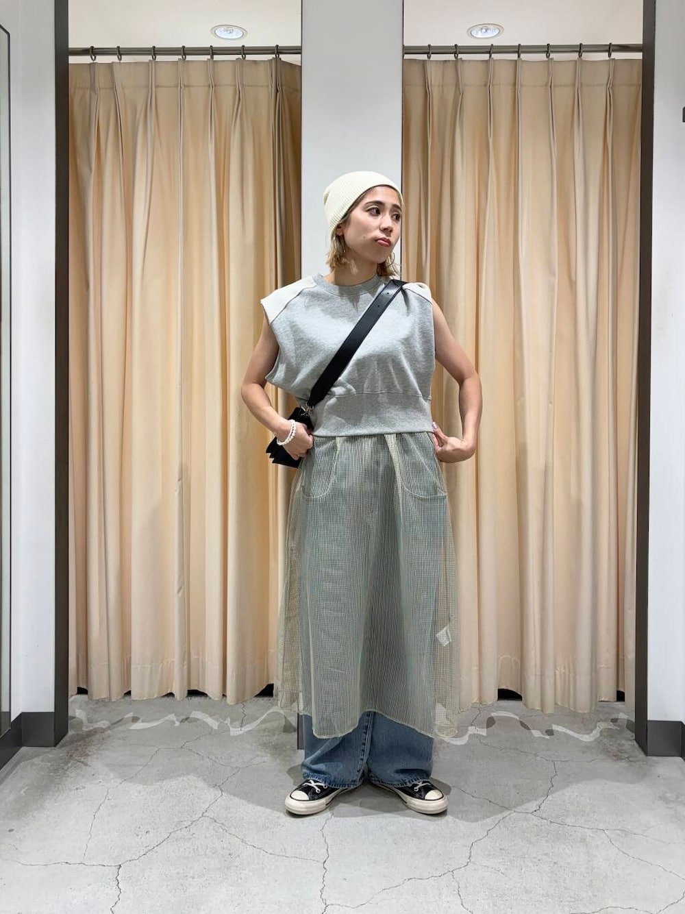 ショルダータックスウェットとシアーチェックキャミワンピースとBIGポケットデザインデニムを着用しました♪