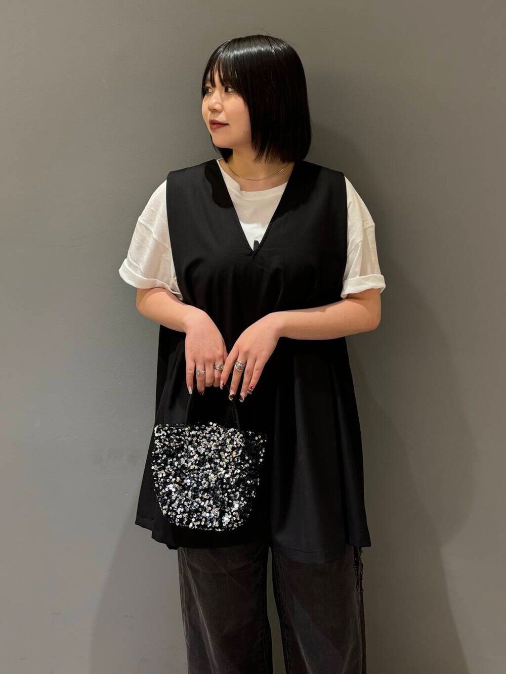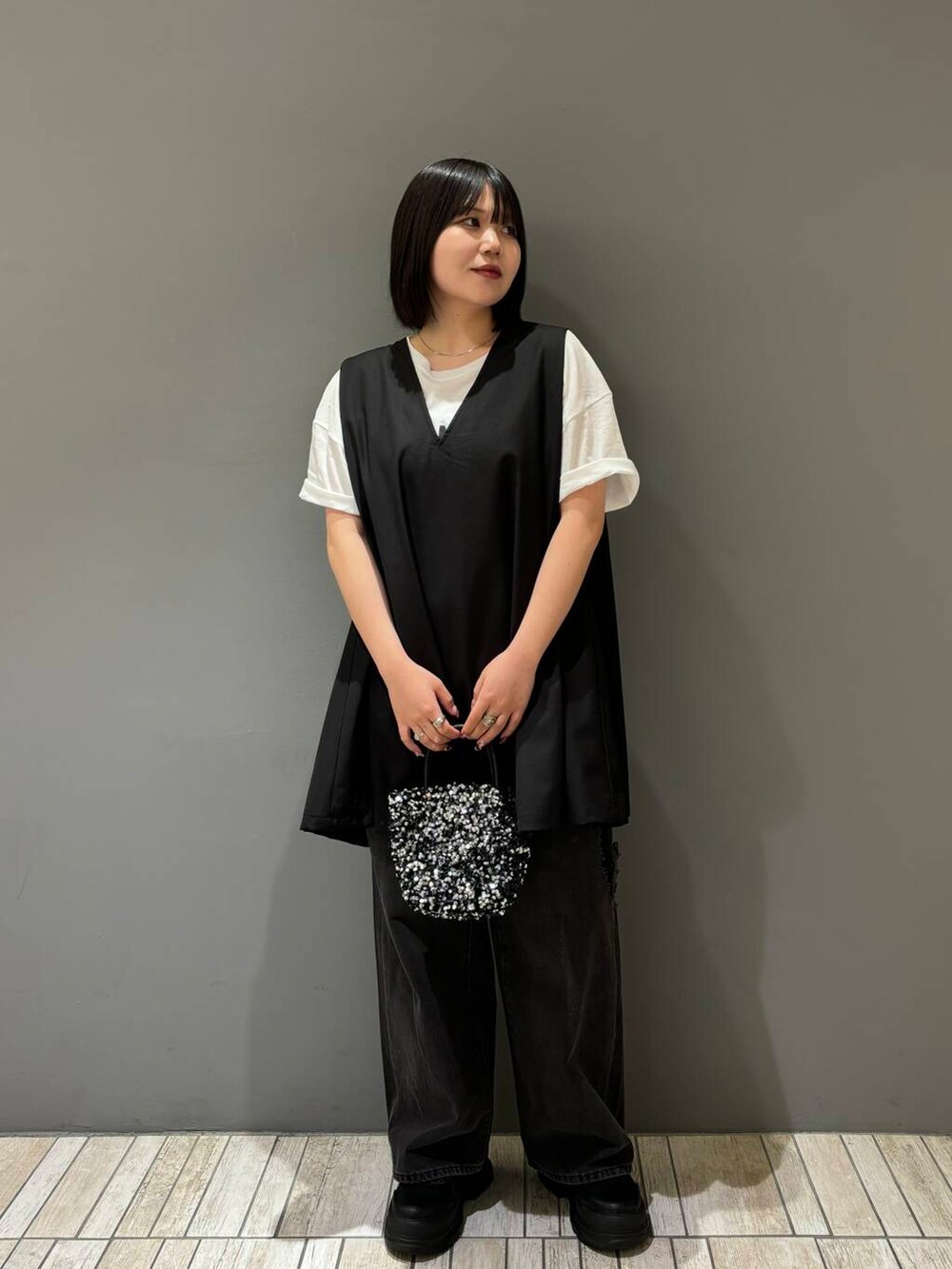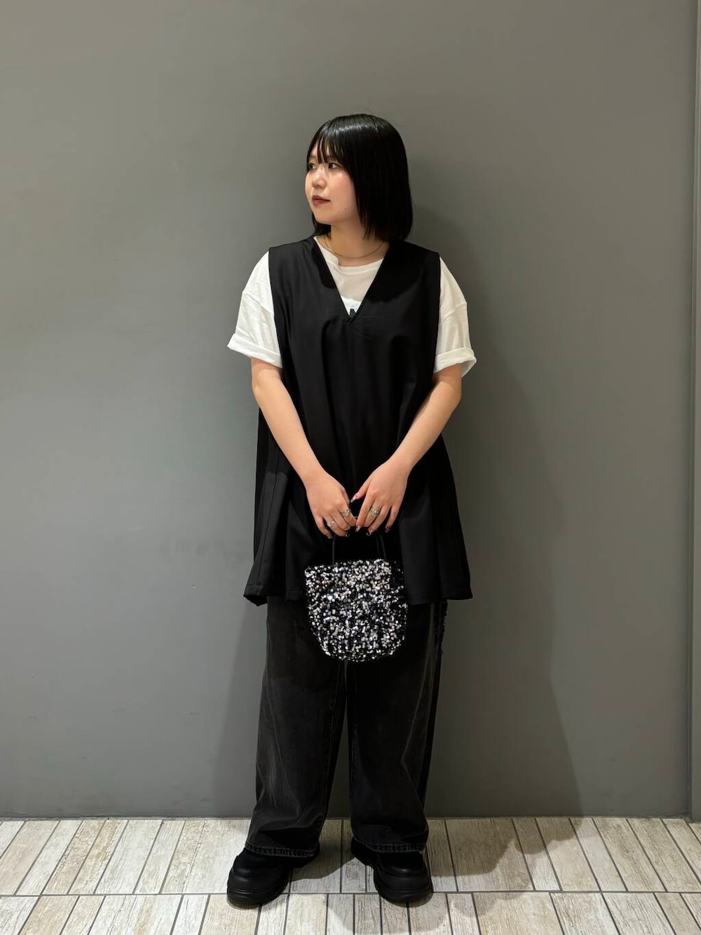 今回は、シアープリントBIGTEE、ショルダータックミニワンピース、ダメージウォッシングデニム、チェーン付きスパンコールバッグを着てみました!