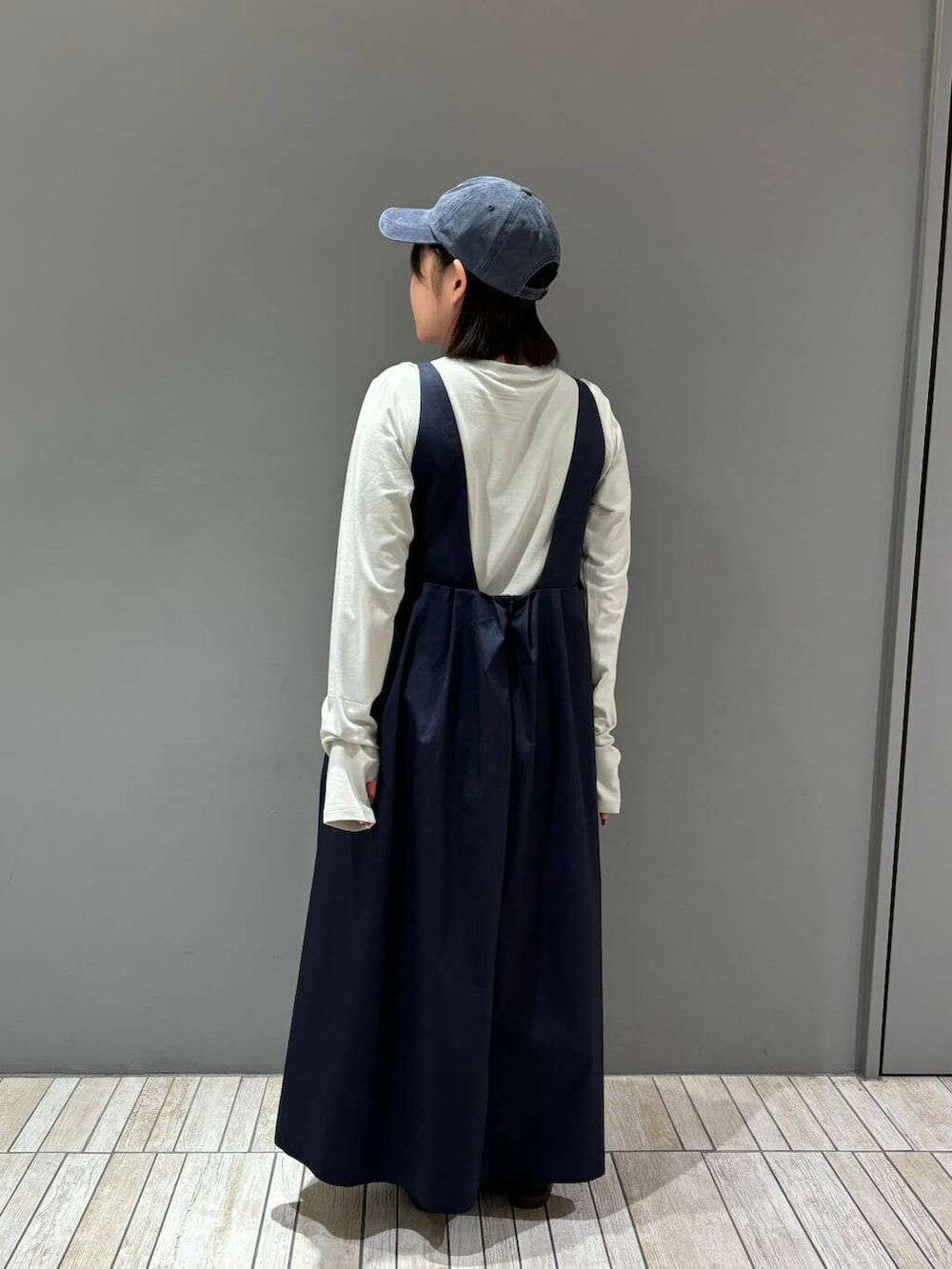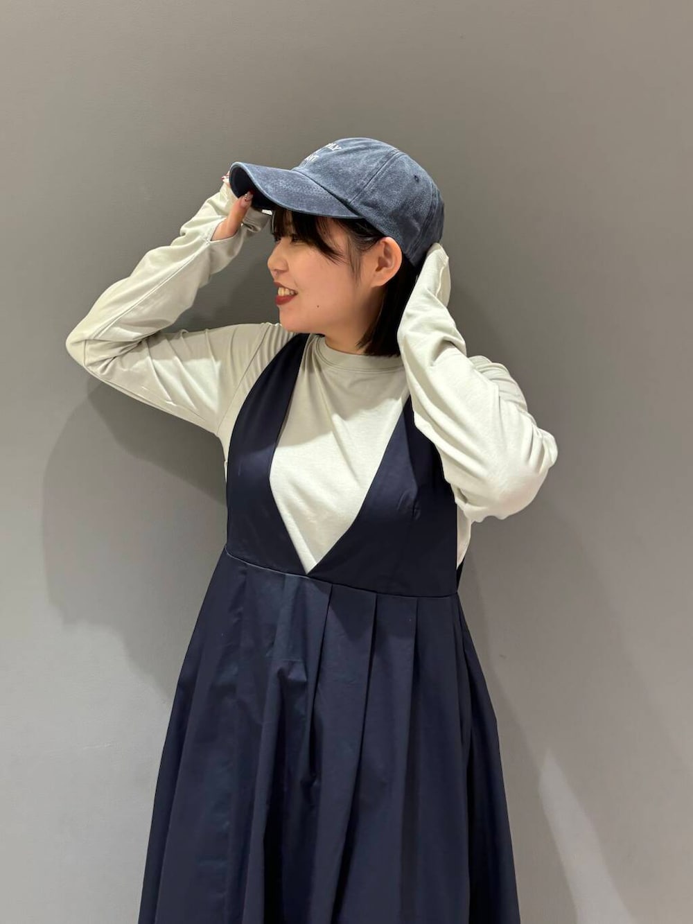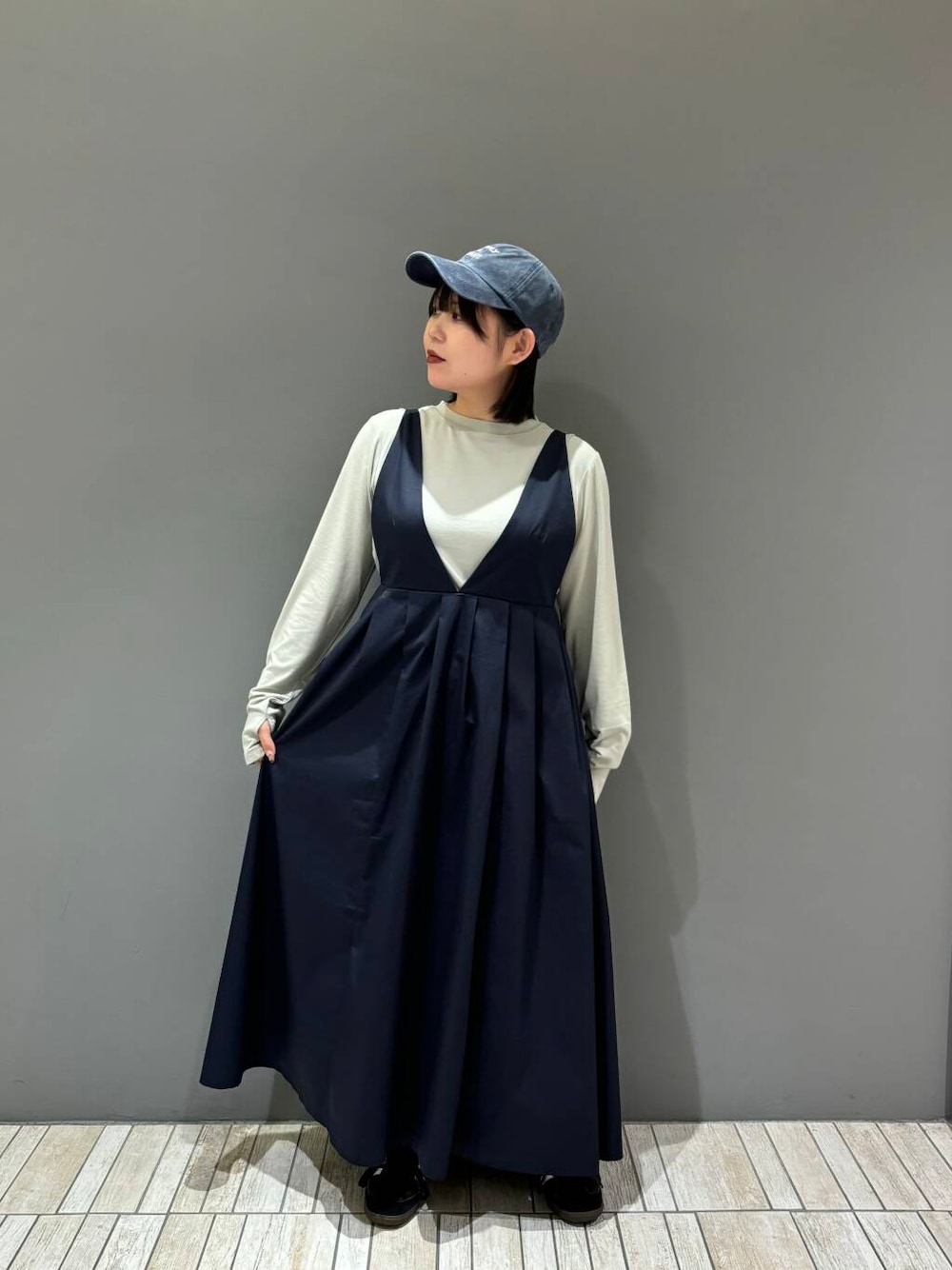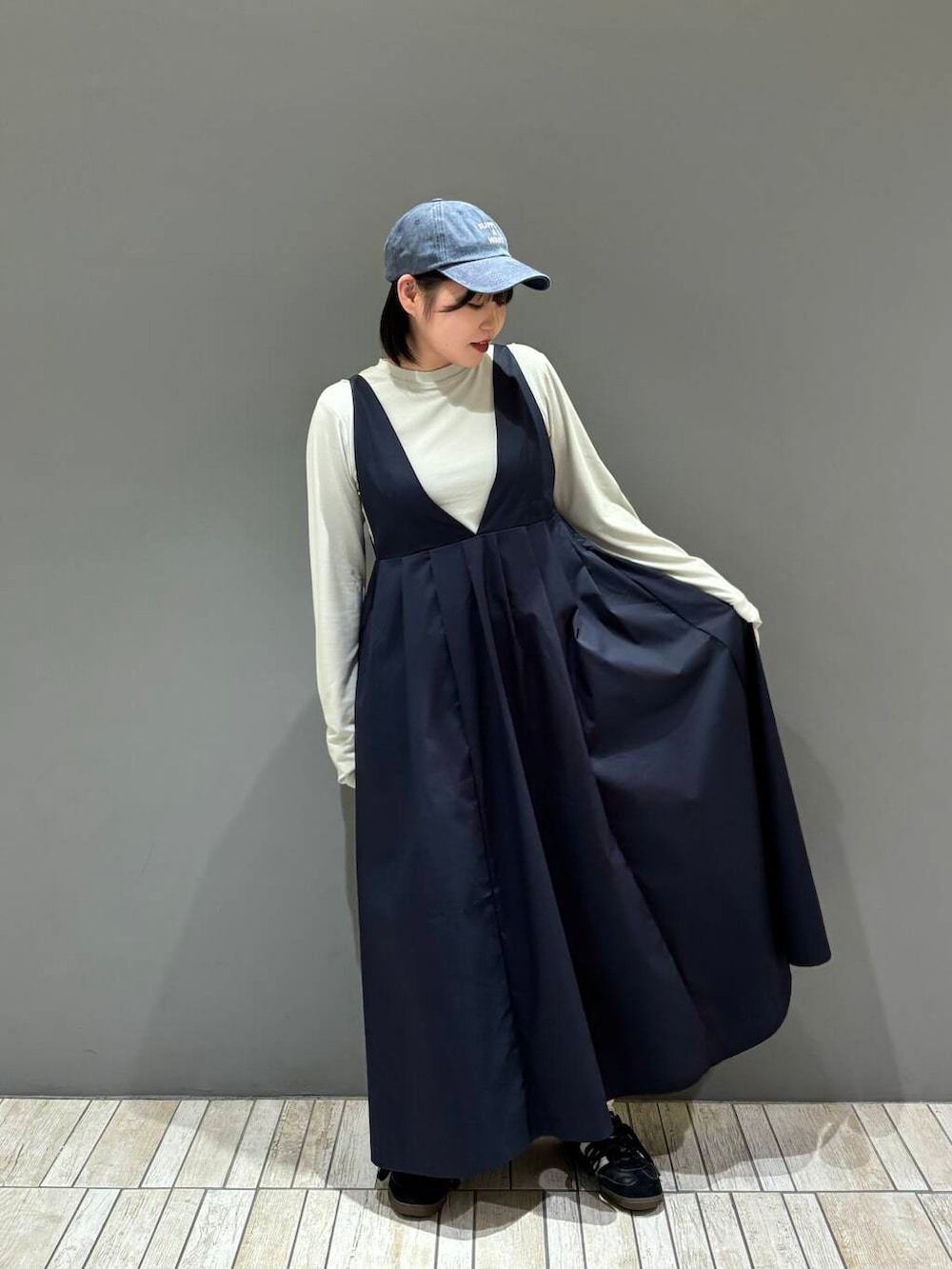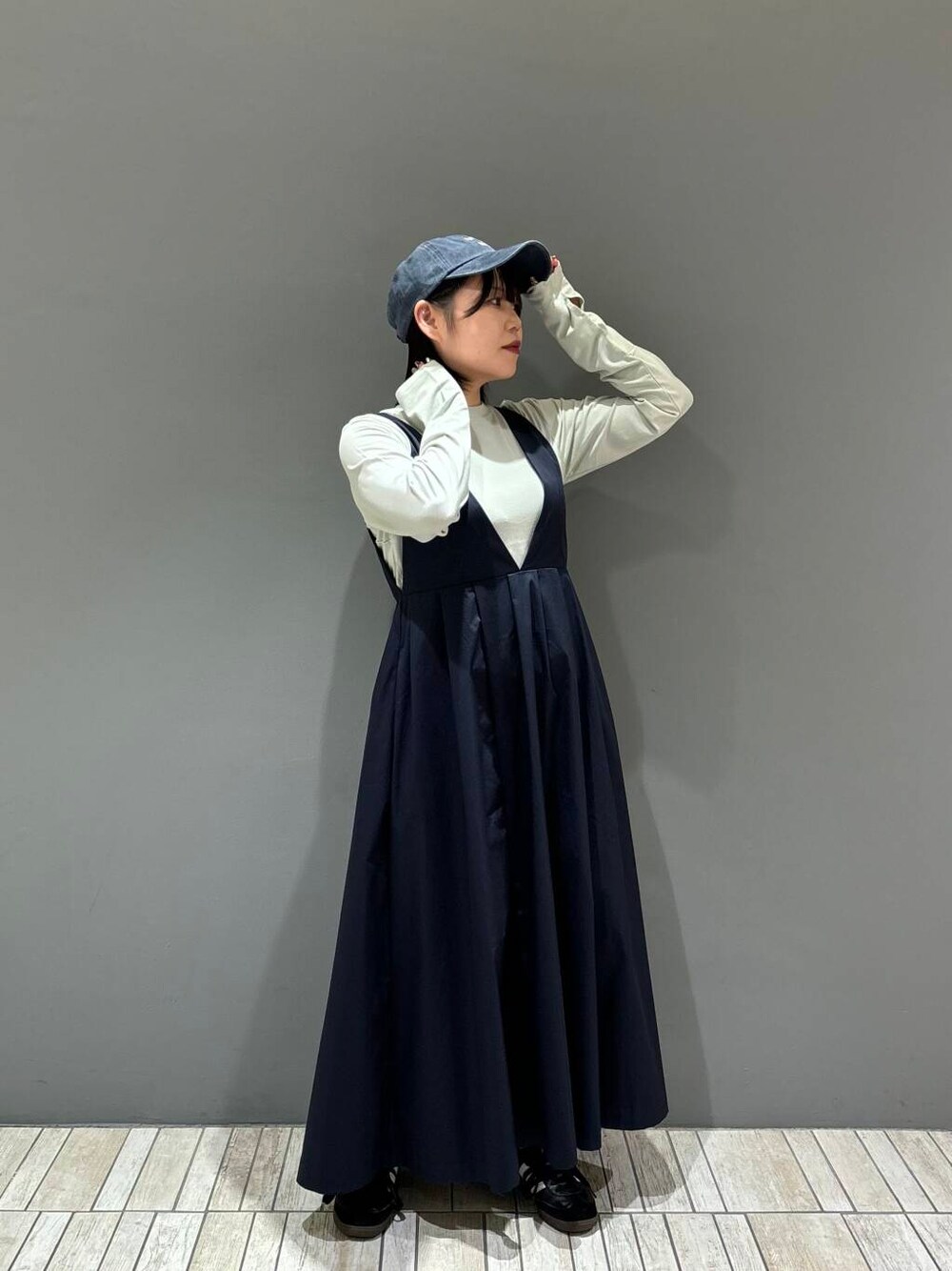 今回は、ピンタックロングスリーブTEE、ディープネックジャンパースカート、ウォッシュドロゴキャップを着てみました!