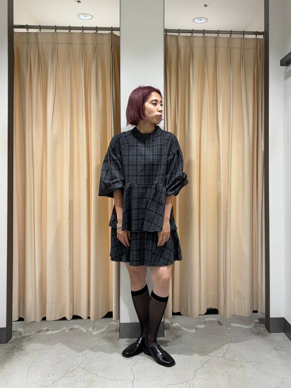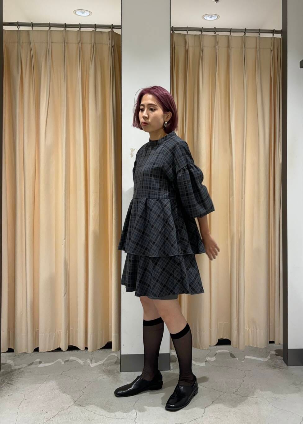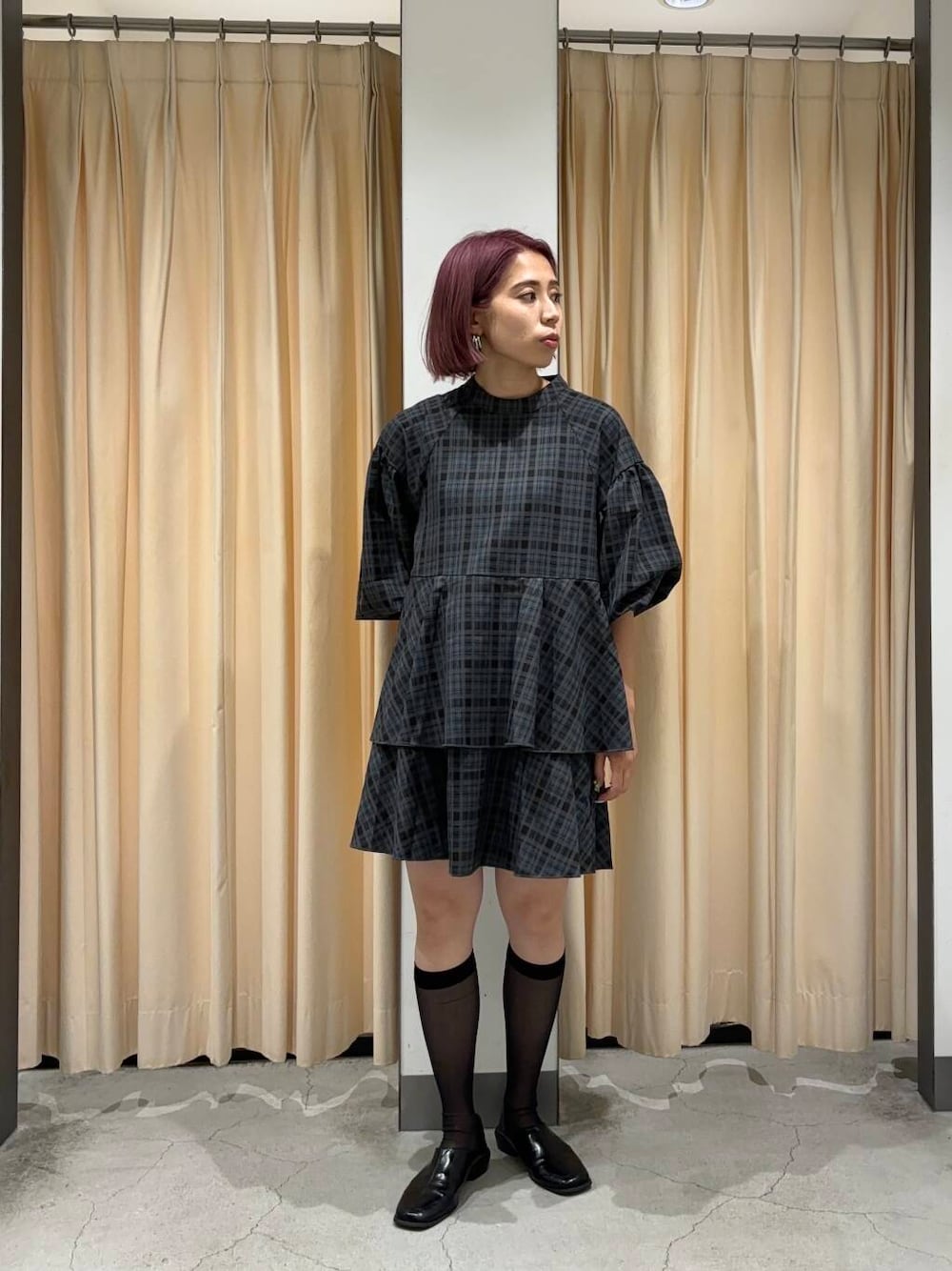 ティアードチェックミニワンピースと私物のショートパンツをしました♪