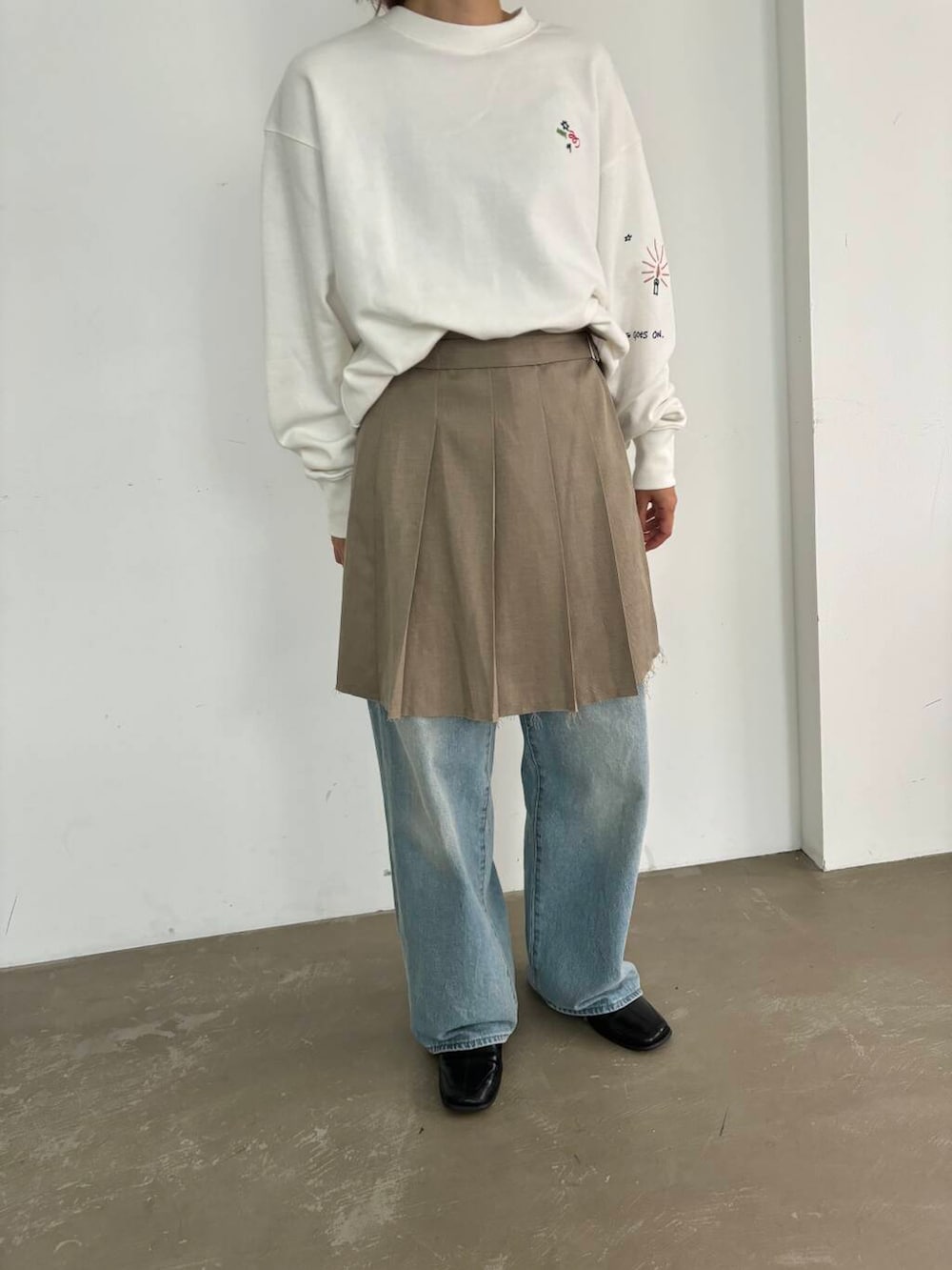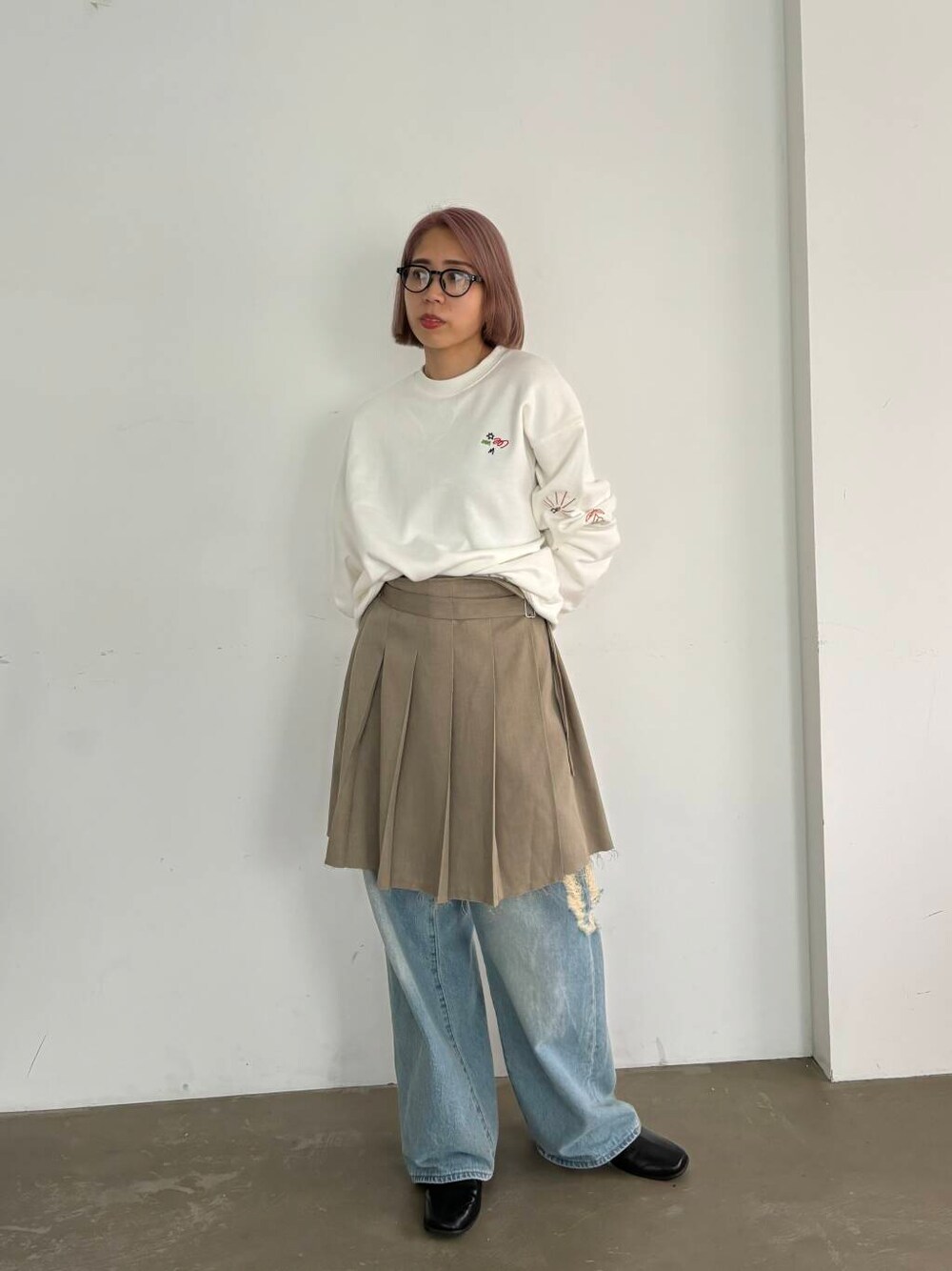 プリーツスカートSETサロペットのプリーツスカートとエンブロイダリースウェットとダメージウォッシングデニムを着用しました♪