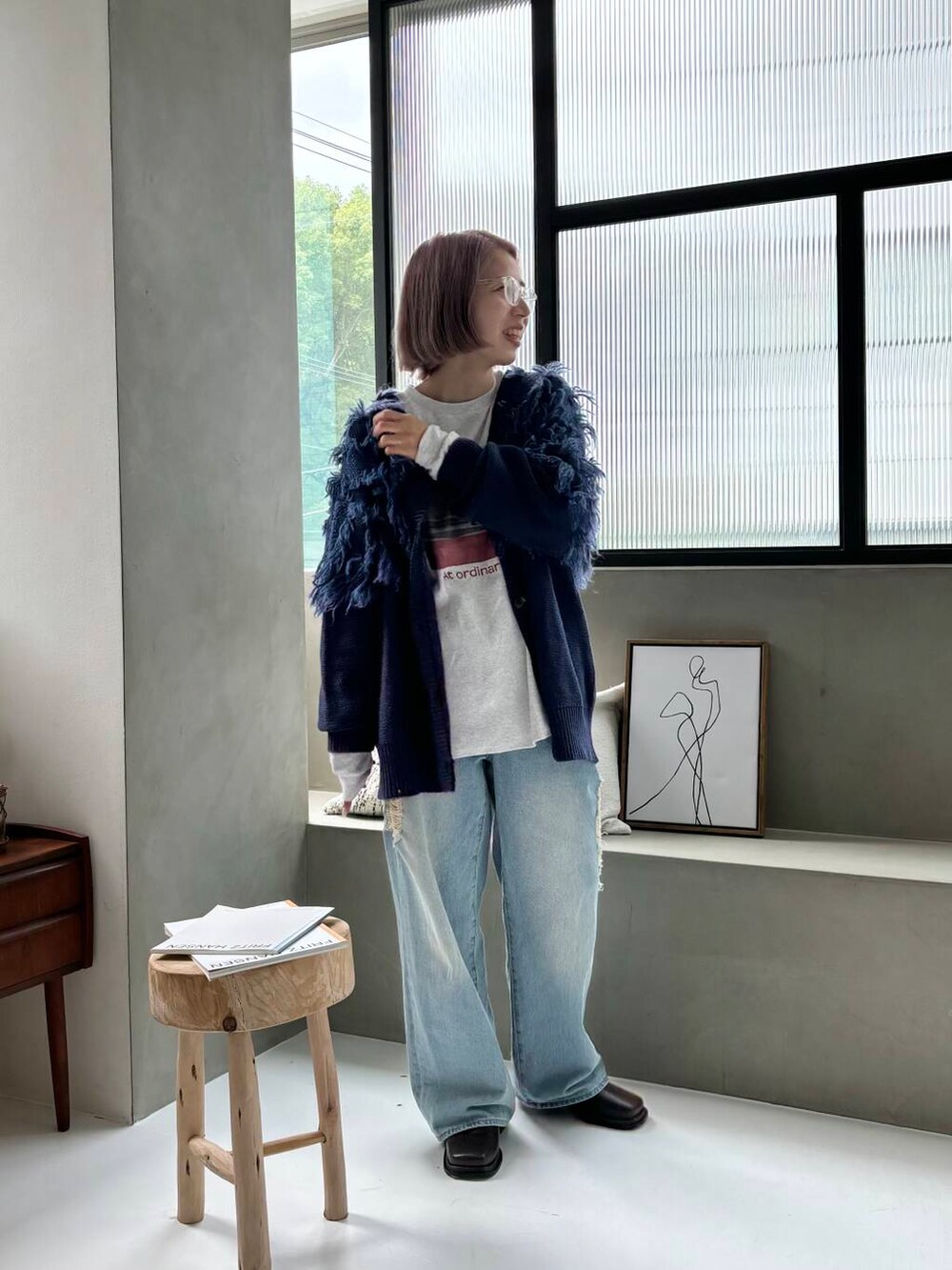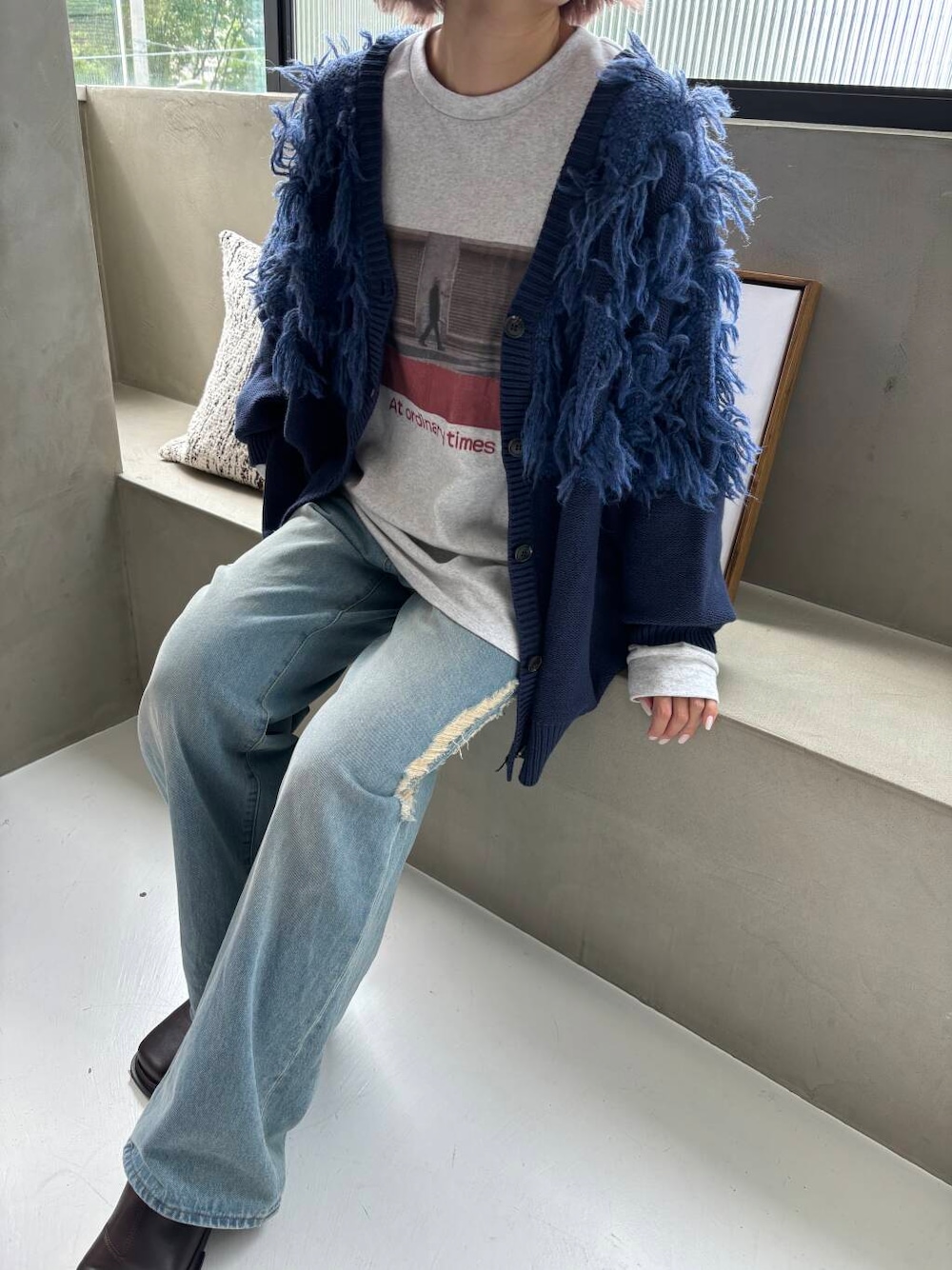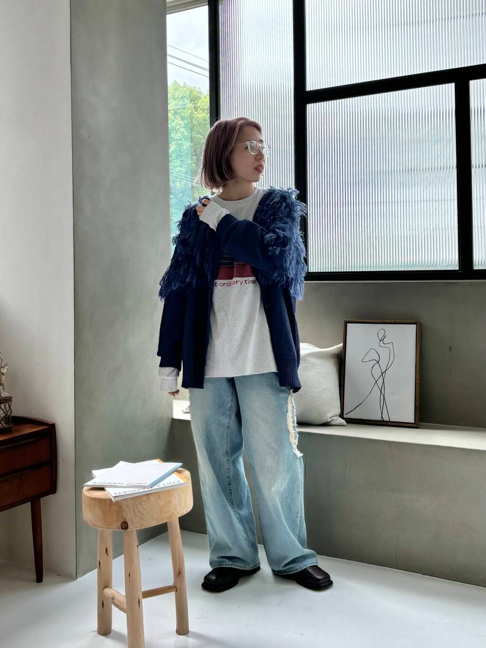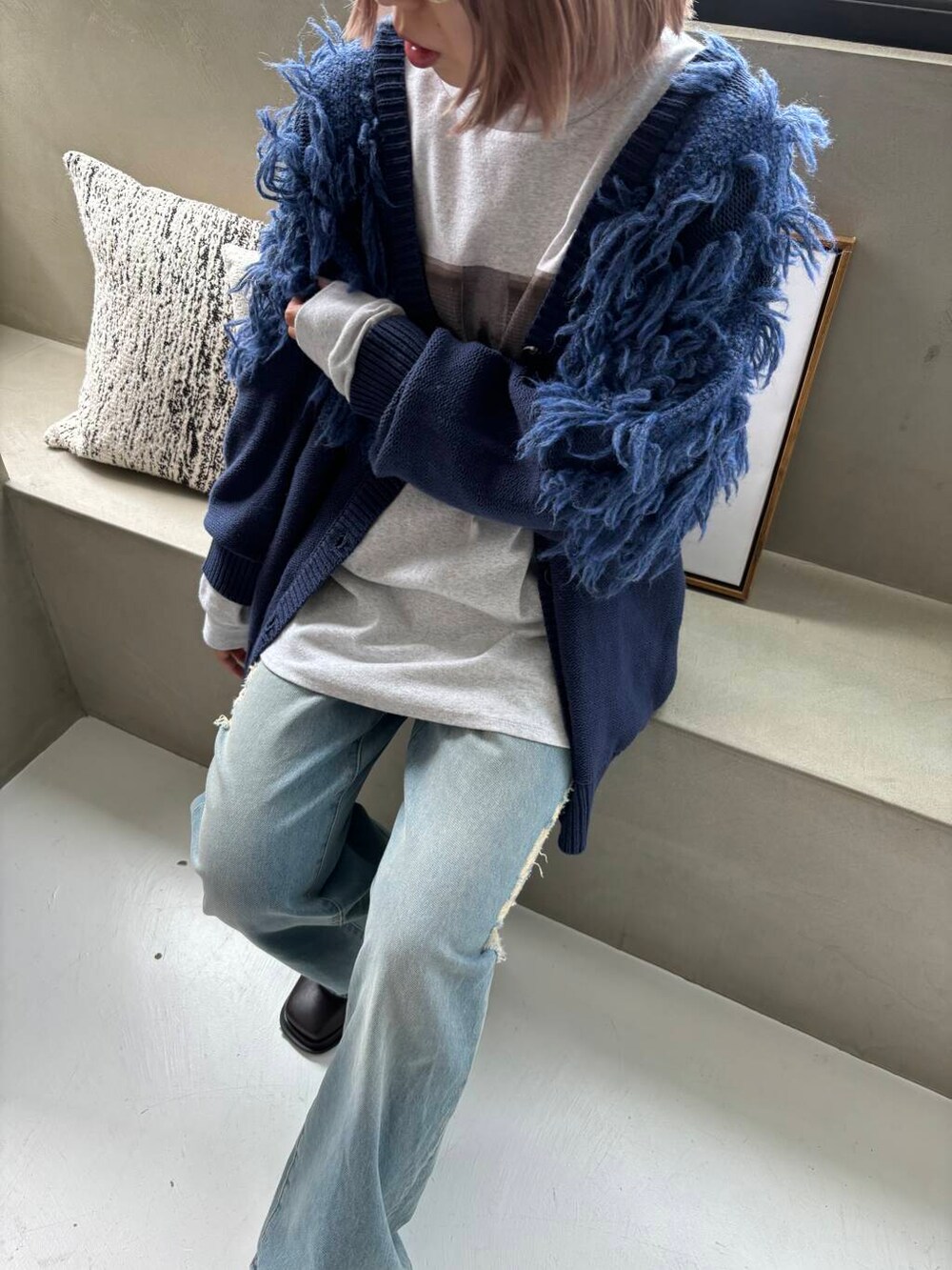 ジャガードフリンジカーディガンとダメージウォッシングデニムを着用しました♪