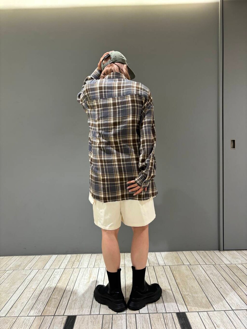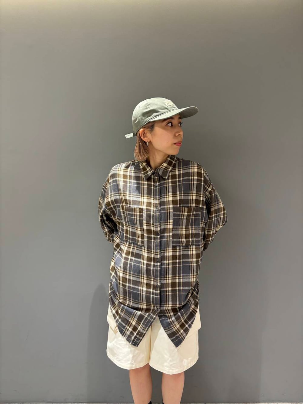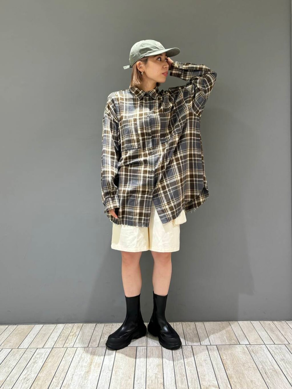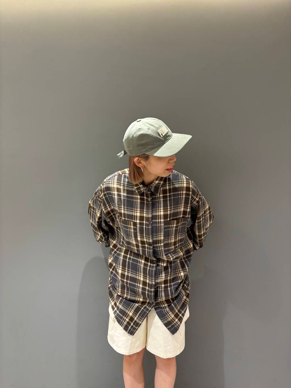 カットオフルーズチェックシャツとフラップポケットショートパンツとプランプエンブロイダリーCAPを合わせて着用しました♪