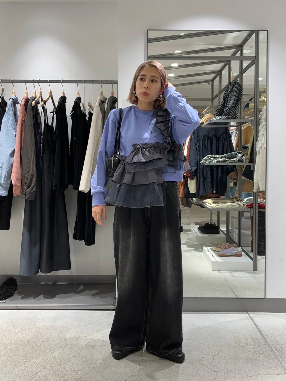 フリルドッキングスウェットとペインターWIDEデニムとチャーム付きロングショルダーBAGを合わせて着用しました♪