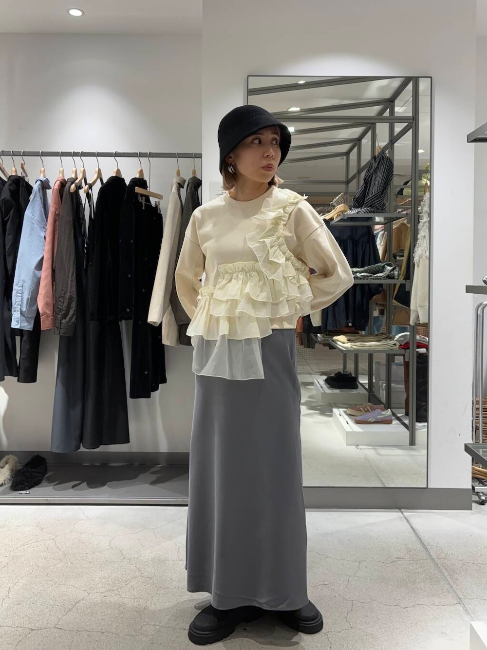 フリルドッキングスウェットとサテンバイアススカートとシャギーベルHATを着用しました♪