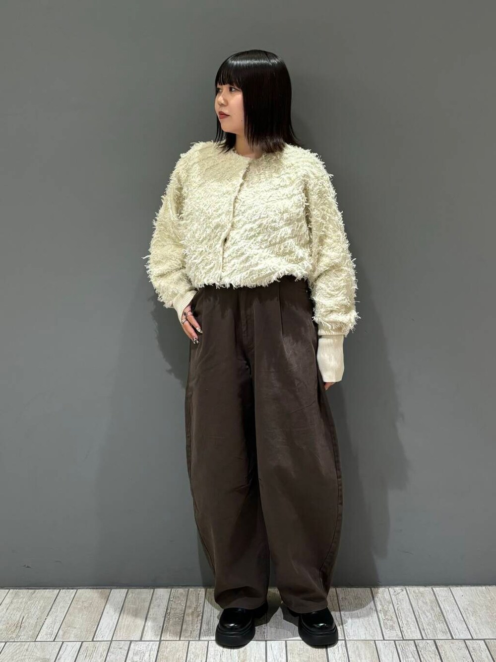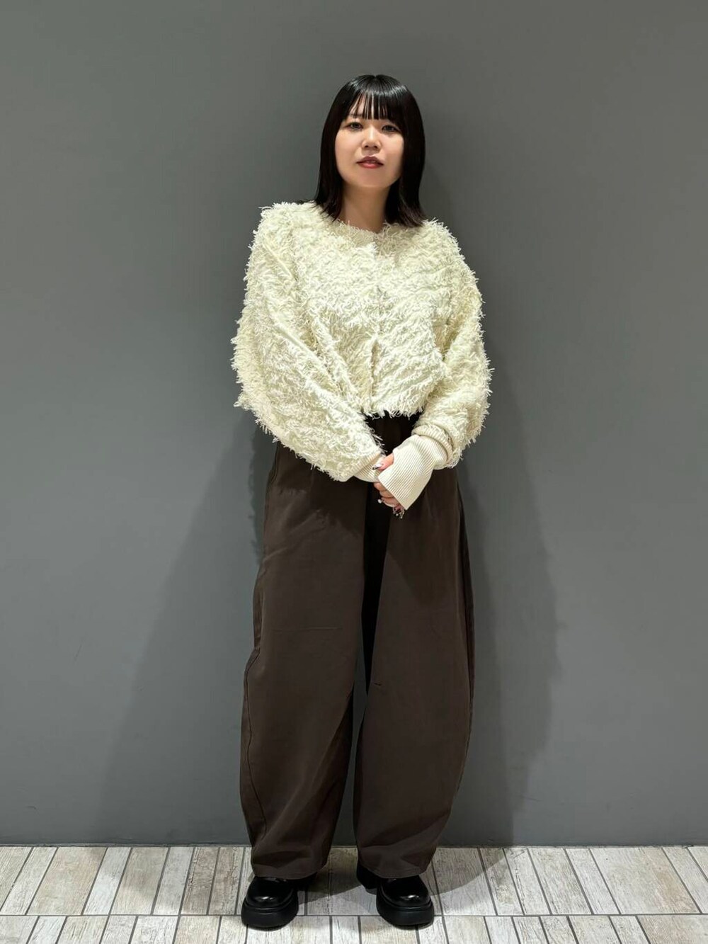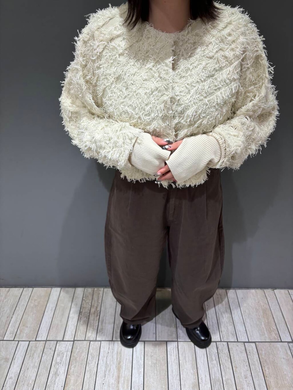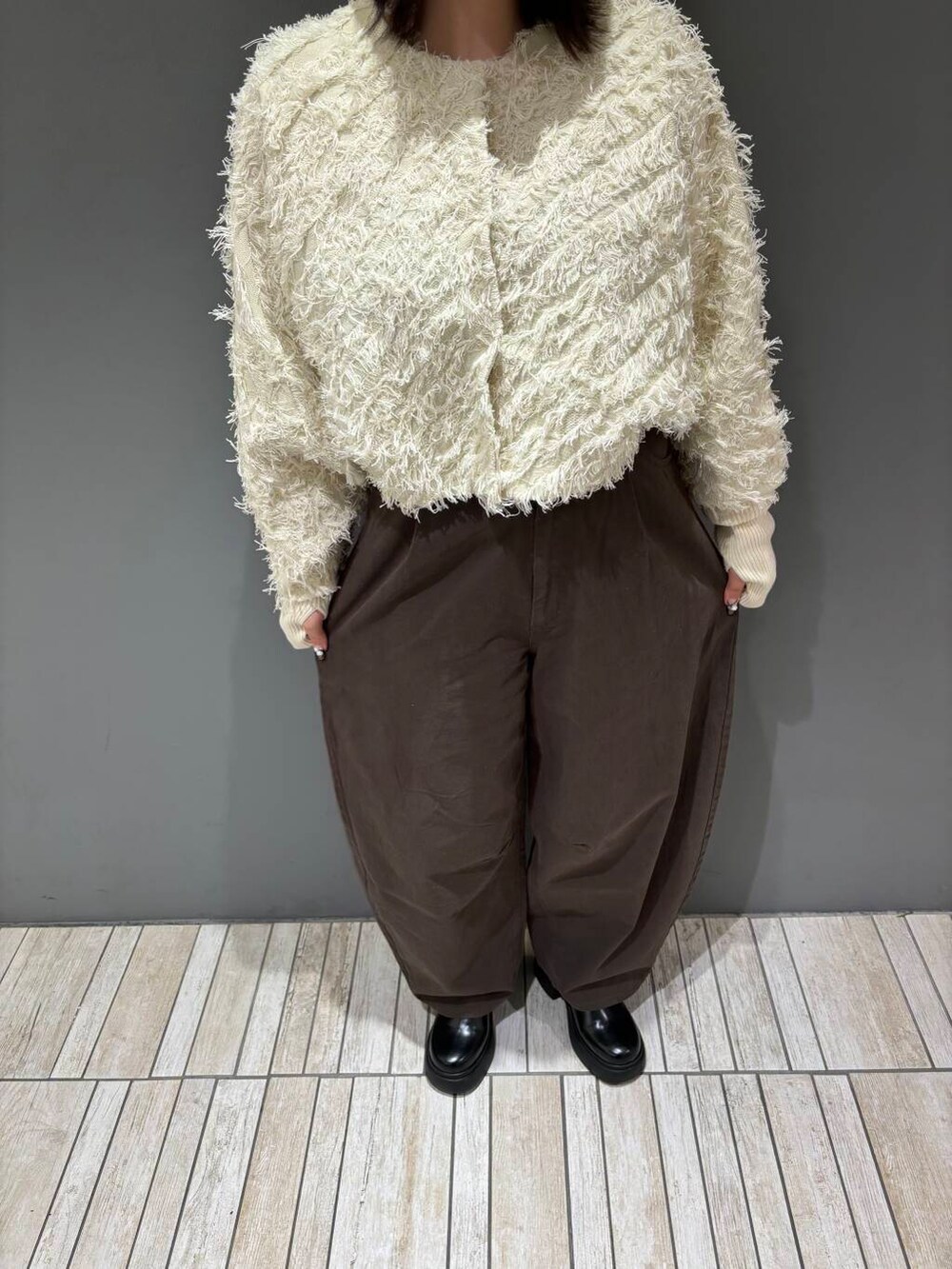 身頃がスッキリしたシャツやコンパクト丈のニットやカーディガンなど合わせると、ボトムスのシルエットが映えるのでオススメです!
