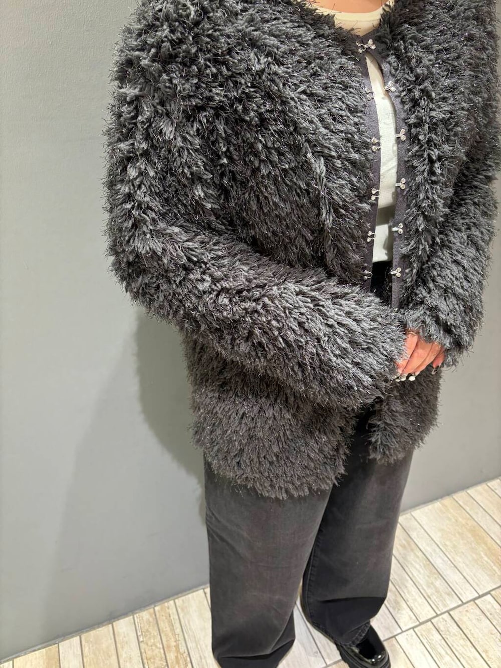 ふわふわの太めの毛とラメが織り込まれた細い毛で作られたボアトップスです!フロントのホックデザインが可愛く、前後2WAYで着れるのも嬉しいポイント👍🏻