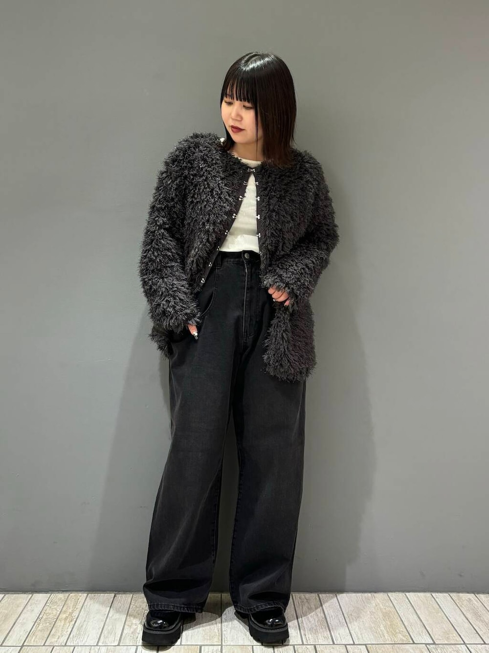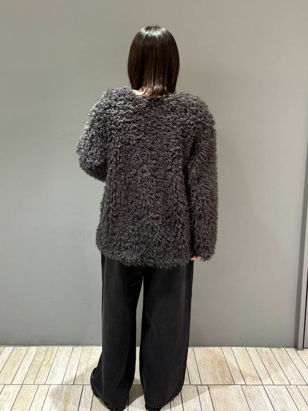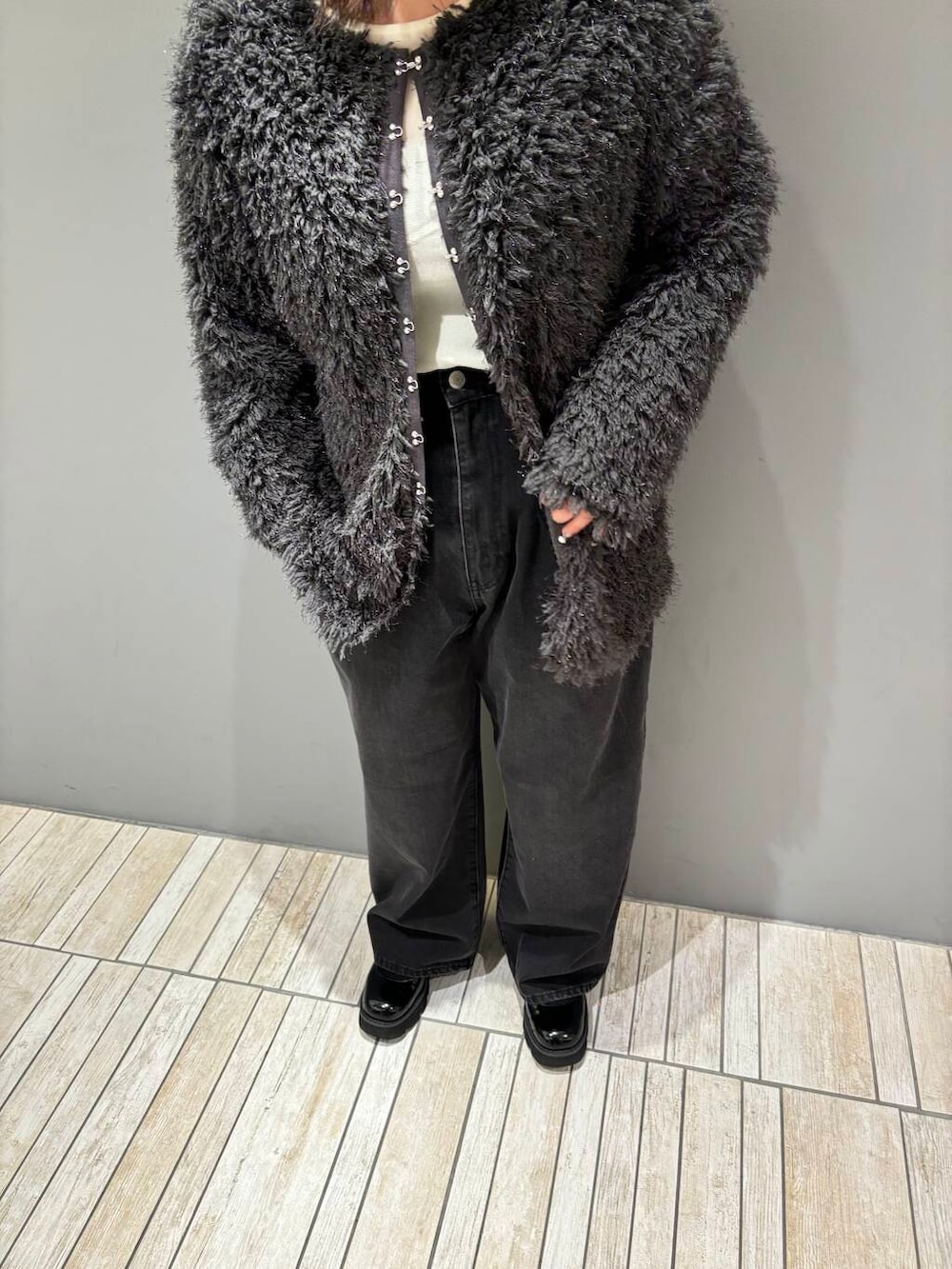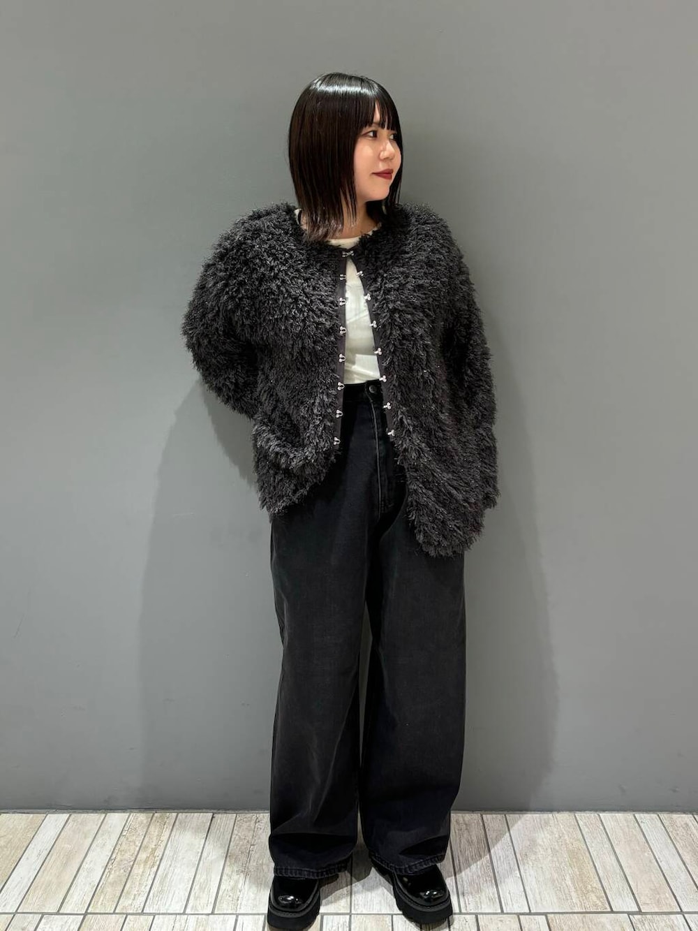 着膨れしがちなボアですが、襟ぐりを広めに作っている&ホックの終わりが途中で止まっているので抜け感が出る仕様にもなっています!