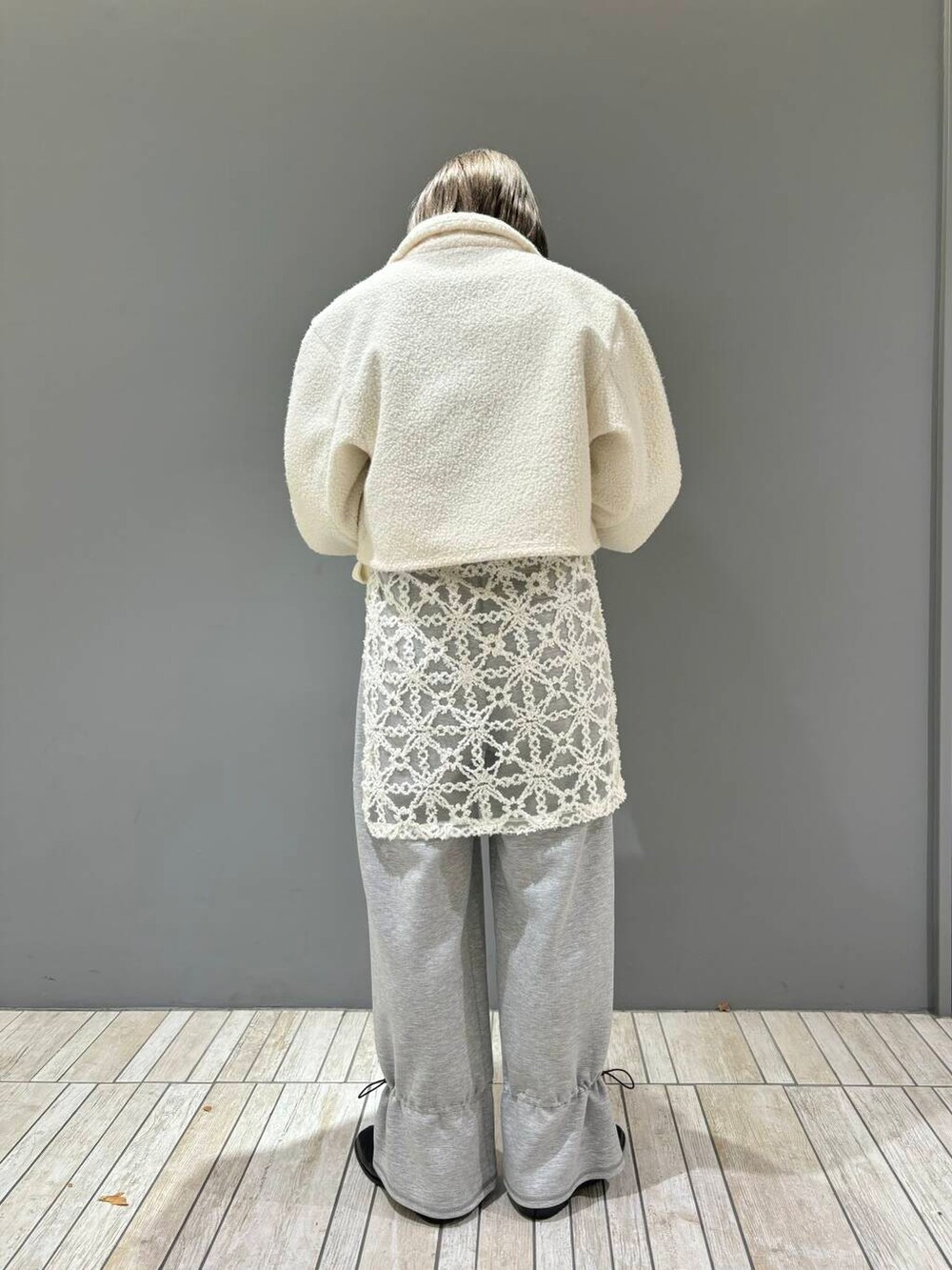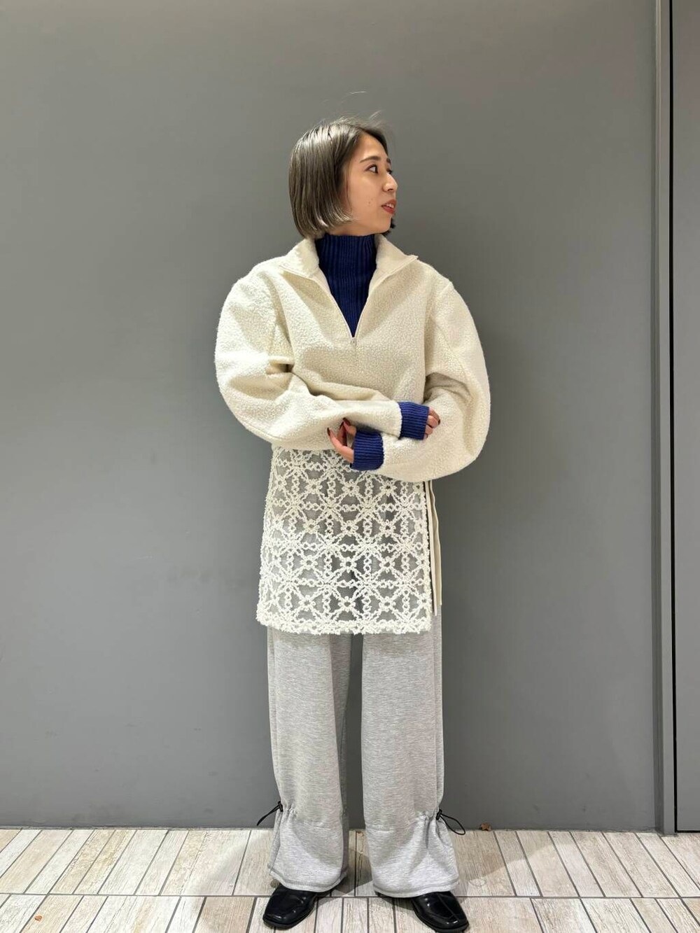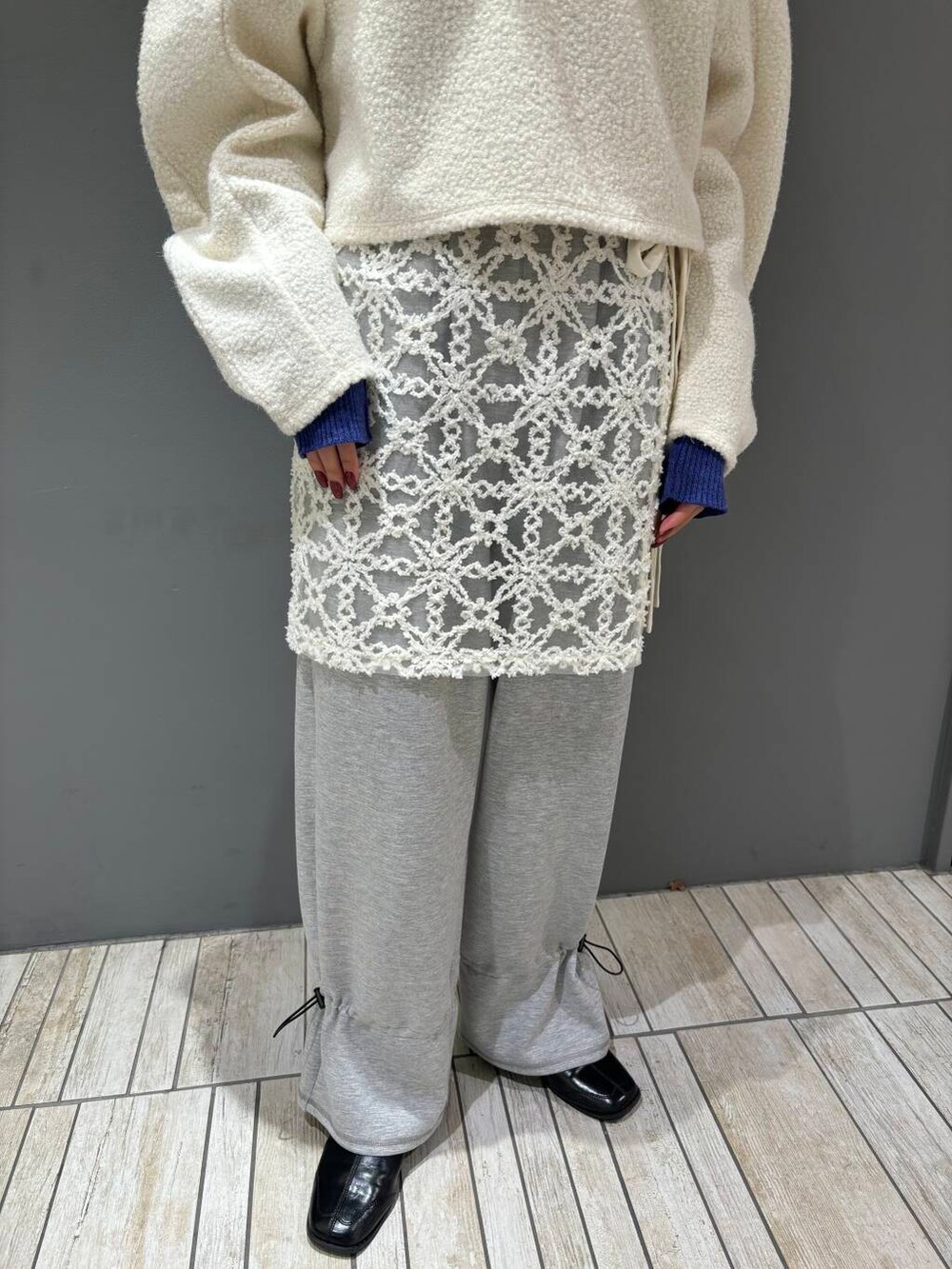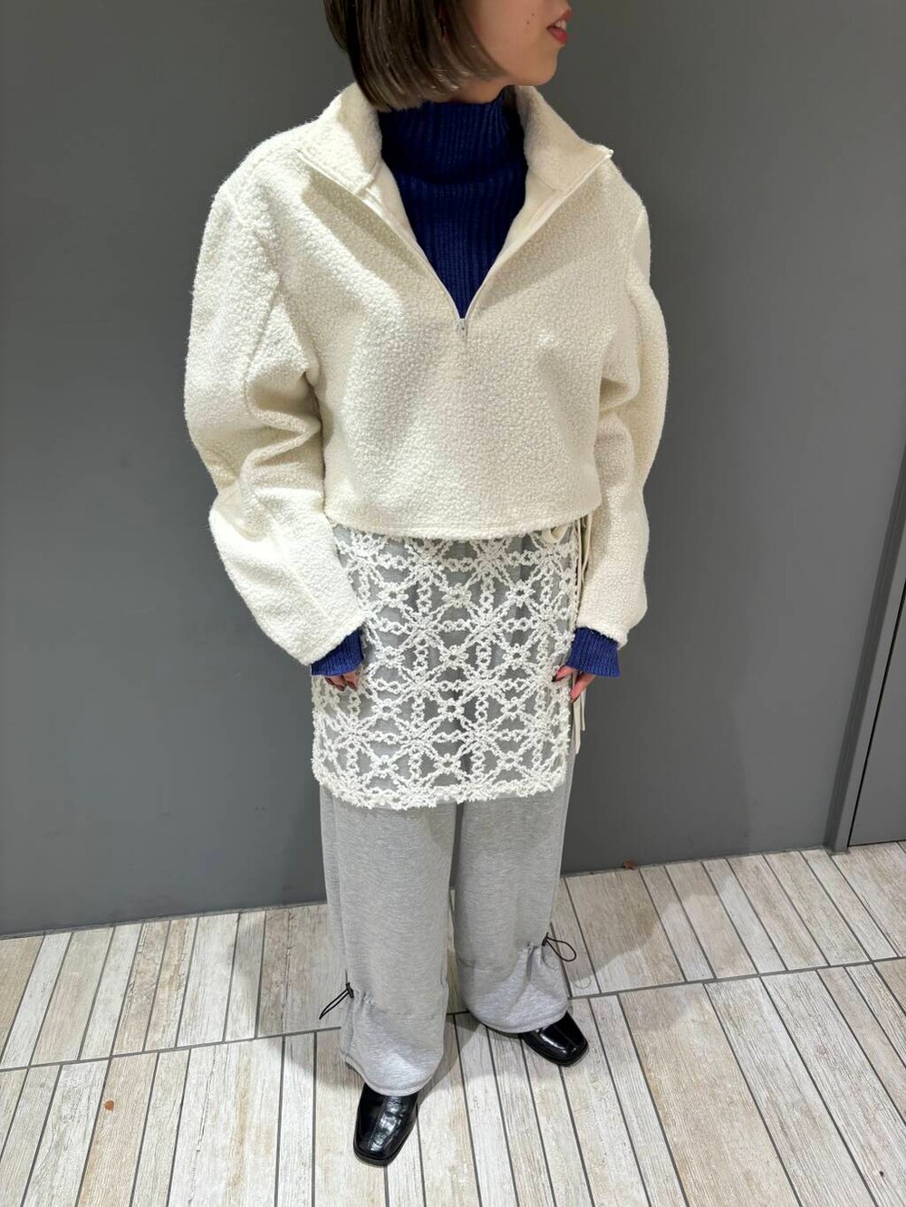 ハーフZIPカーブスリーブプルオーバーとランダムRIBハイネックニットとキャンディーヘムパンツとレースラップスカートを合わせて着用しました♪