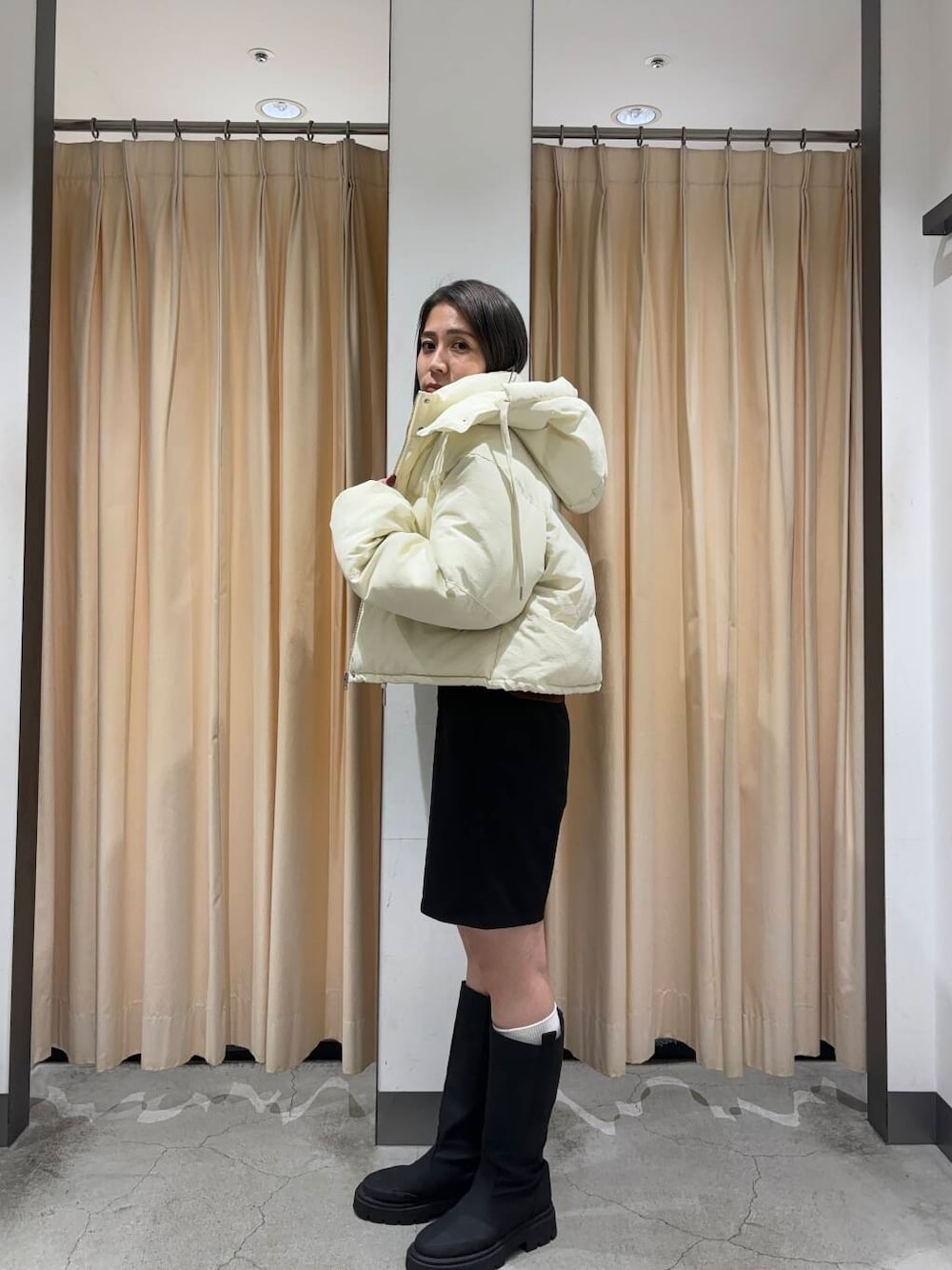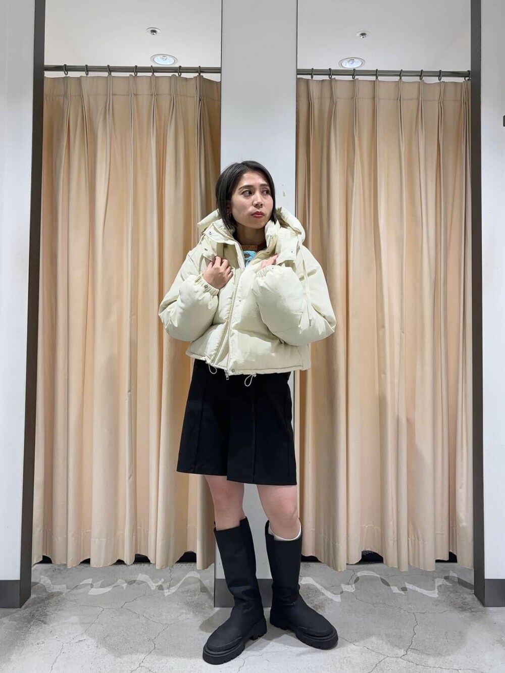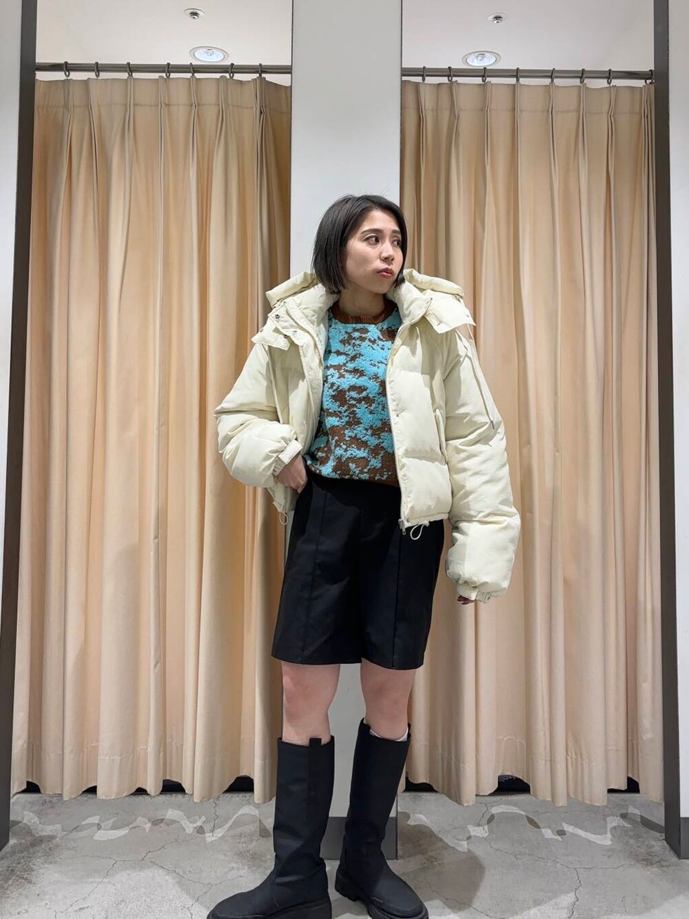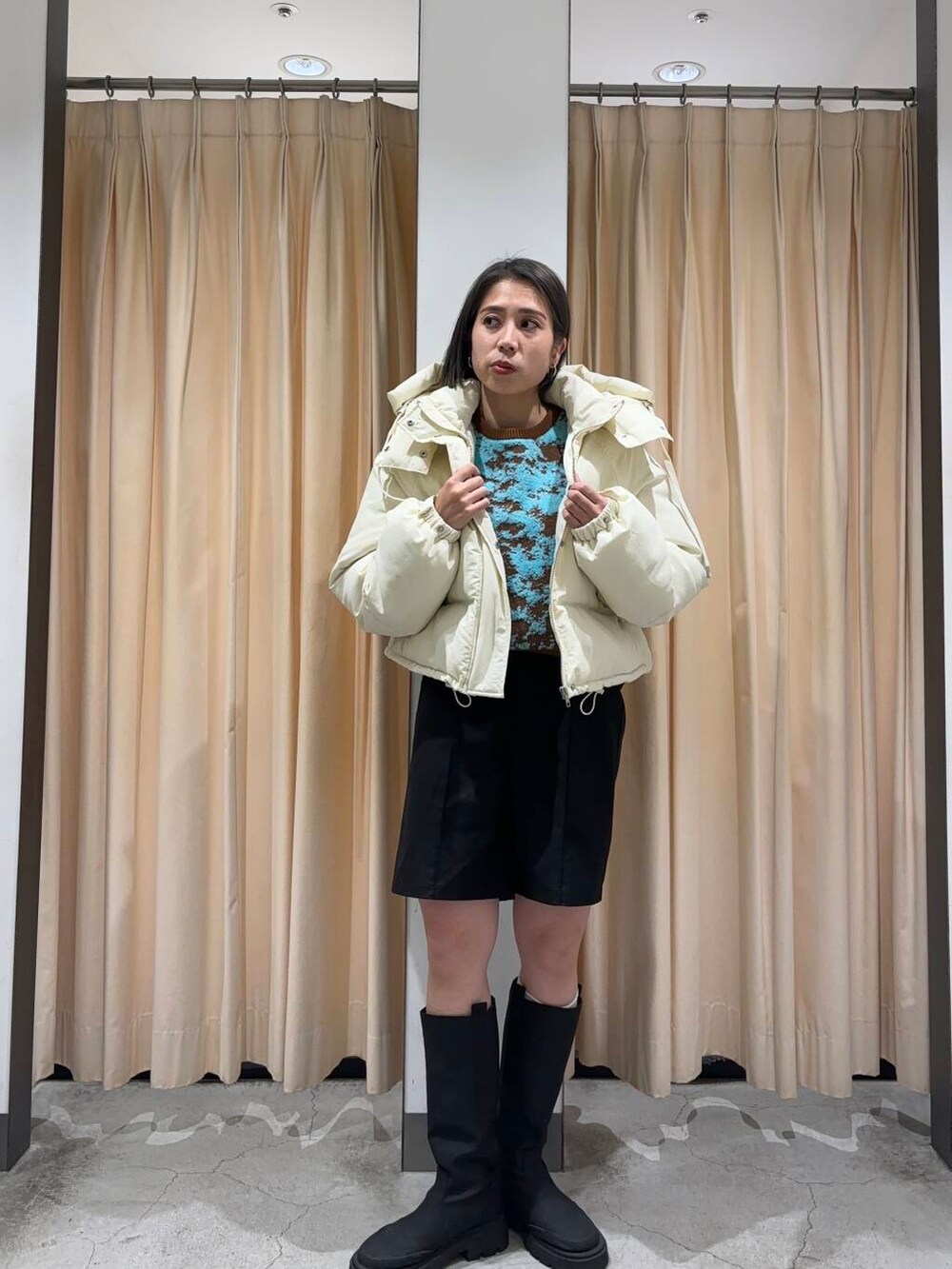 ピンタックショートパンツとショート中綿フードジャケットとマーブルジャガードニットを合わせて着用しました☆