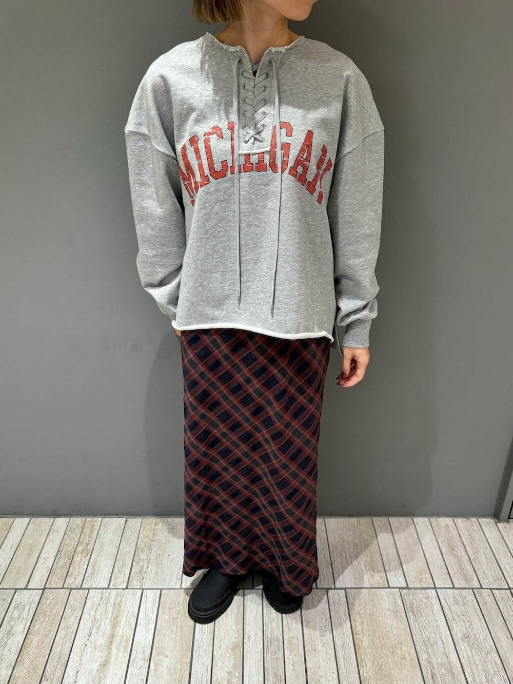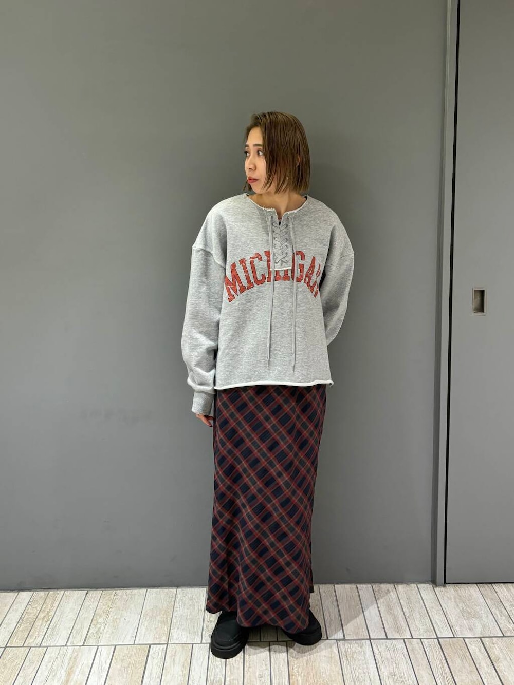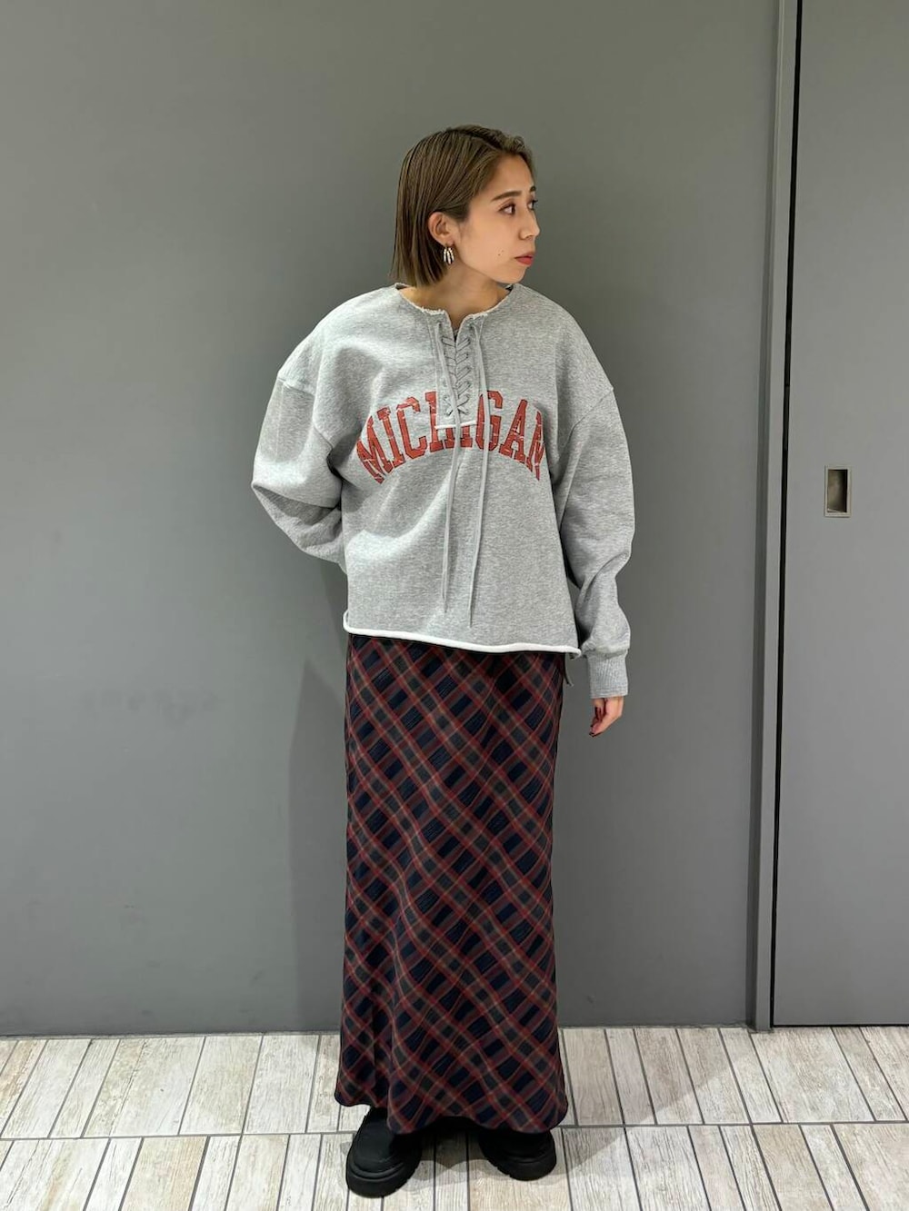 チェックナロースカートとレースアップロゴスウェットを着用しました♪