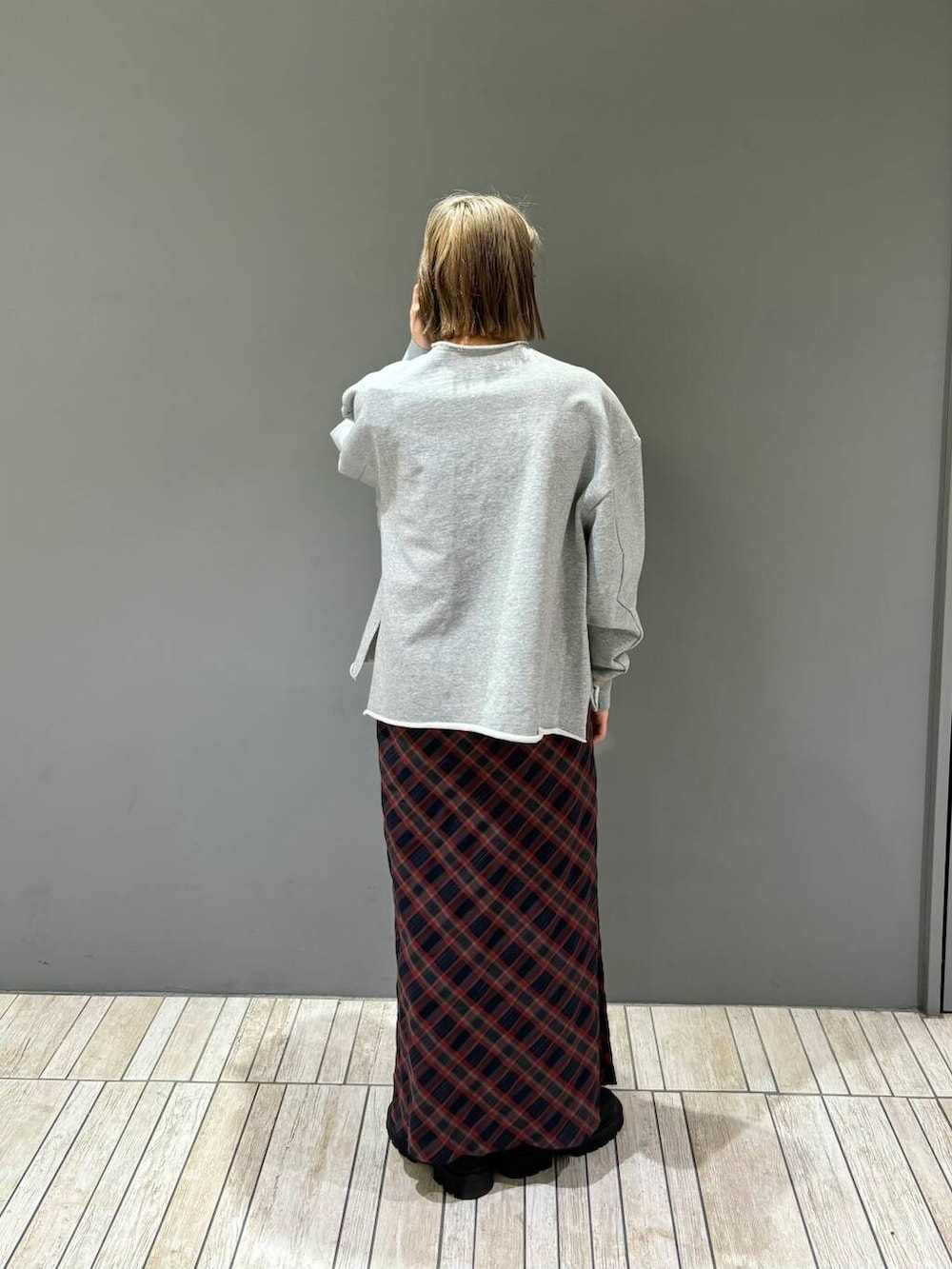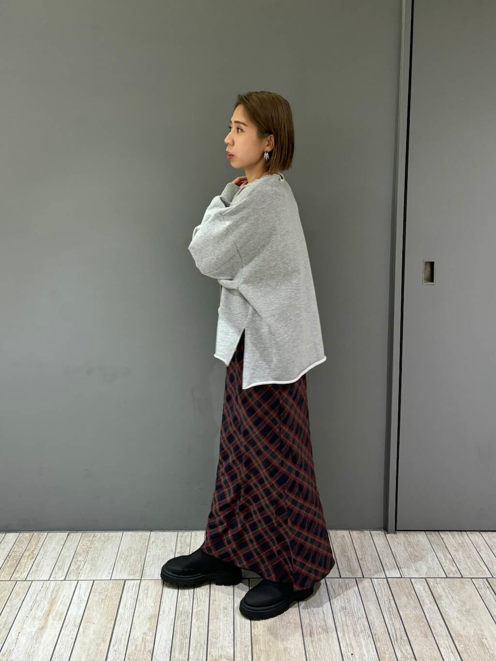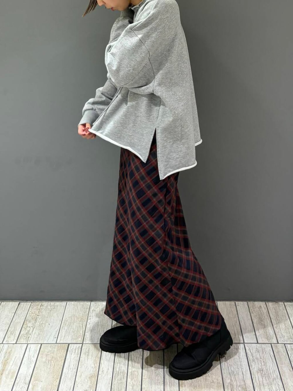チェックナロースカートとレースアップロゴスウェットを着用しました♪