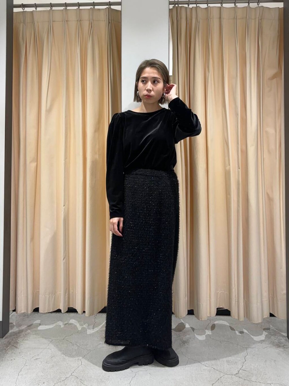 アウターの中は、パフスリーブ2WAYベロアトップスを合わせて、アウターを脱ぐと黒のワントーンコーディネートをしました🌟