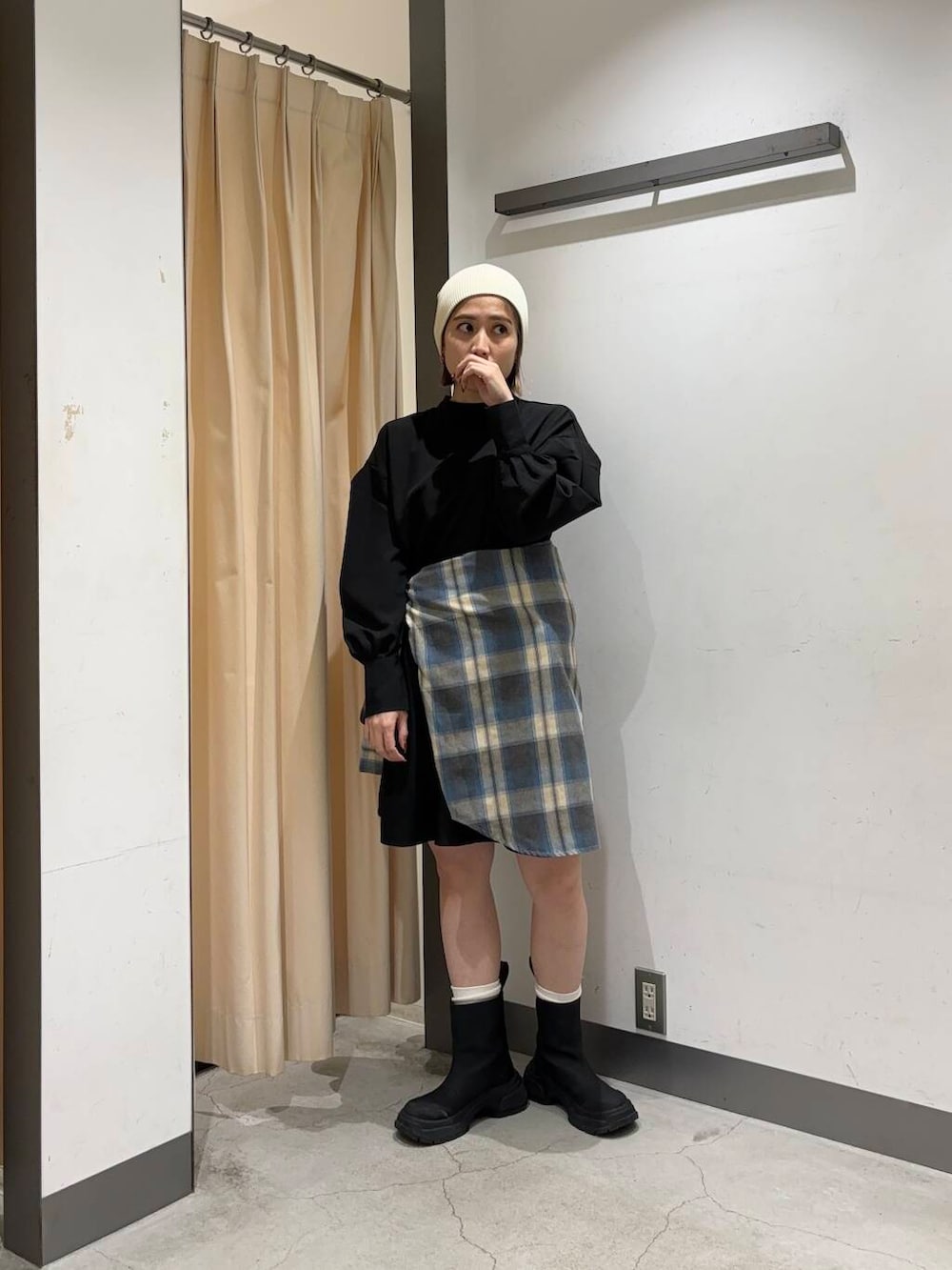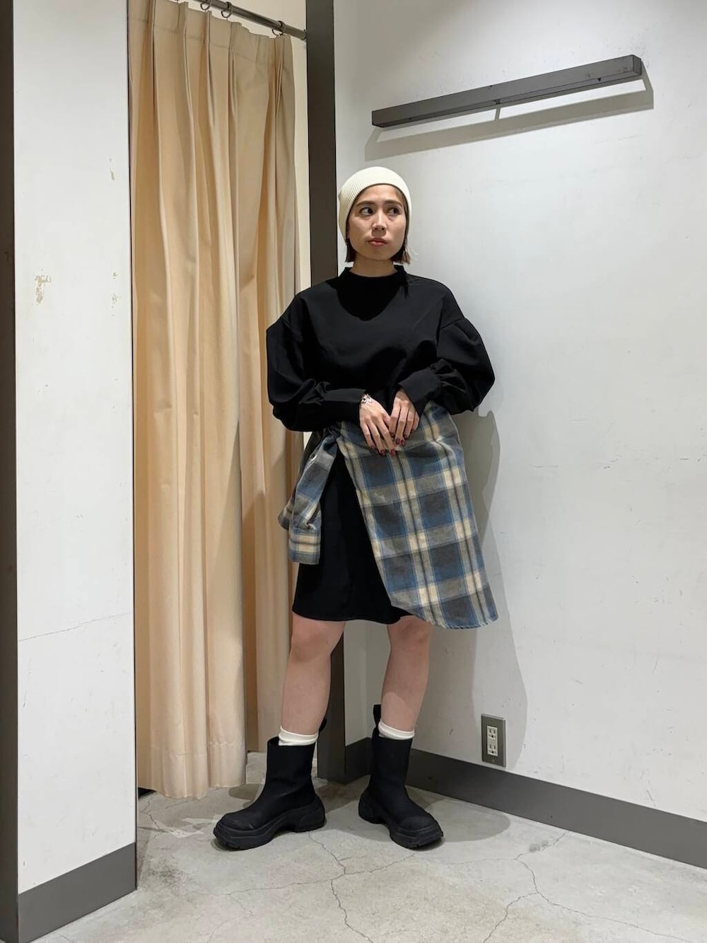 タックスリーブミニワンピースにBIGチェックシャツを腰巻きスタイルでコーディネートしました♪