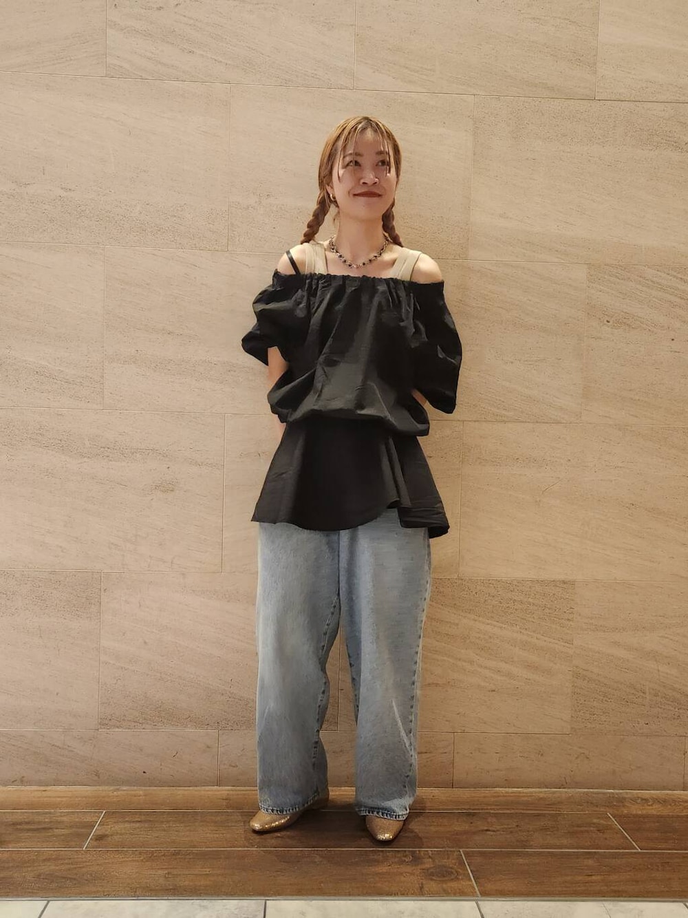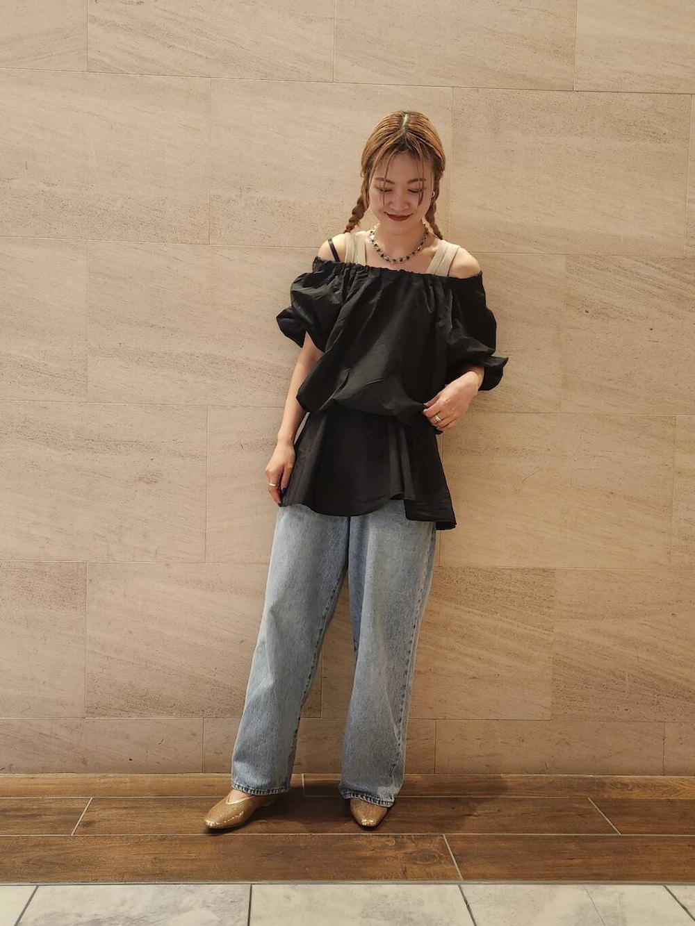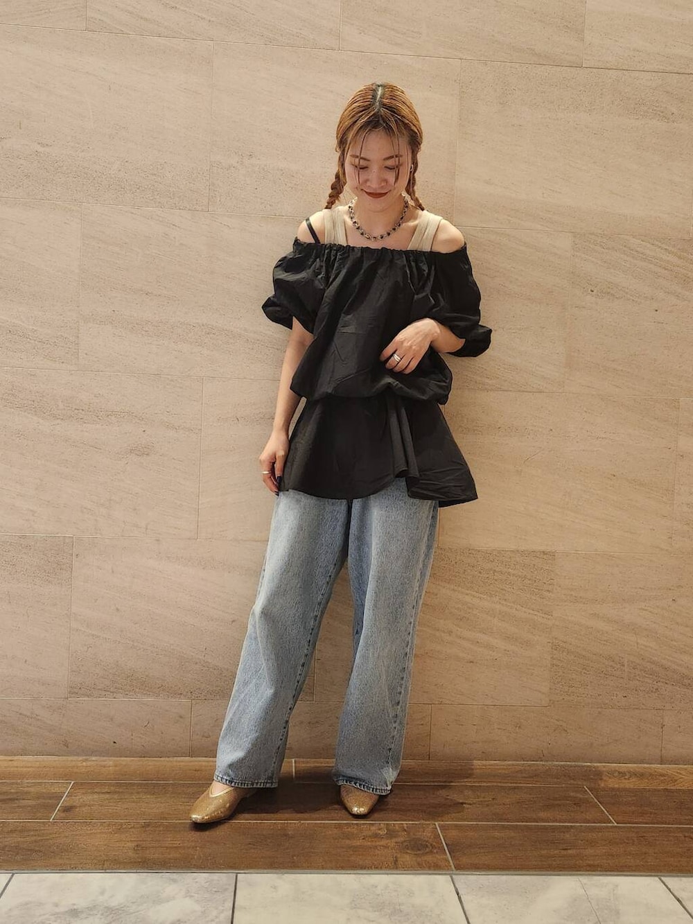きれいめなオフショルブラウスをカジュアルにデニムと合わせました!