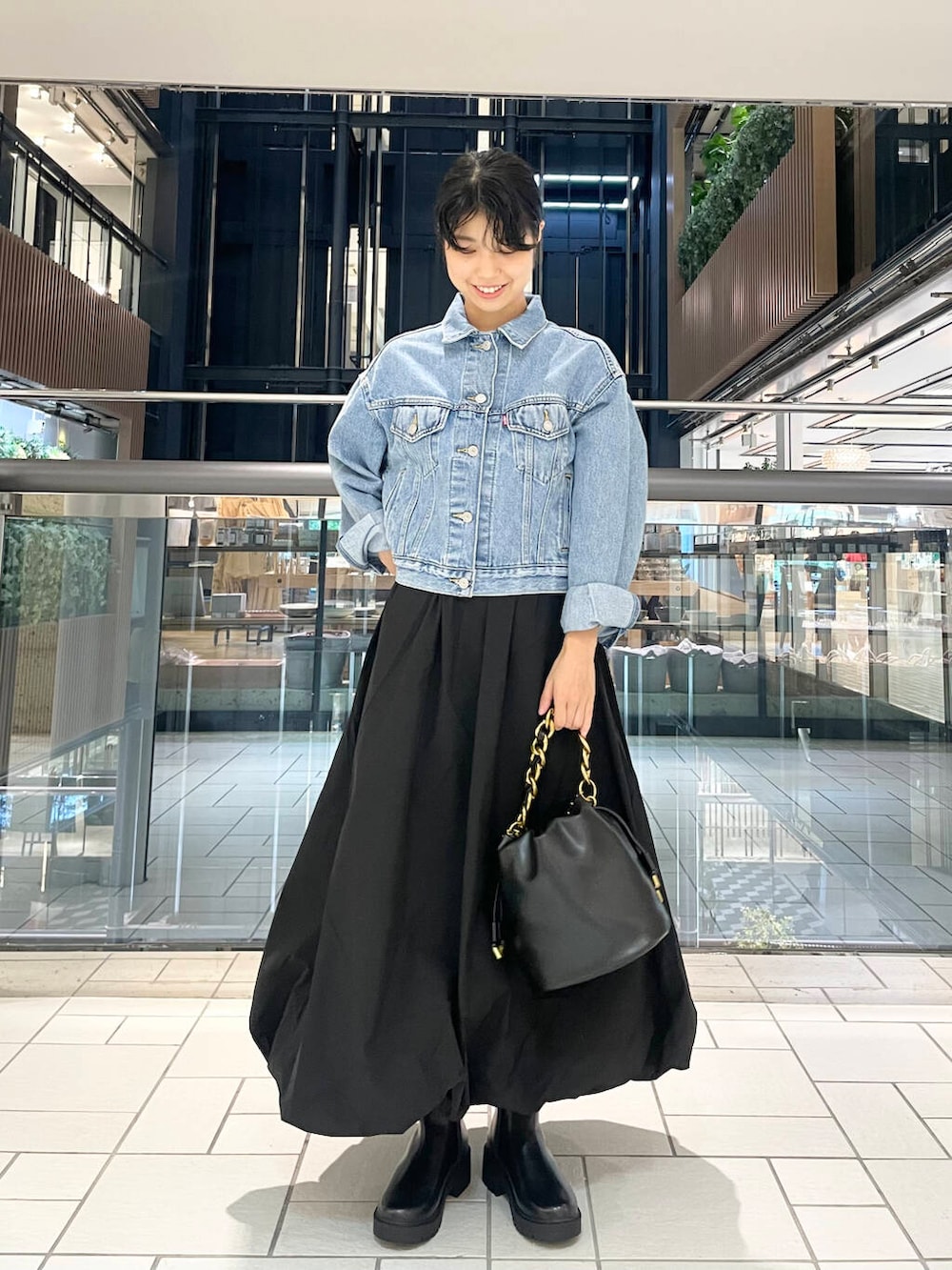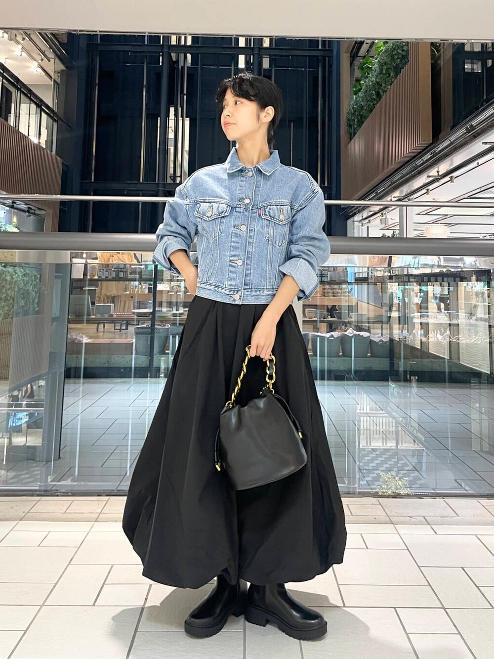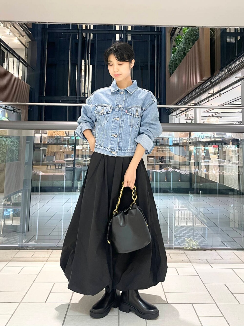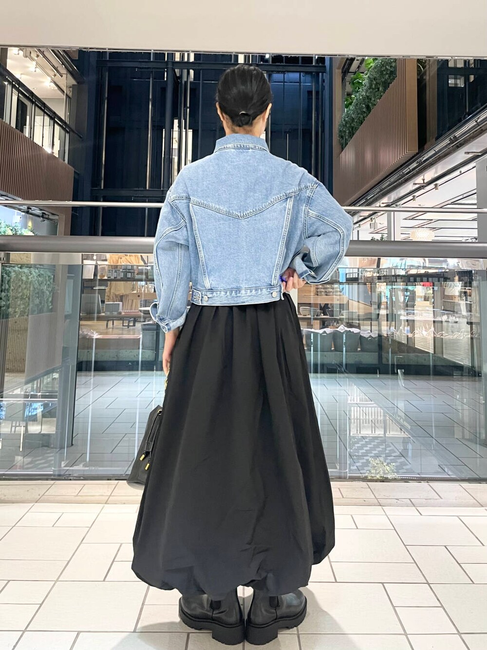 スカートはボリュームたっぷり、バルーンの形なのでクロップド丈のデニムジャケットと合わせて