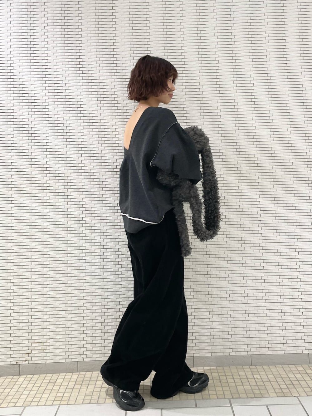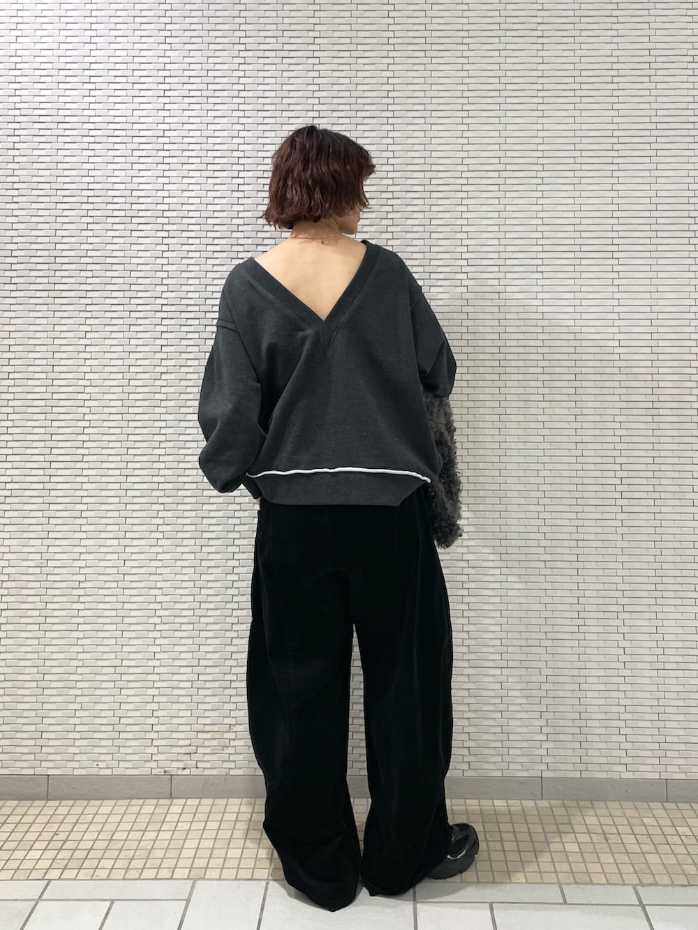 あえてデコルテラインが綺麗に見えるスウェットを合わせる事で