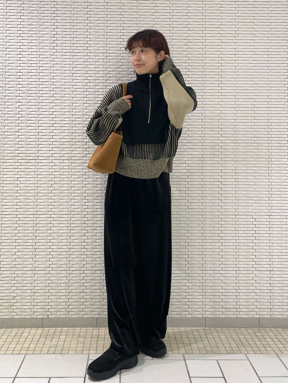 1枚で映えるニットはデニムと合わせがちですが、ゆるっとしたシルエットにベロアスカートも女性らしく着れて