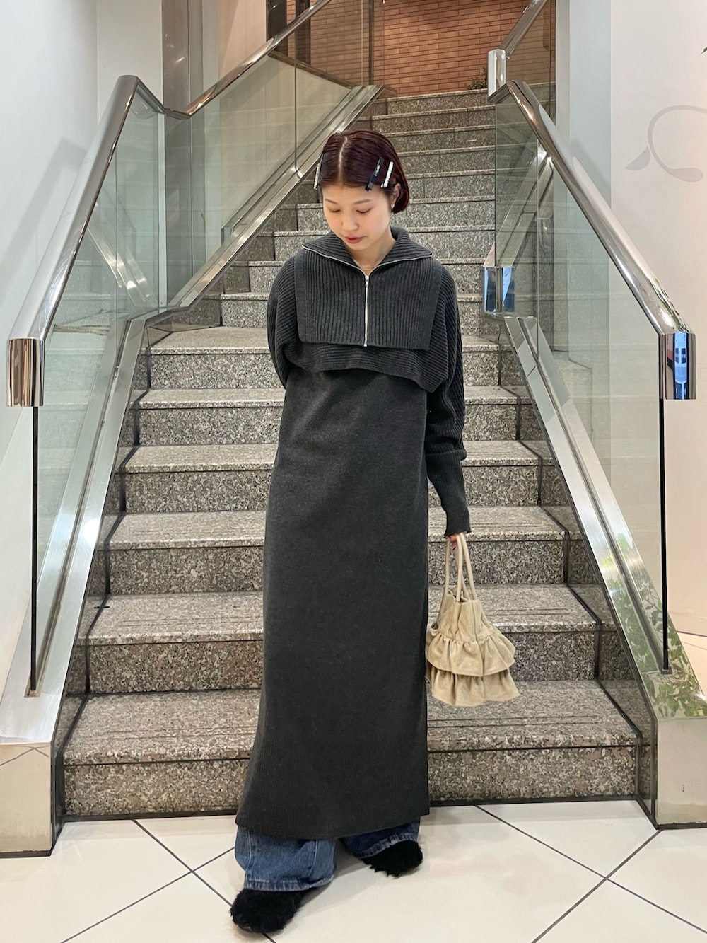 ハーフジップのベストとユーネックワンピが