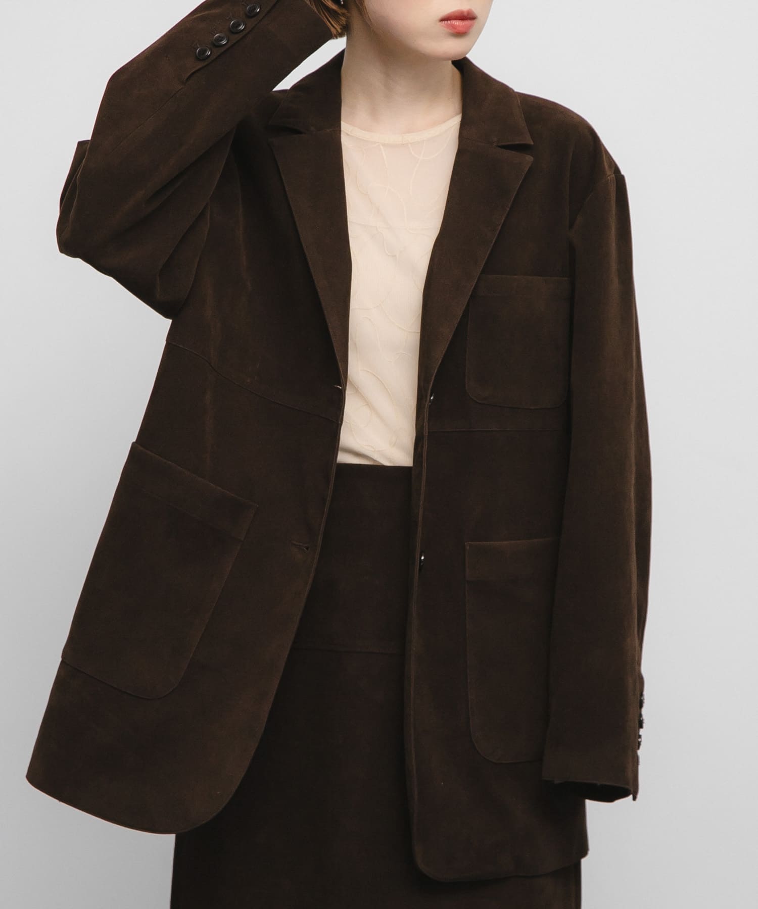 濃いめなブラウンのスエードジャケットとベストに、ゆるめのデニムを合わせたリラックスコーデ。シンプルなのに雰囲気のある大人スタイルに!