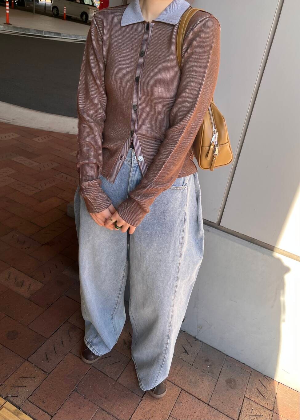 コンパクトなニットなので下のボタンを開けて着るとバランス良く着て頂けます!