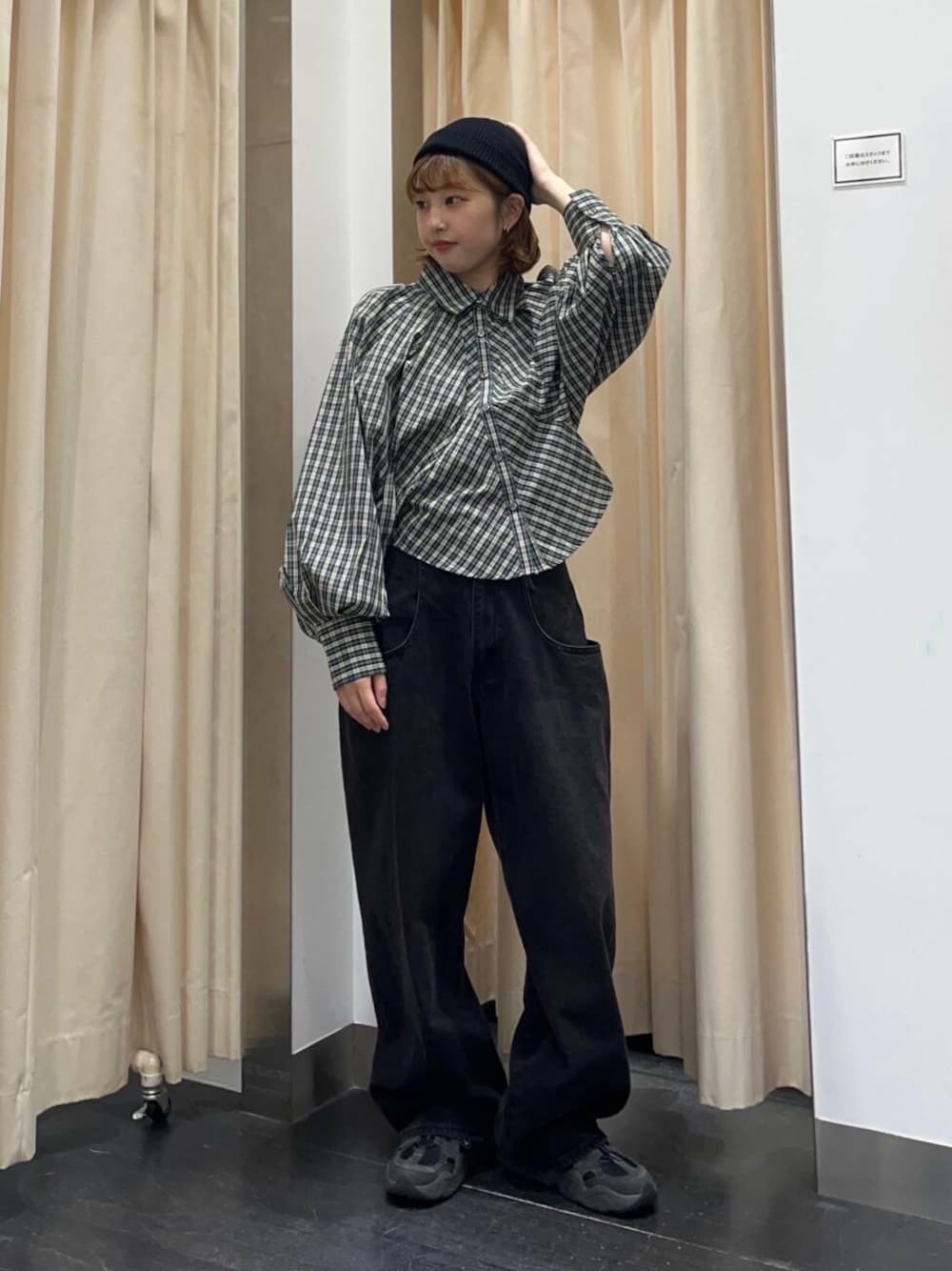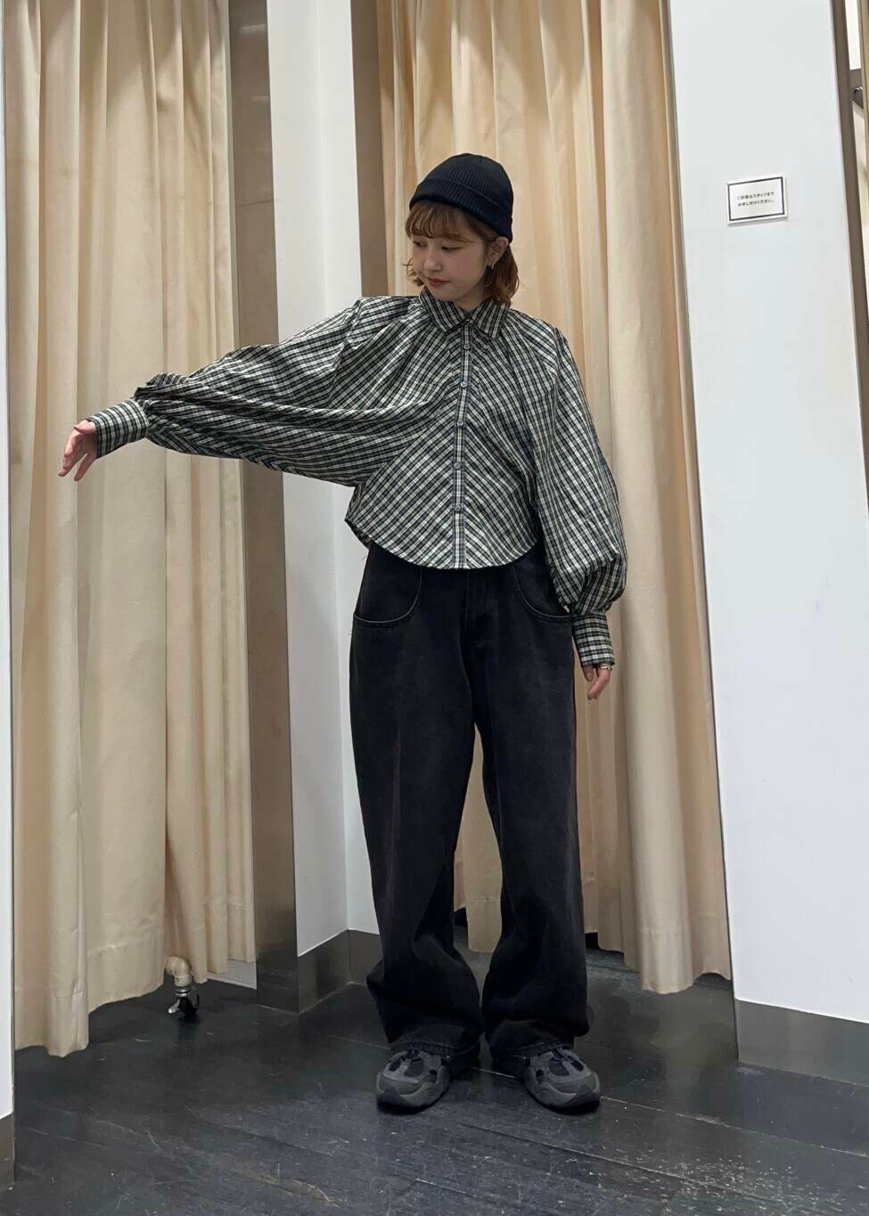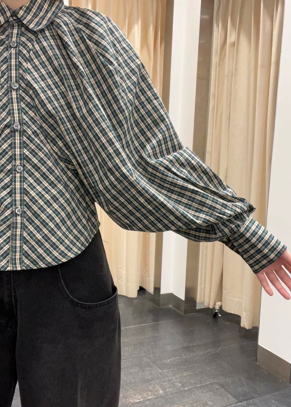 袖のボリュームがかわいいチェックシャツは二の腕カバーにも!