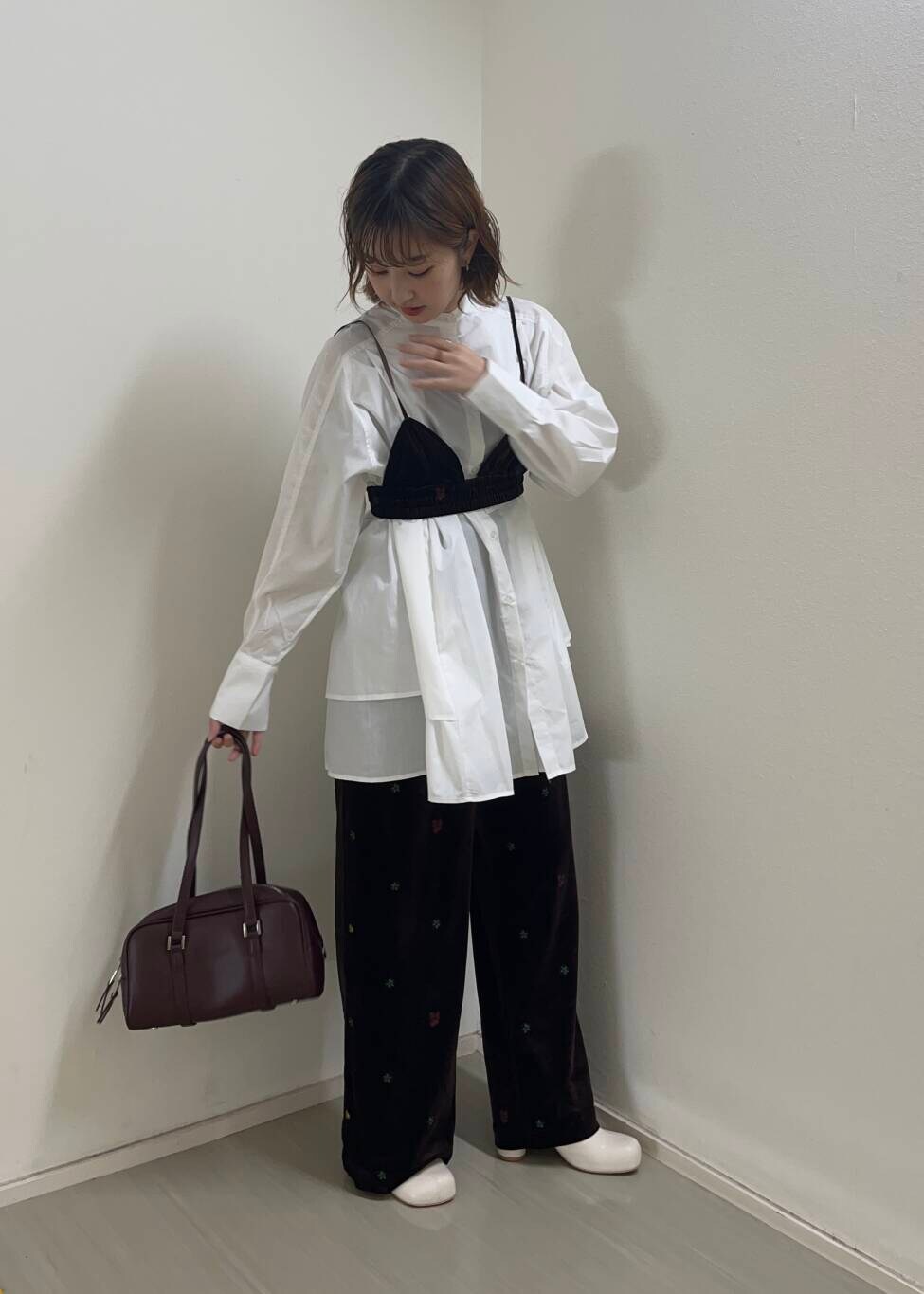 履き心地抜群なベロアパンツは刺繍の花柄も派手すぎず上品な印象を与えてくれます!