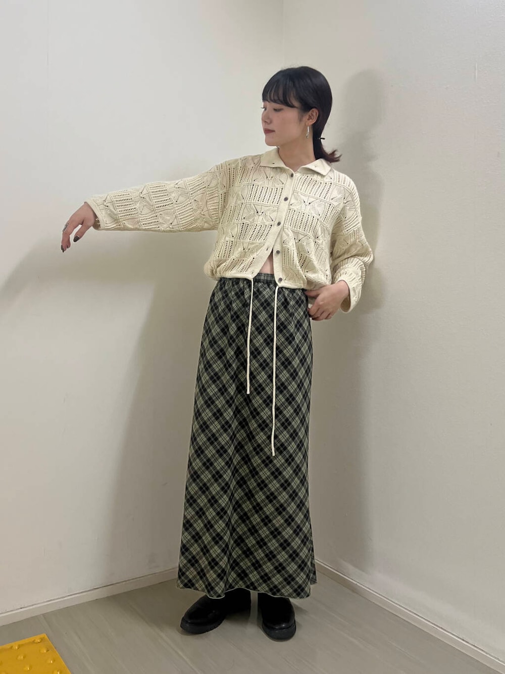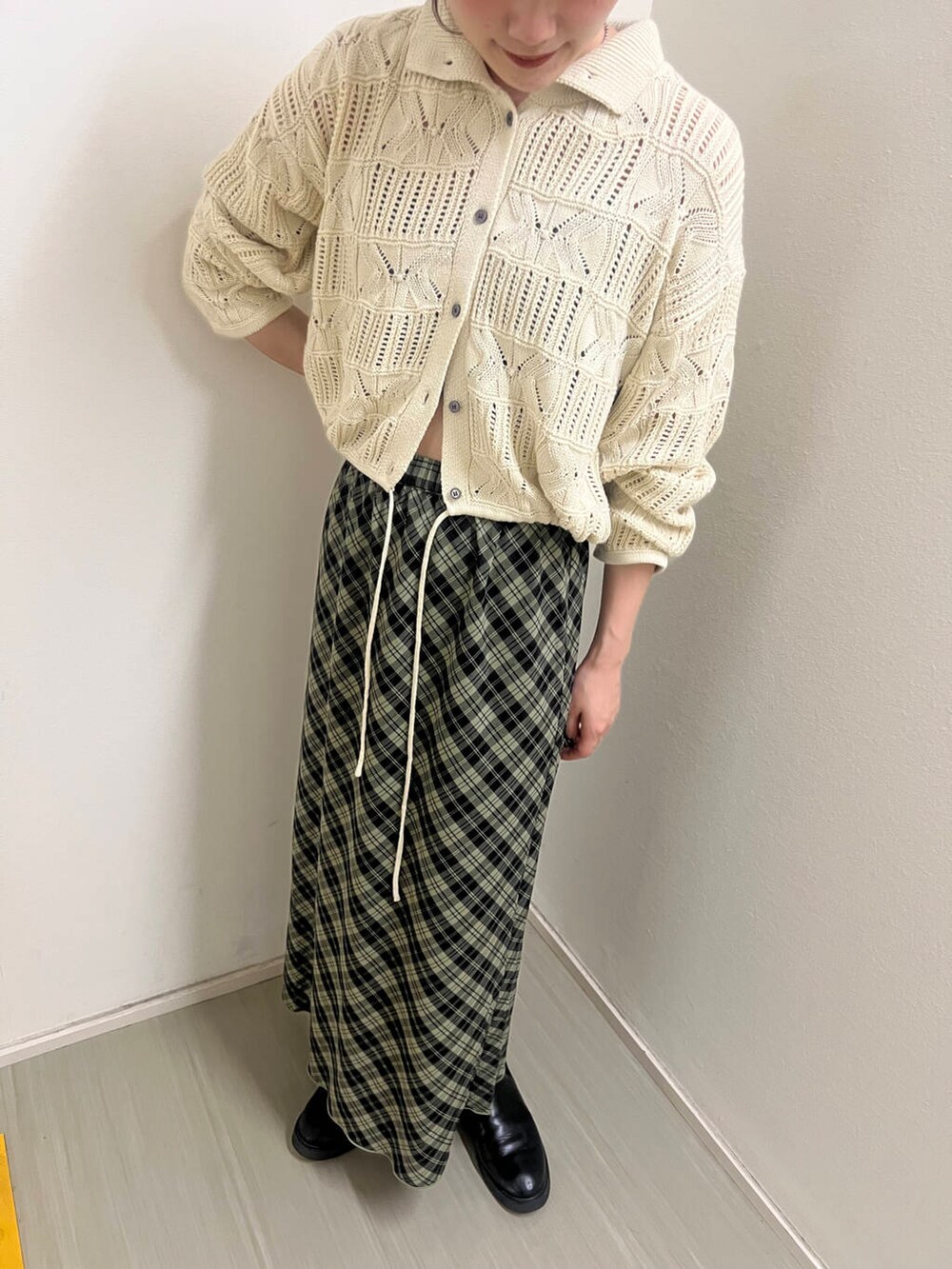 透かし編みカーディガンとチェックスカートで大人っぽく合わせました!