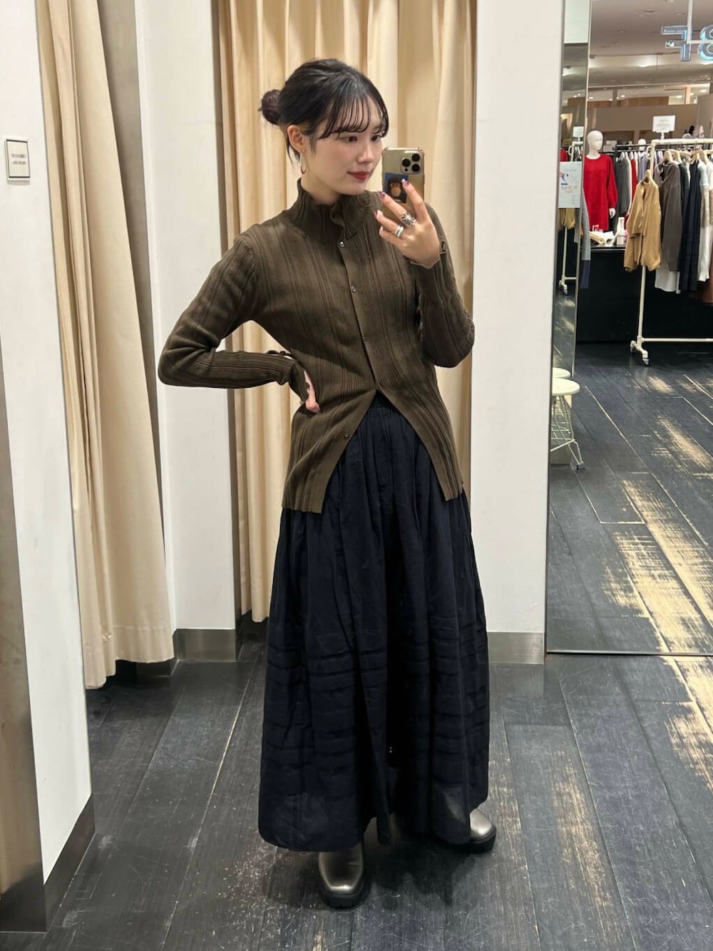 ボリューミーなスカートにトップスは女っぽいRIBニットで合わせるのが◎