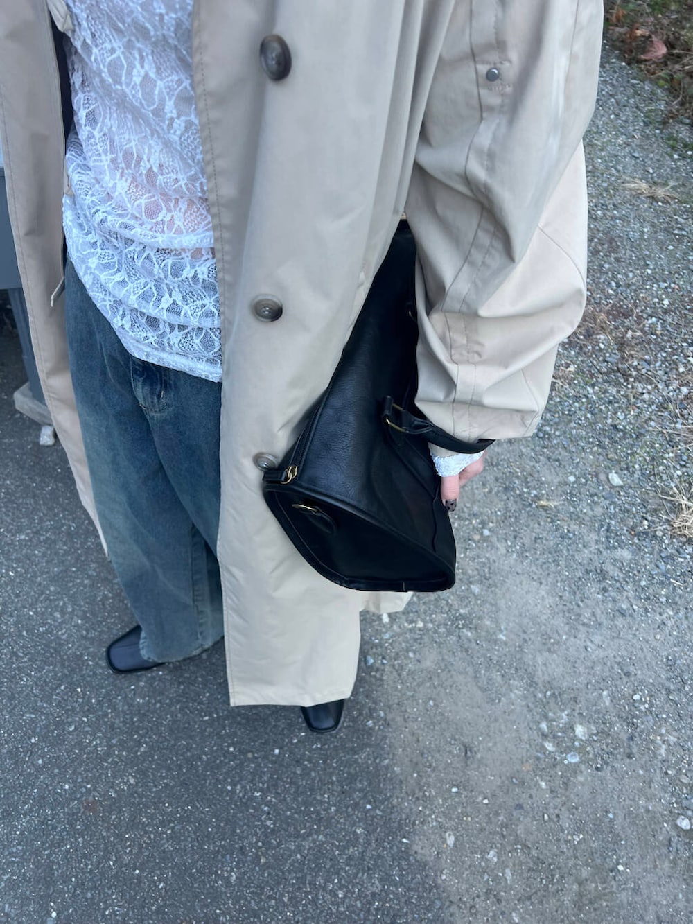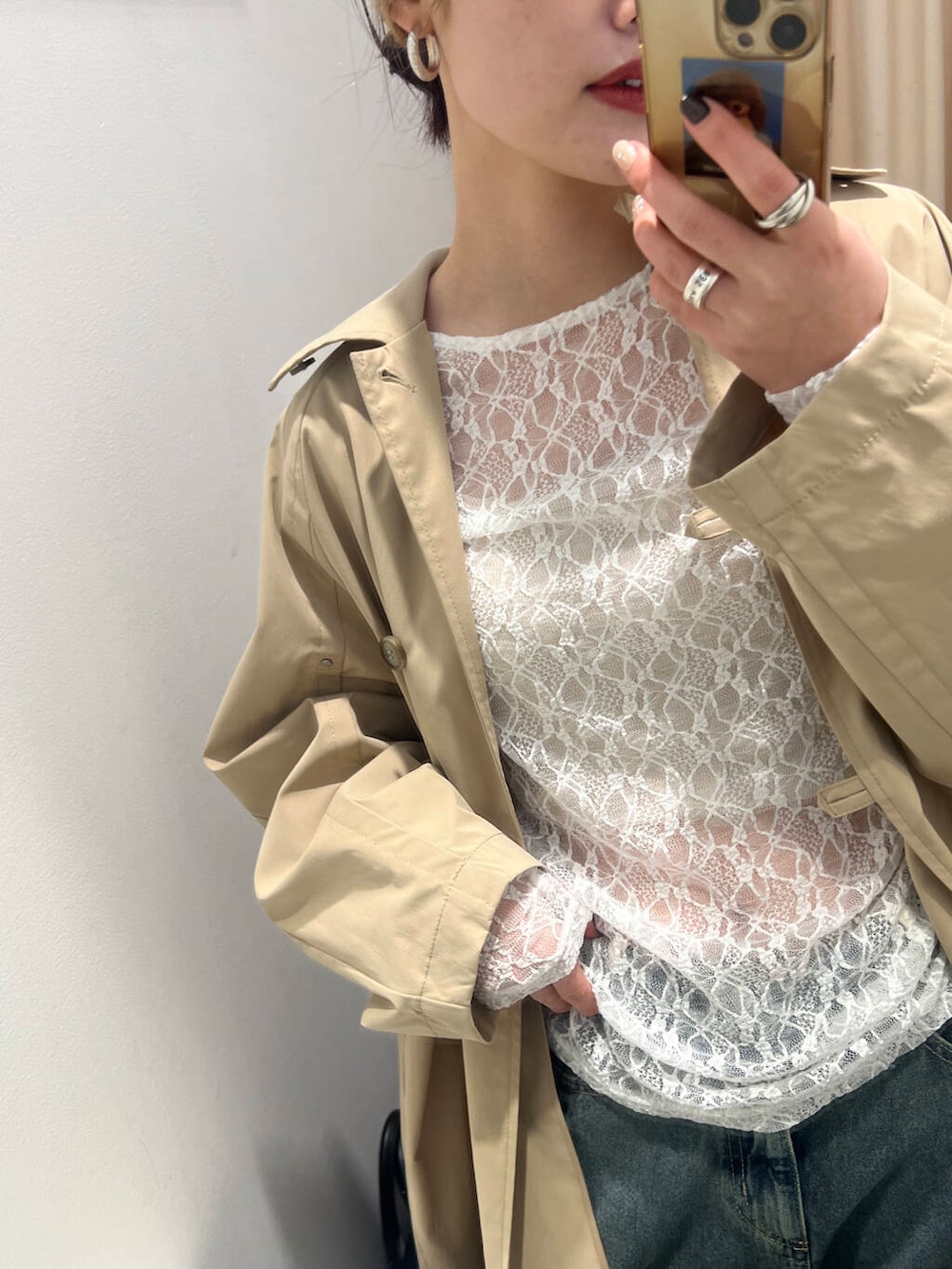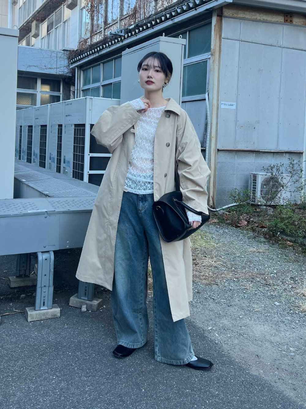 ステンカラーコートはレーストップスとデニムで大人カジュアルに合わせました!
