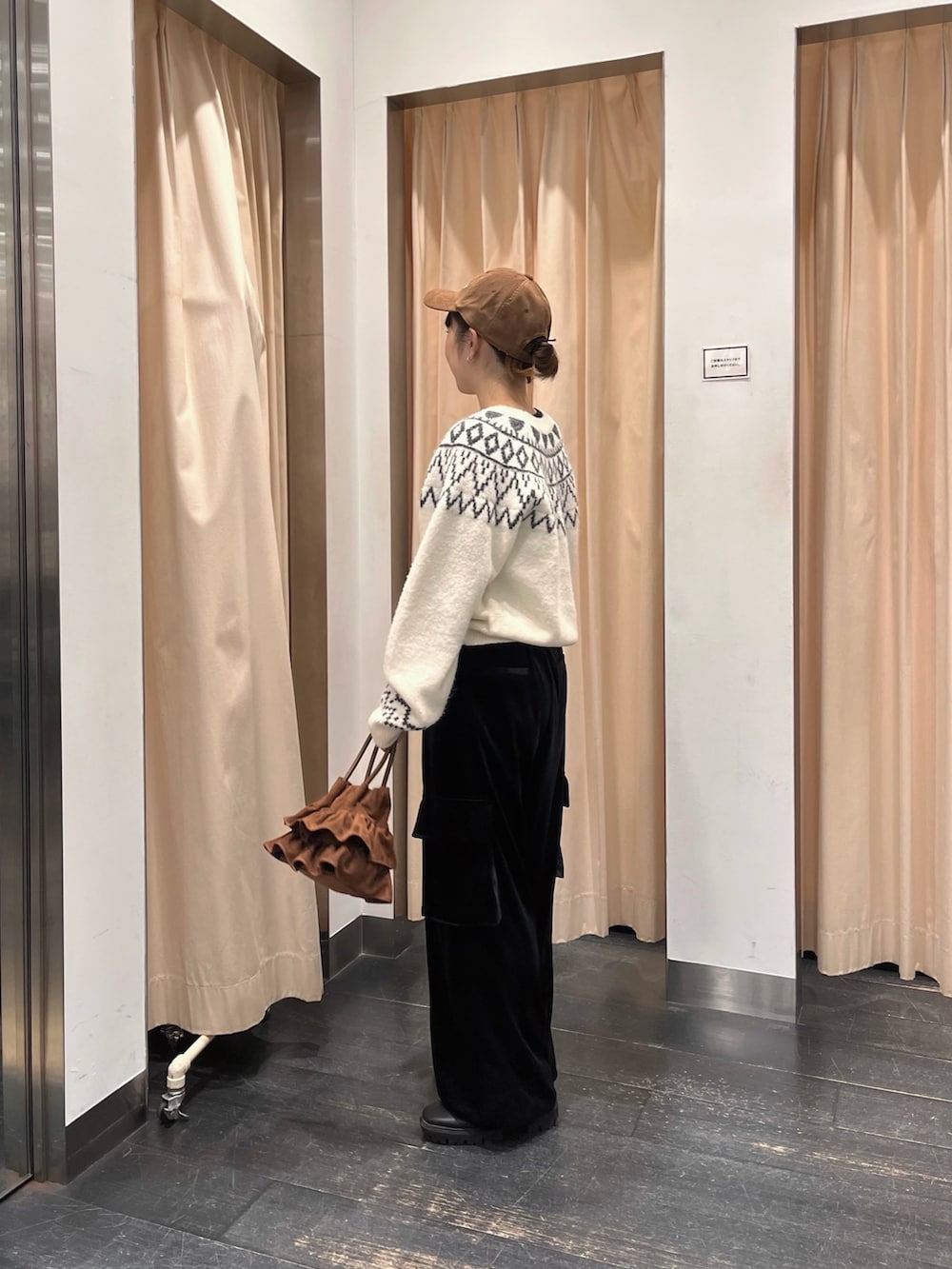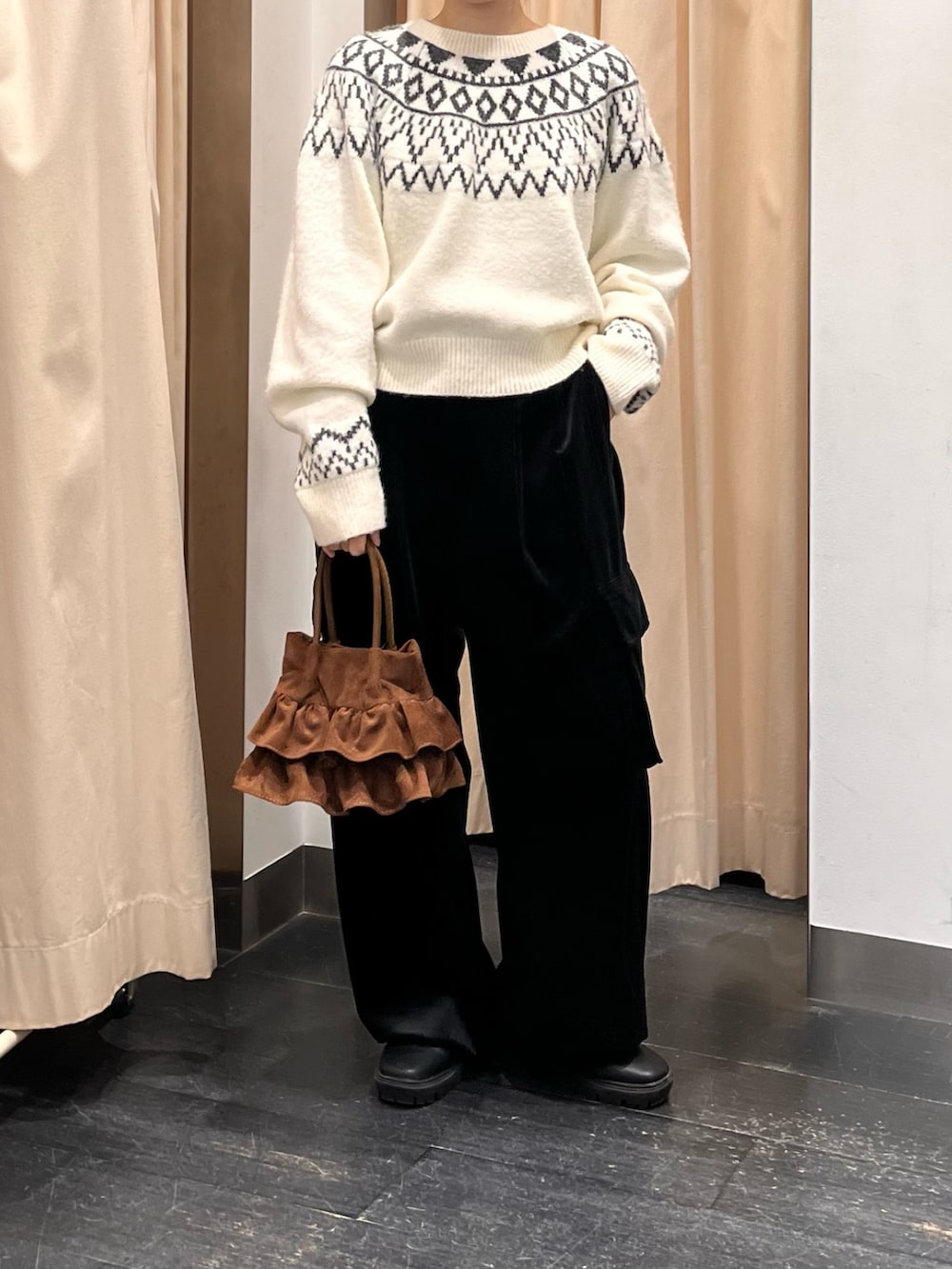 デニムで合わせるとよりカジュアルになるので、黒のベロアカーゴパンツと合わせ