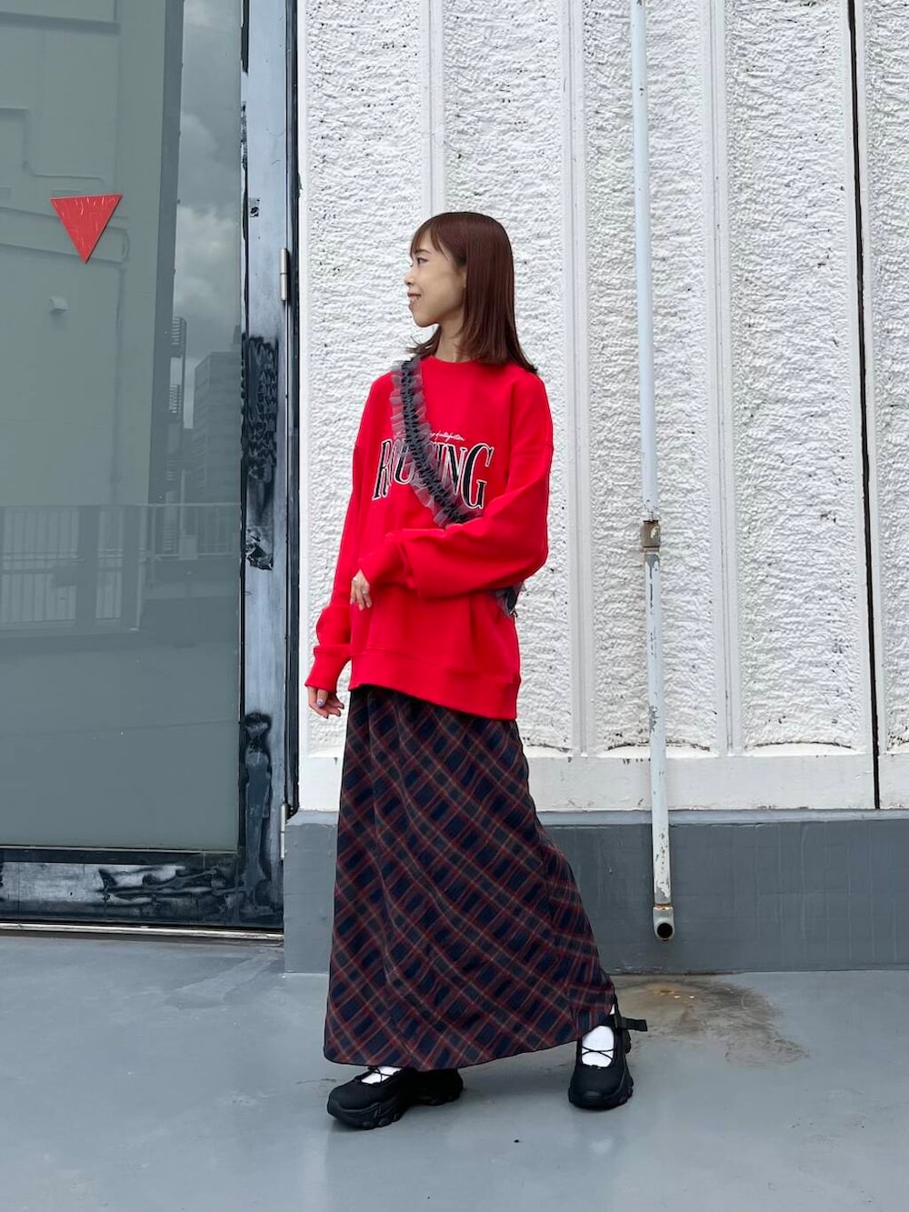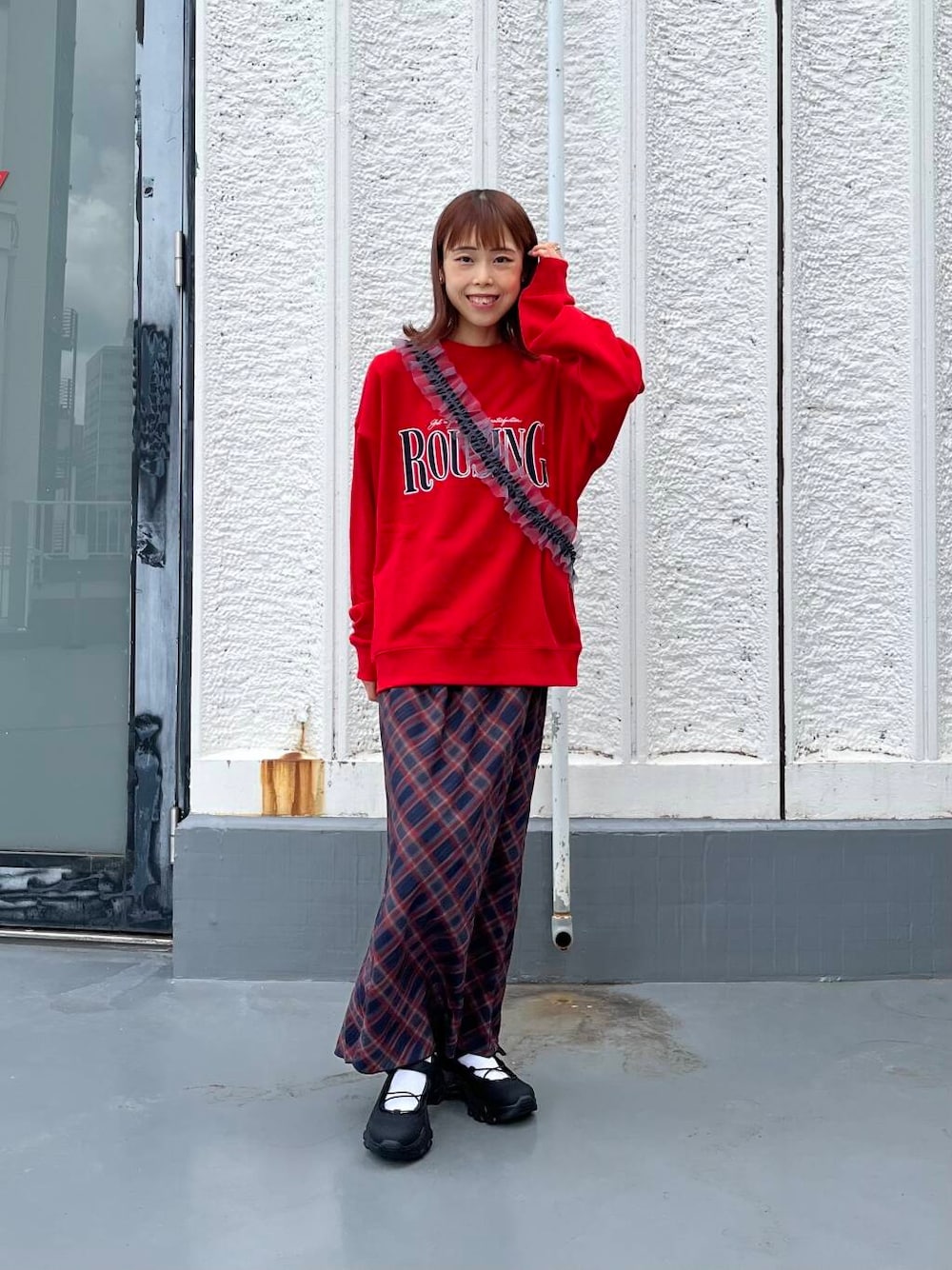 赤のカラーが目を引くロゴスウェットと綺麗めスカートを合わせました❣️