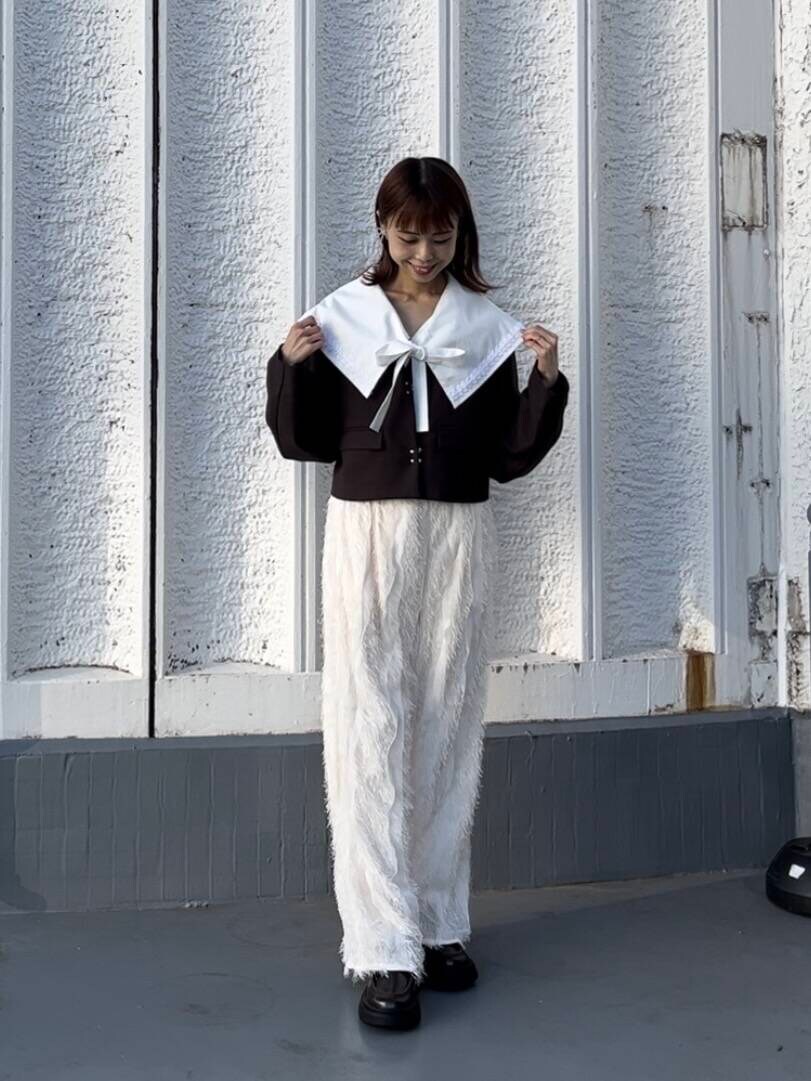 ノーカラーのジャケットは大きな襟のブラウスと相性ばっちりです👌🏻