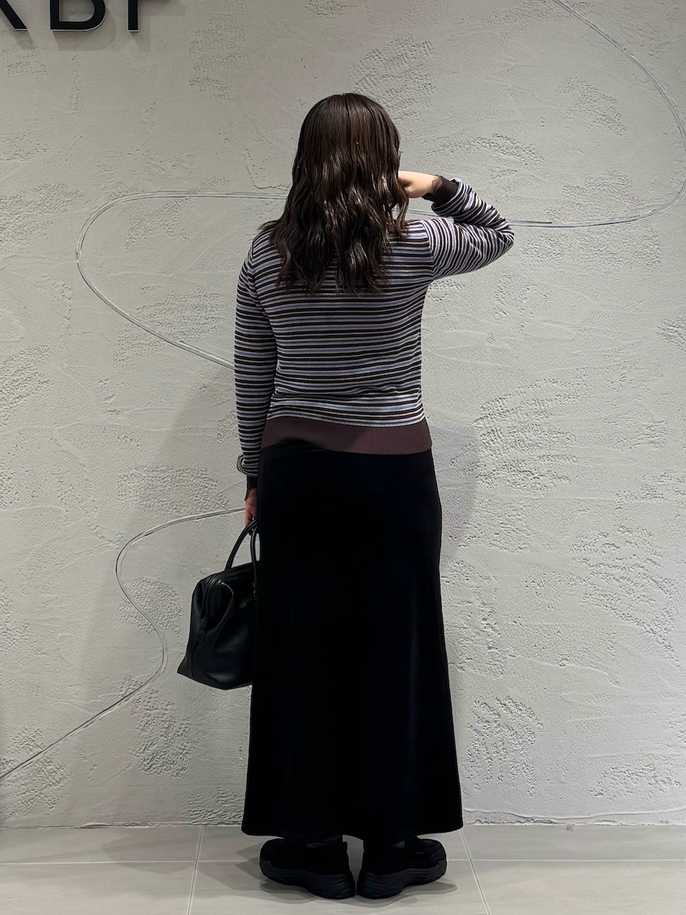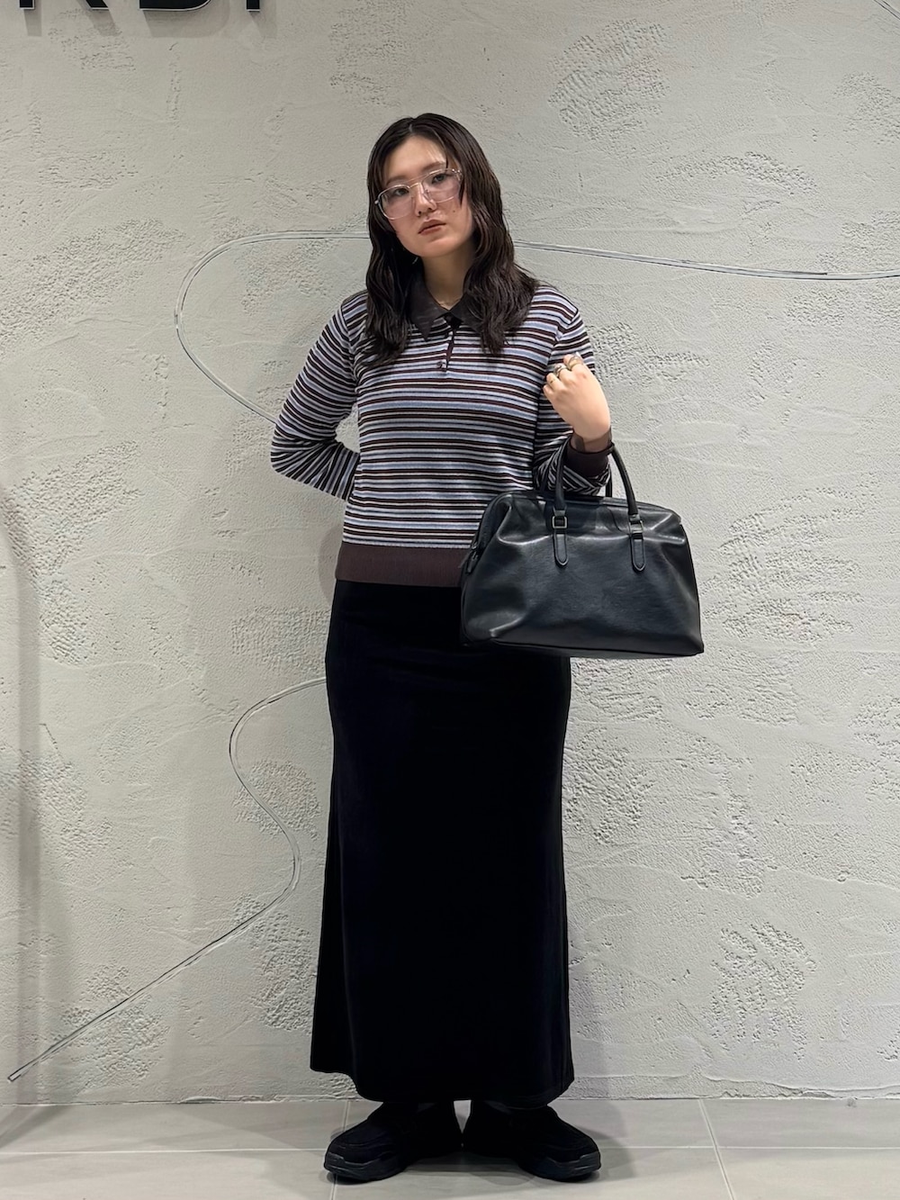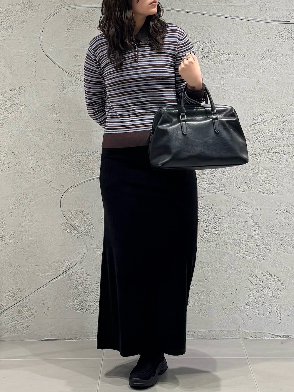 カジュアルなポロニットとキレイめなベロアスカートを合わせた大人カジュアルコーデです🥃