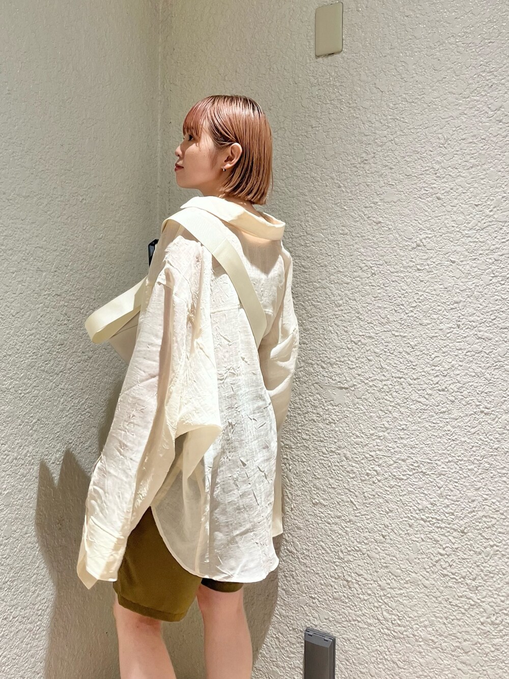 全体的にワイドなシャツですが、麻のような少しシャリ感のある素材で女性らしく着ていただけます^^✨