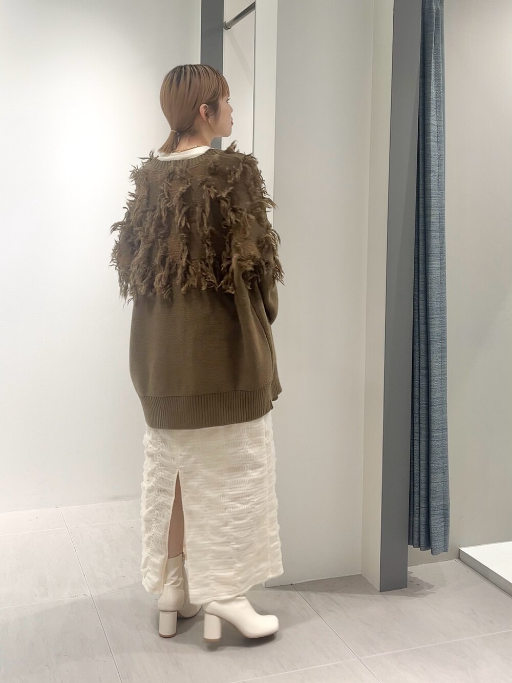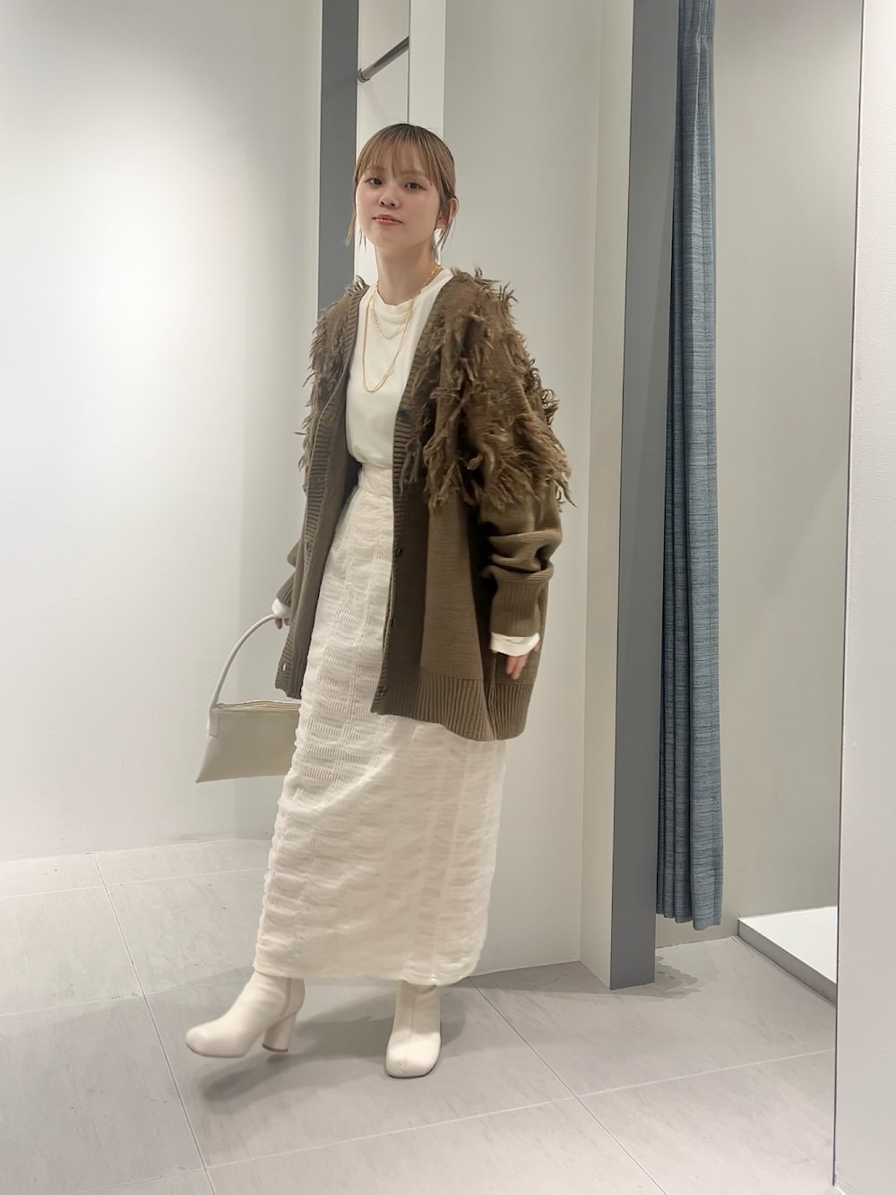 ゆるっとしたカーディガンですが、タイトスカートや小物使いですっきりと女性らしい印象に🪄🪄