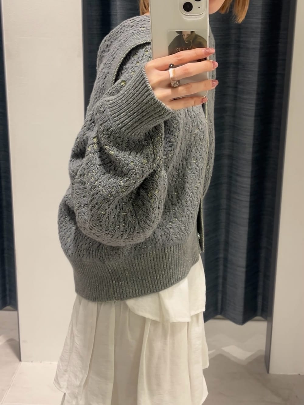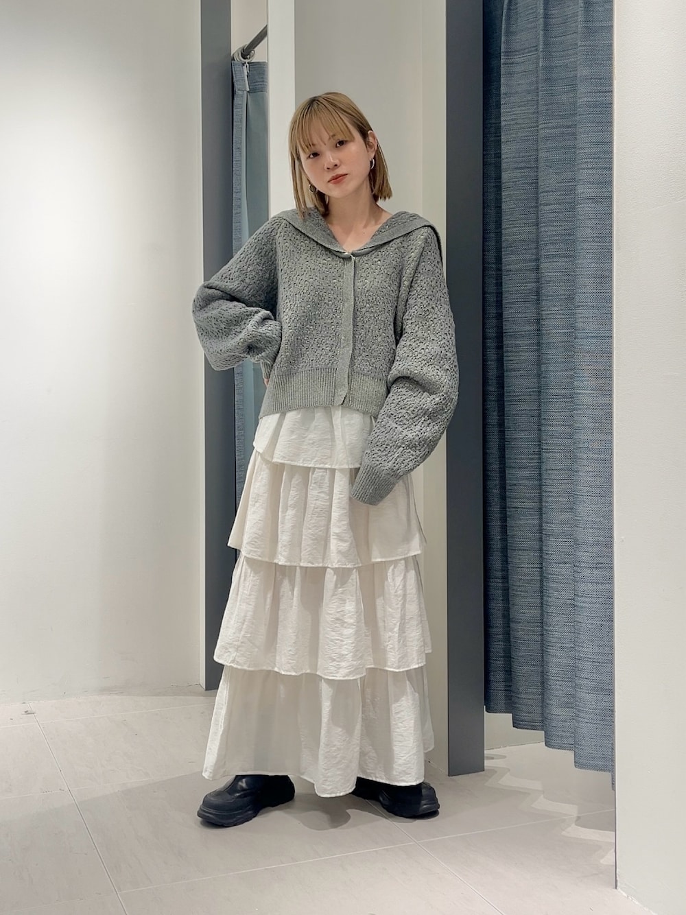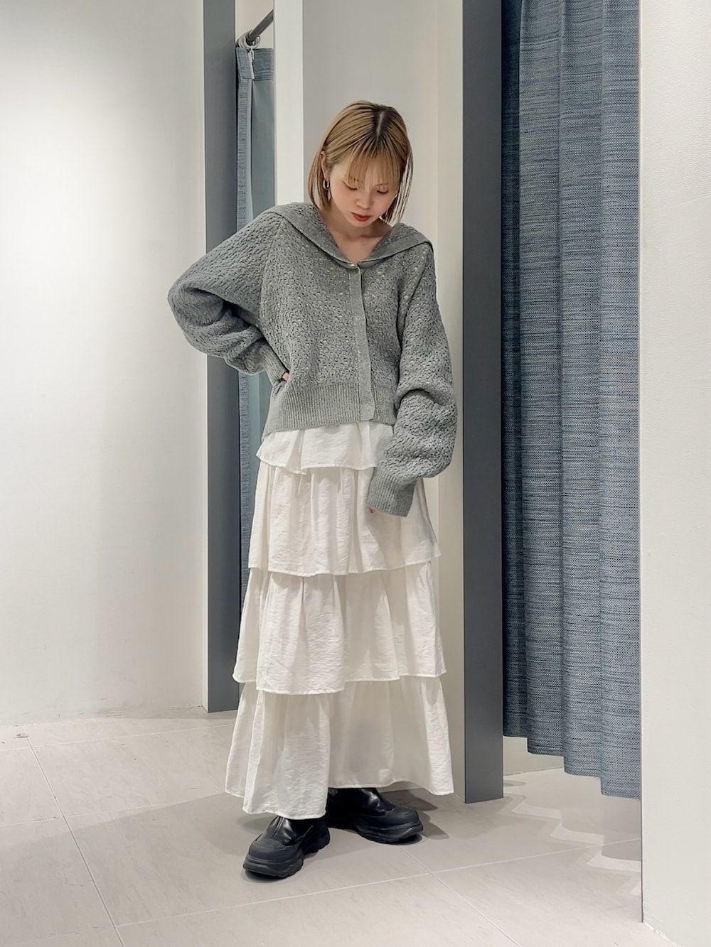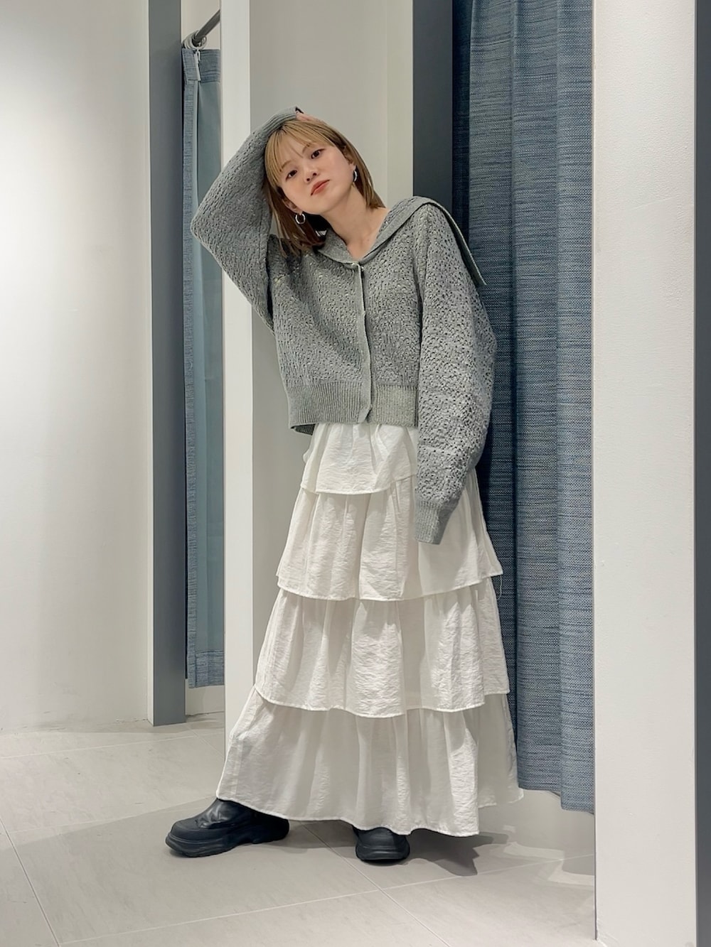 グレーは少しカジュアルな印象になるのでティアードスカートで少し甘めにしてみました◎