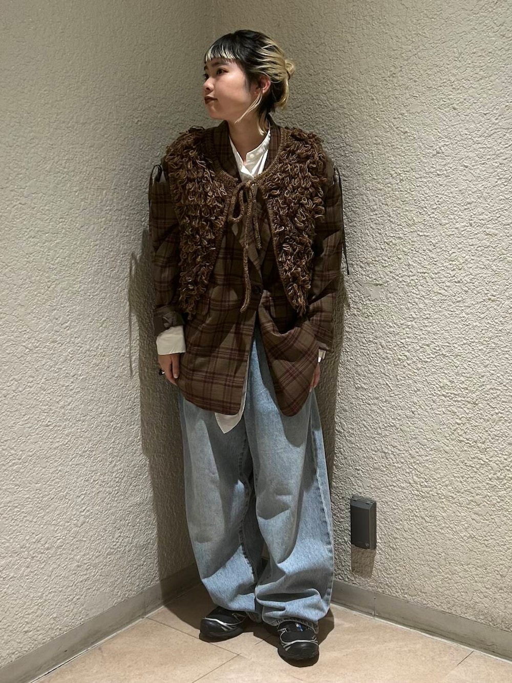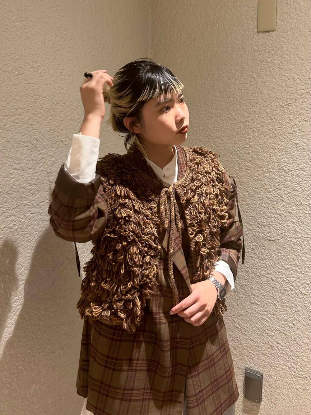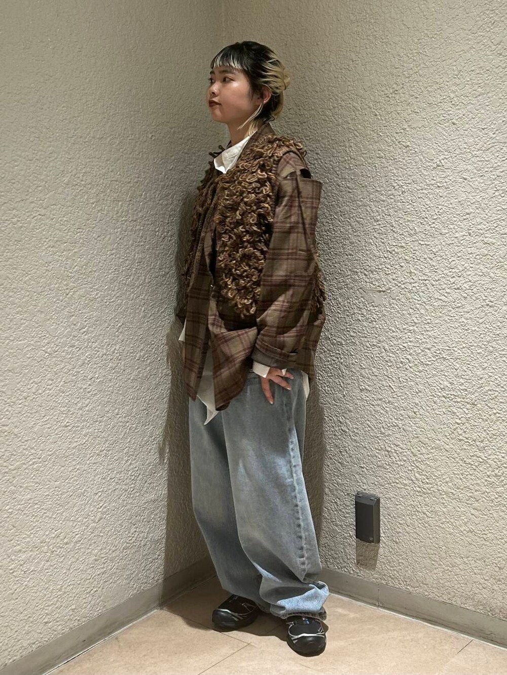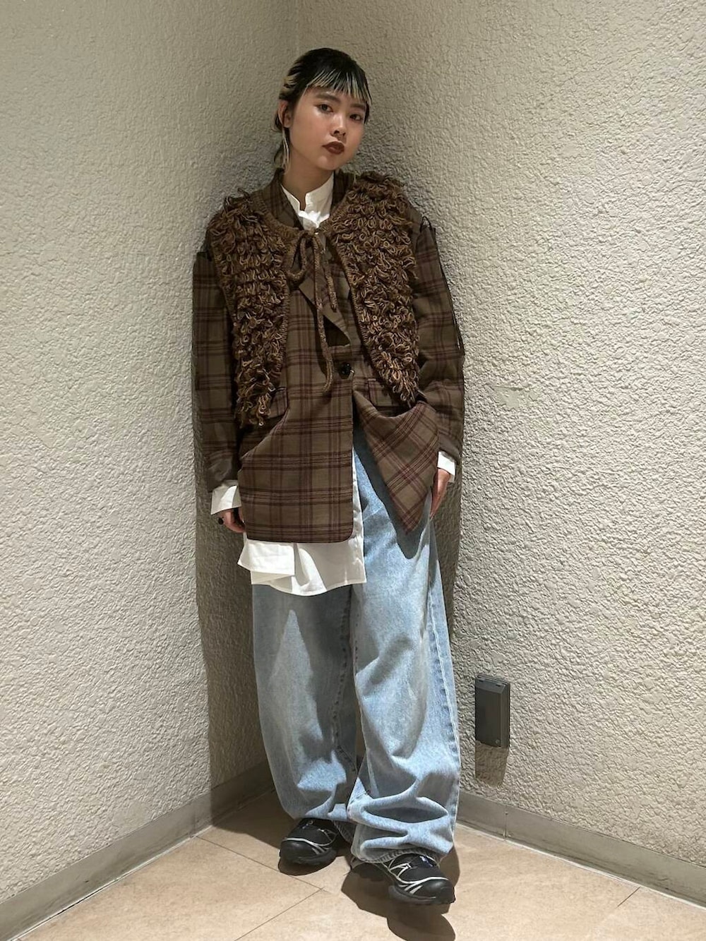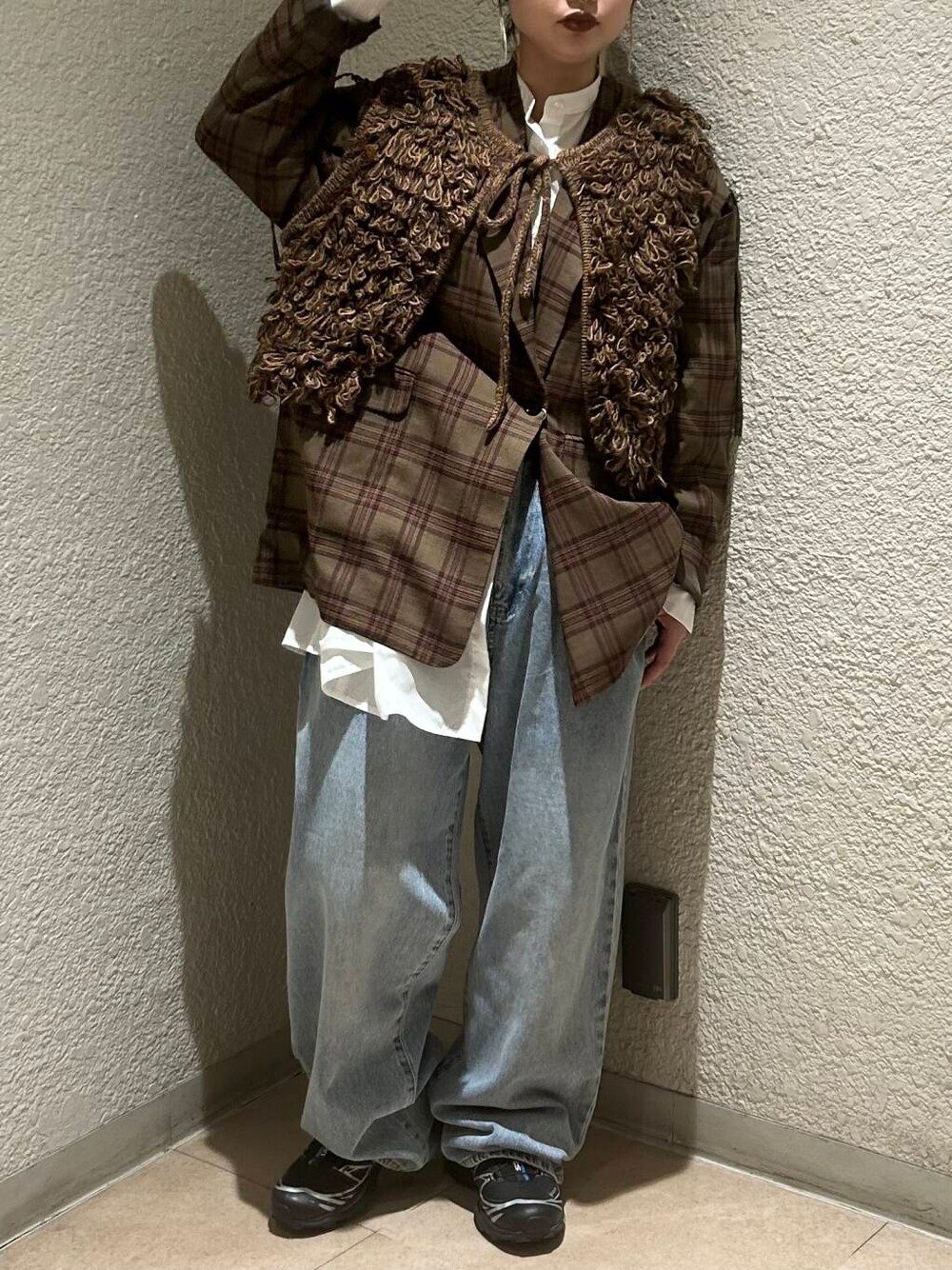 ブラウンのチェックジャケットの上からループベストを羽織り、秋らしさ満載のカラーリングかつ見かけがキャッチーなコーディネートにしてみました🍂