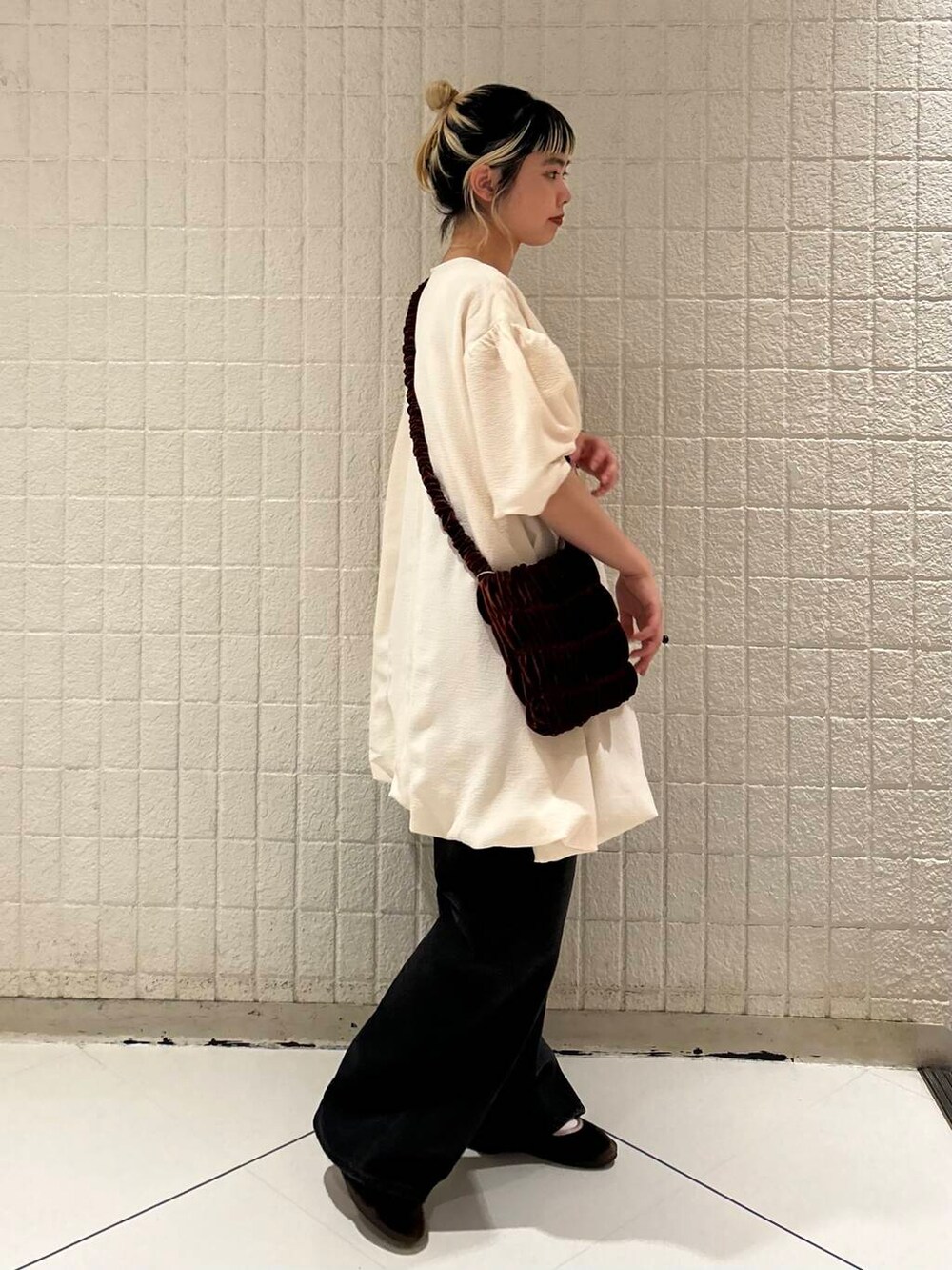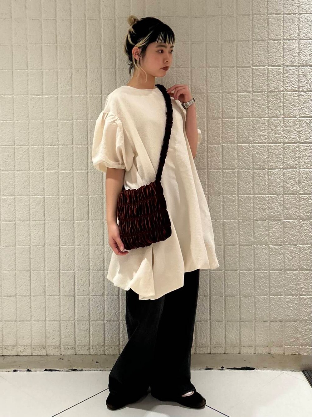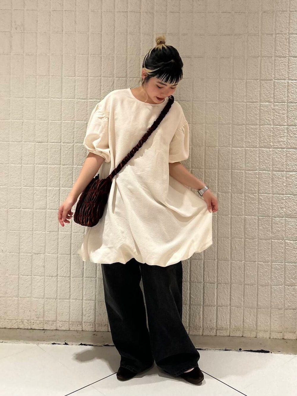 コーディネートの主役となるバルーンミニワンピースは、パフスリーブだけでなく裾にも丸みがあり、甘さを存分に楽しめるアイテムです🍬
