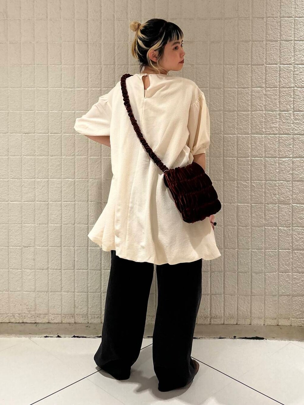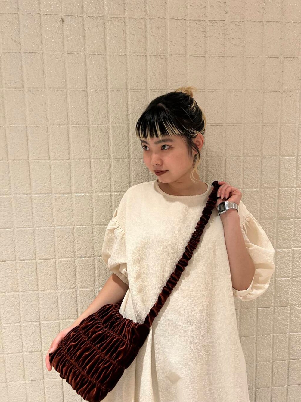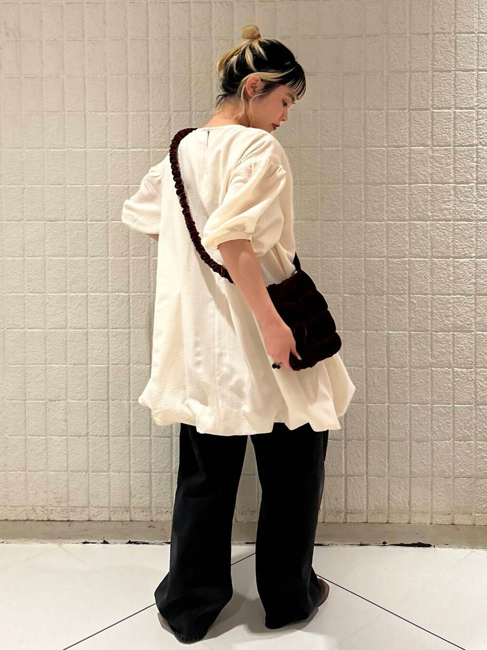 コーディネートの主役となるバルーンミニワンピースは、パフスリーブだけでなく裾にも丸みがあり、甘さを存分に楽しめるアイテムです🍬