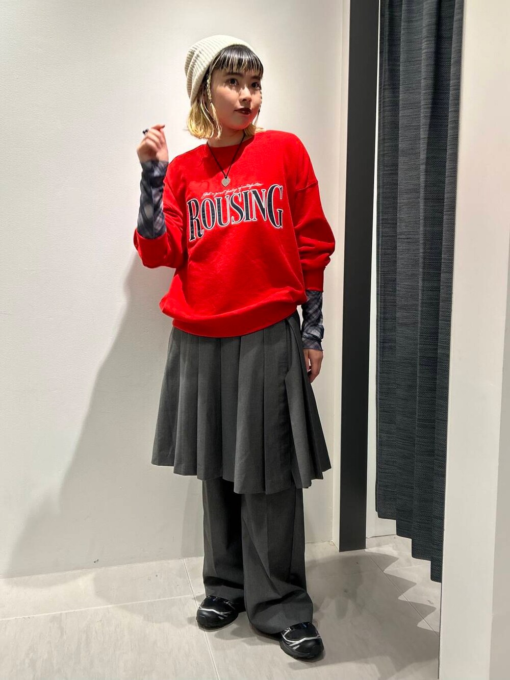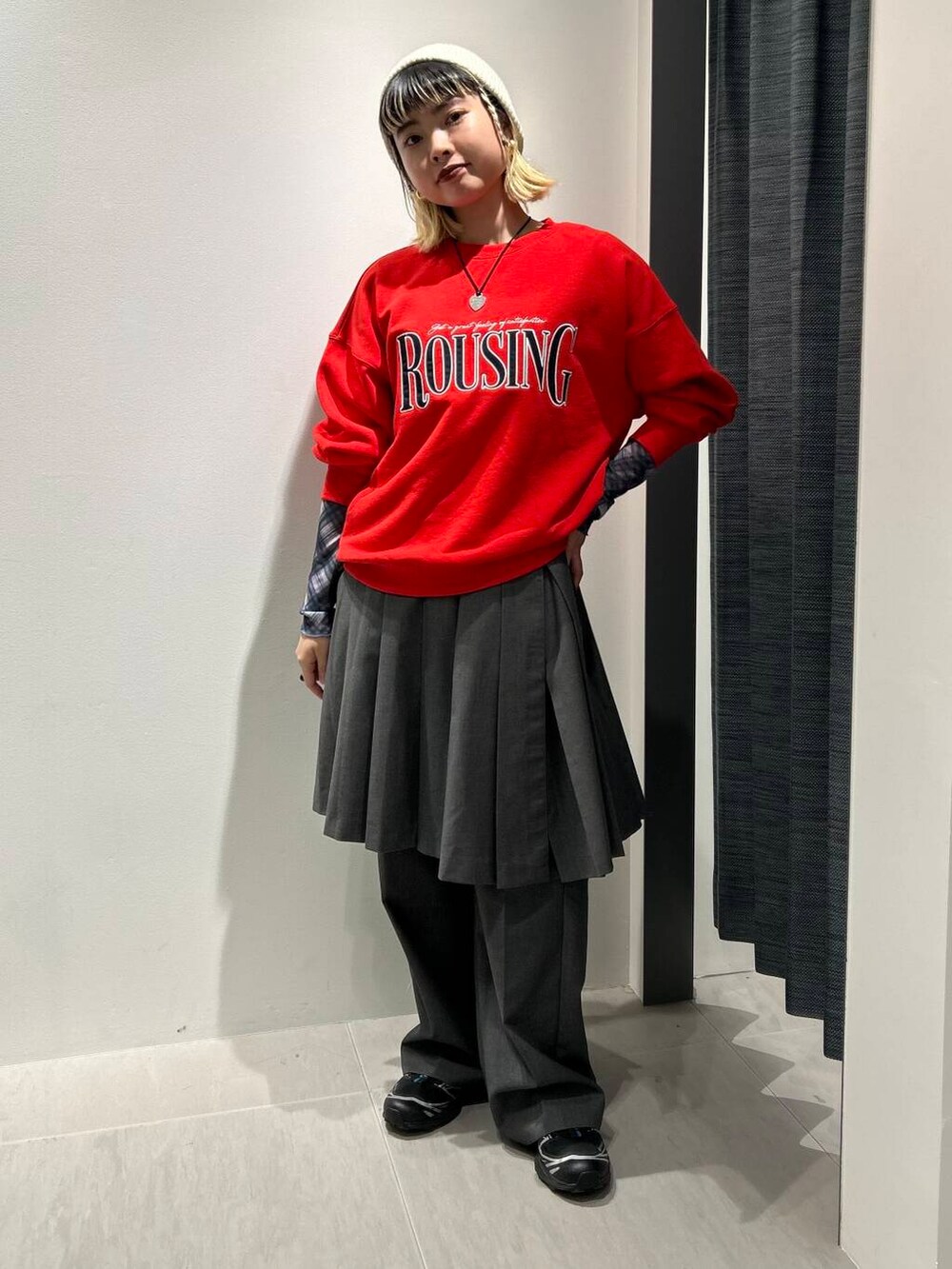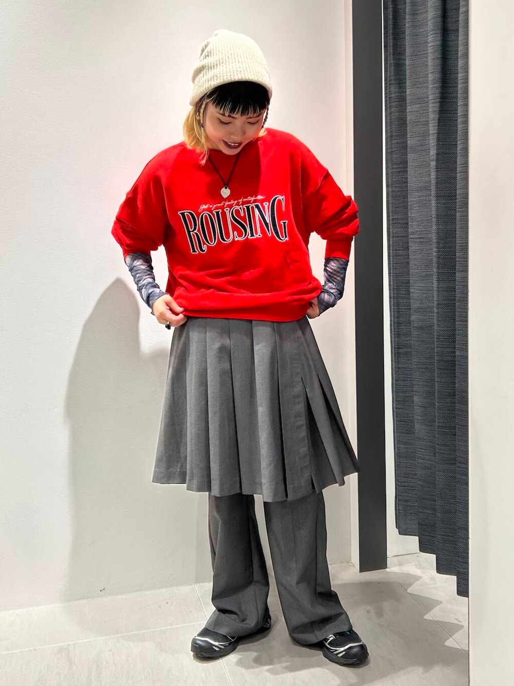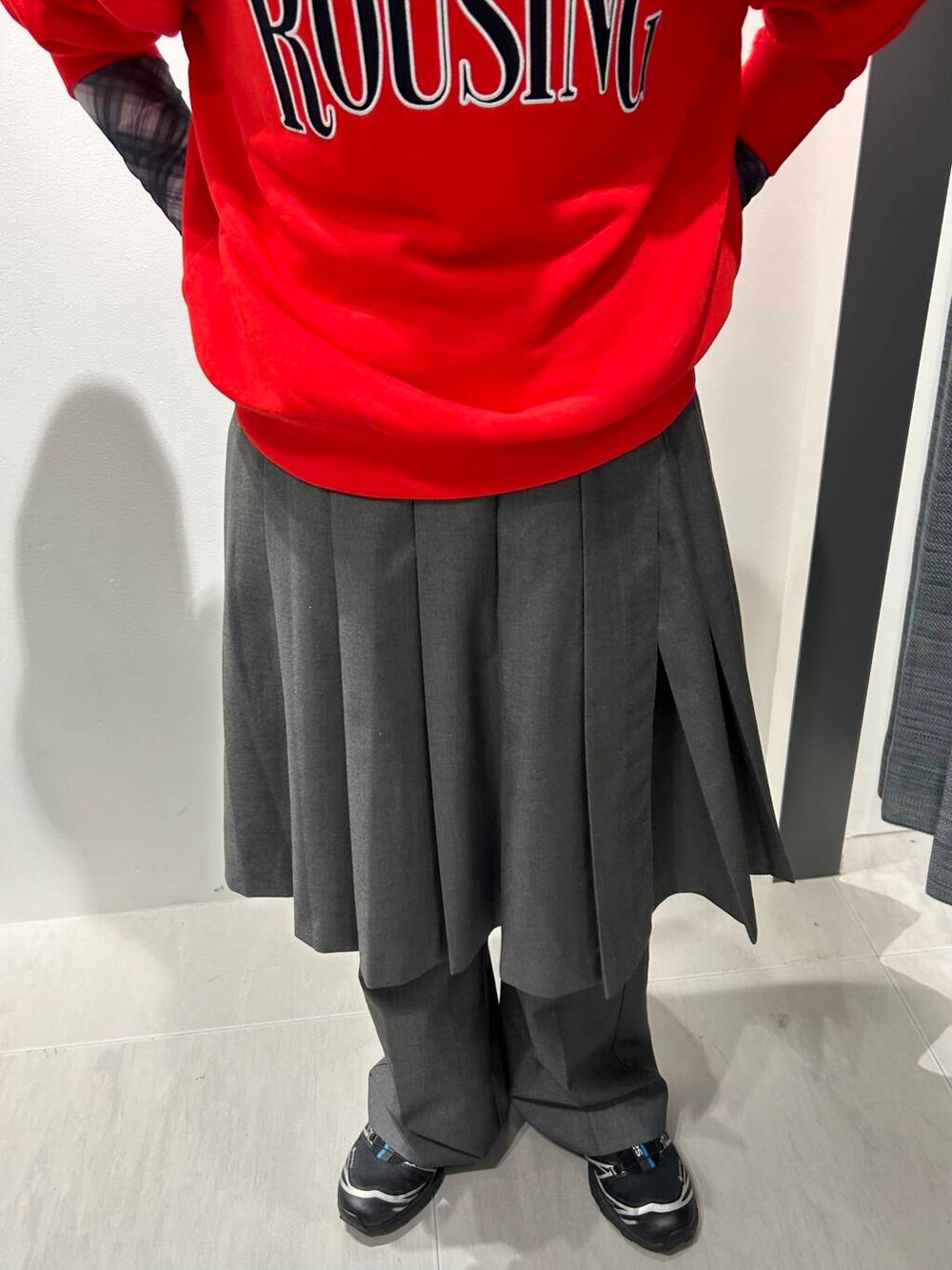 今期特にトレンドとなっている、プリーツスカートとパンツのレイヤードが楽しめるボトムスをスウェットと合わせ、学生風のプレッピーな雰囲気のあるコーディネートを組みました!