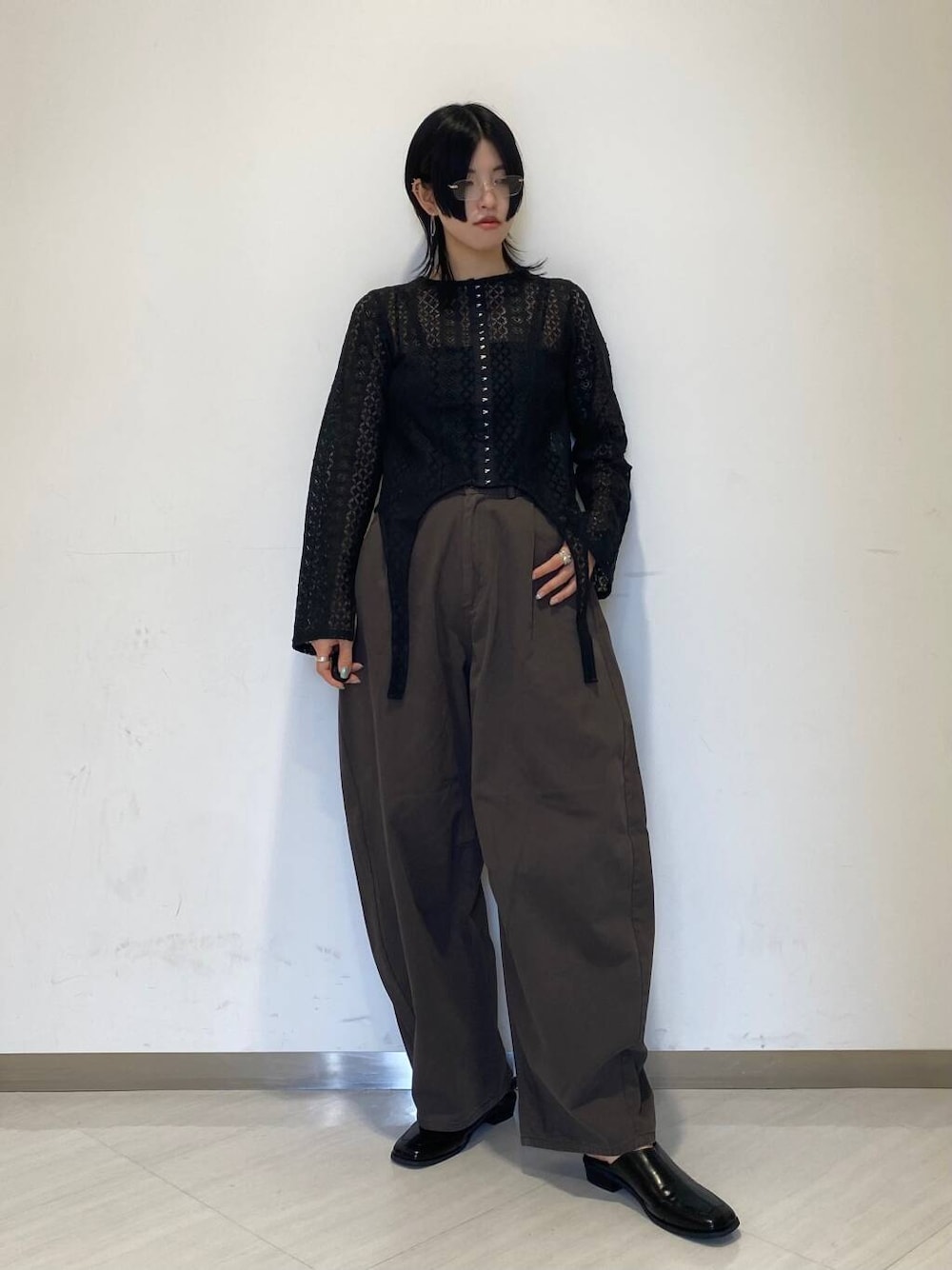 もう少し寒くなってきたらカラーのロンTやタートルネックなどを合わせていただくとレースのデザインがより華やかに見えて素敵に着られます。