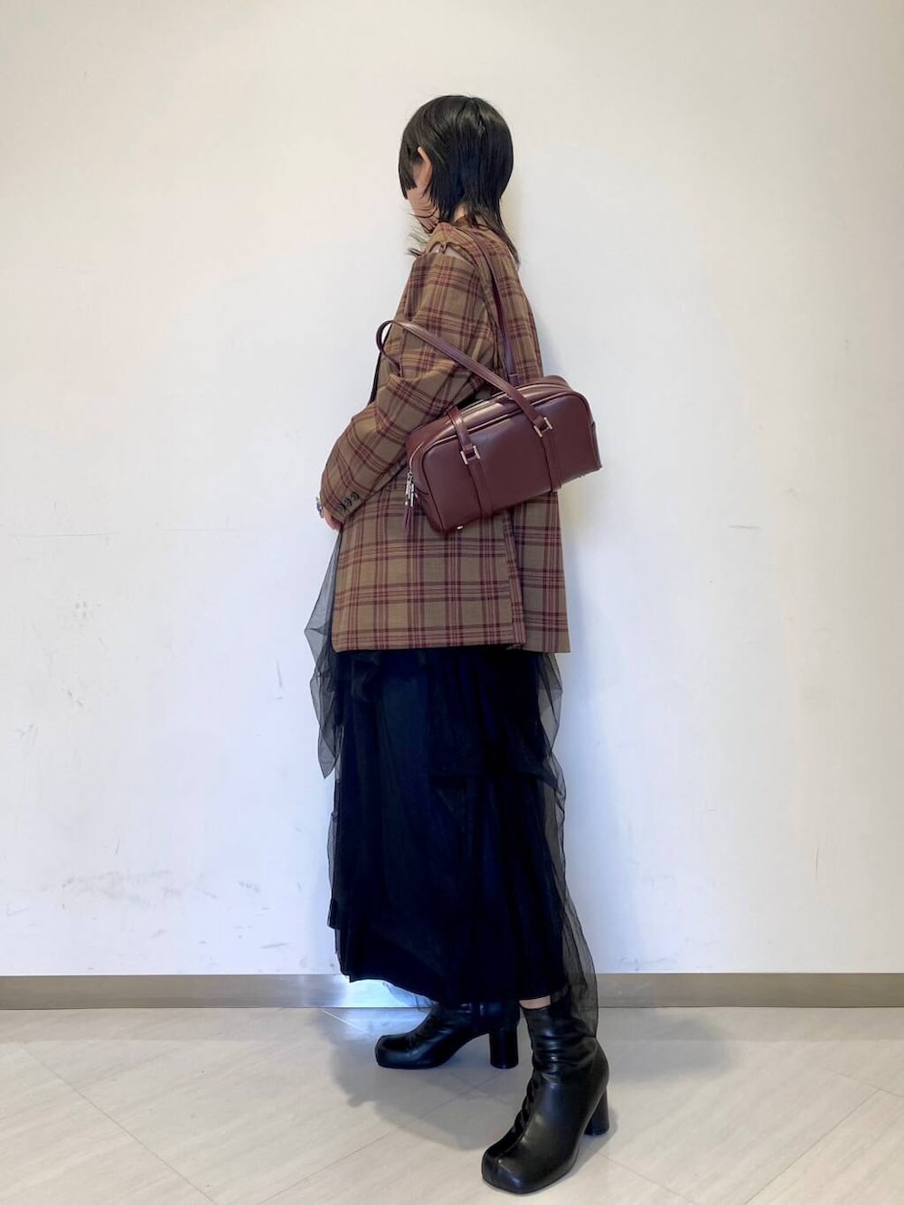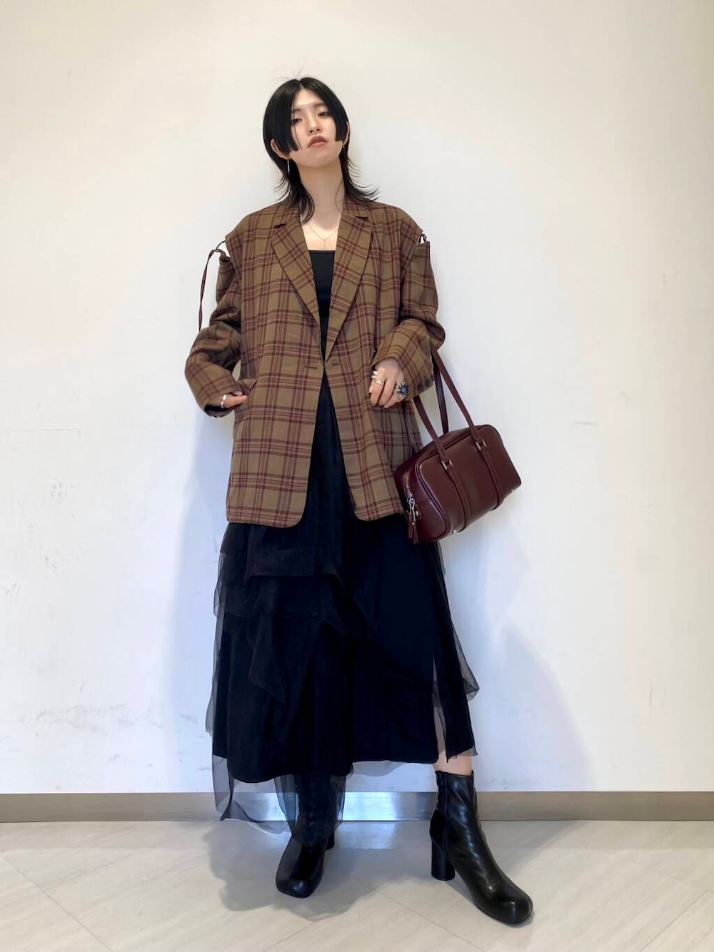 チュールスカートがふんわりかわいいので、他のアイテムをハードめで合わせることで、カッコイイスタイリングになりました。