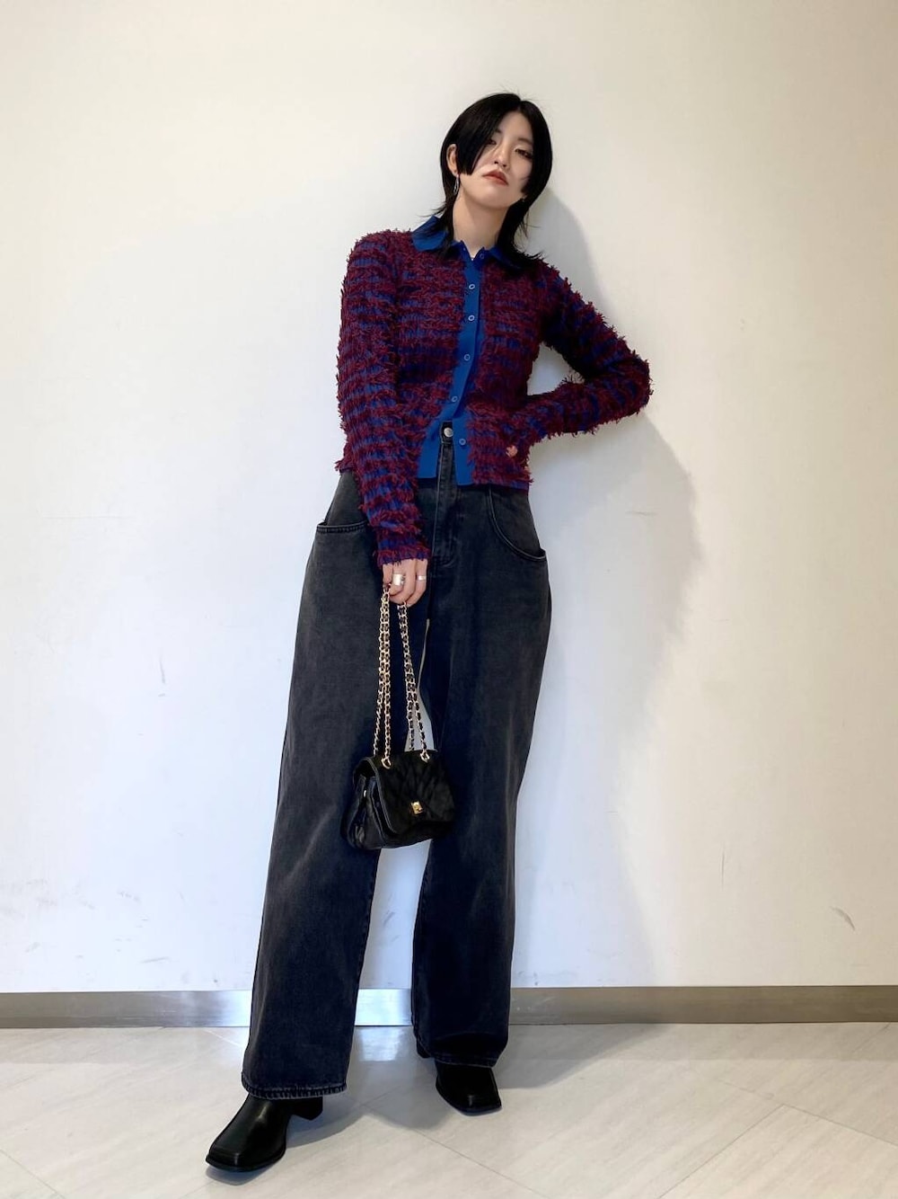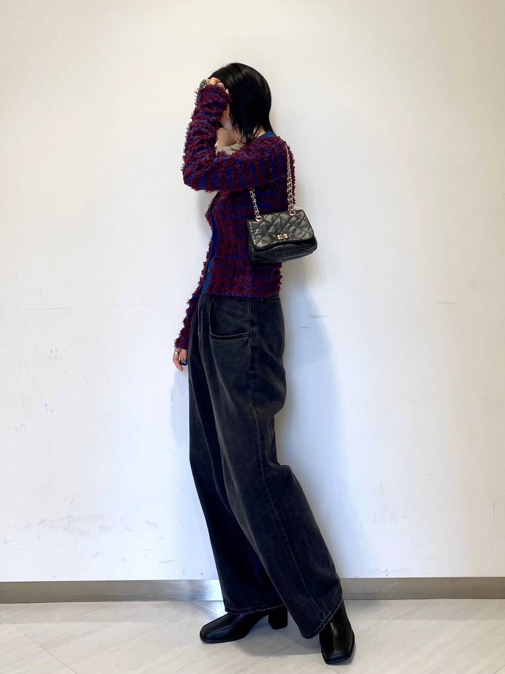 ピタッとしたシルエットなので、ボトムスはゆるっとしたデニムでメリハリあるシルエットにしました。